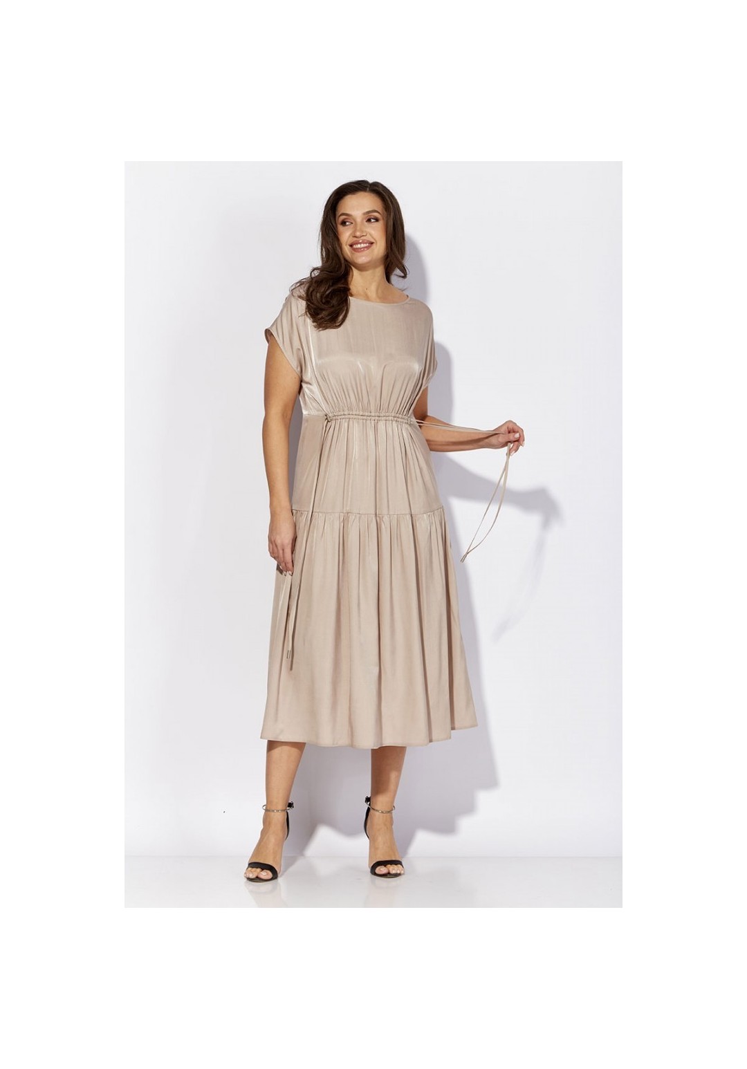 Платье женское, свободного силуэта, расширенное к низу. Рукав короткий, цельнокройный. Горловина круглой формы.По спинке небольшой разрез в средном шве, акцентирован декором монетка Разрез выше линии тали, по переду регулируется с фиксаторами. По центру спинки небольшая сборка. Подрез по линии бедер оформлен присобранным воланом.