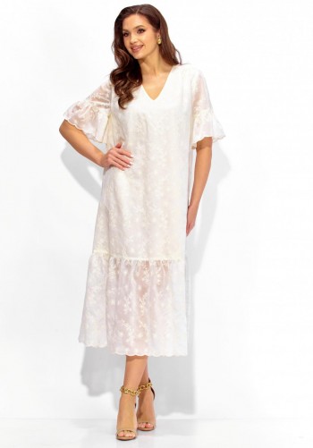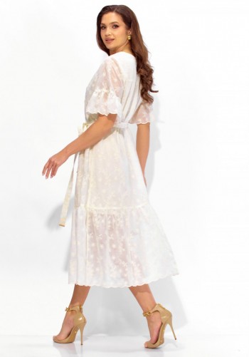 Платье женское, прямого силуэта с рукавом длинной 7/8. Рукав со спущенной линией плеча, по низу манжета с резинкой. Воротник рубашечный, на стойке. Застежка до линии талии, с отрезной планкой на петли и пуговицы. Из под кокеток переда и спинки-сборка. По боку платья, шлица. Линию талии подчеркивает съемный пояс с полукольцами.