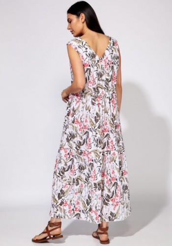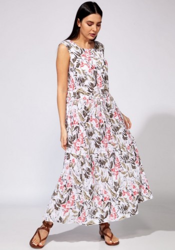 Платье женское, чуть А-силуэта, с втачным рукавом, длинной 7/8. По центу переда объемные , фигурные рельефы. Горловина оформлена небольшой мягкой стойкой. Декором служат съемные цветки-броши. По низу платья отделочная нашивка. Спинка со средним швом. Платье изготовлено из трикотажного полотна тенсел.