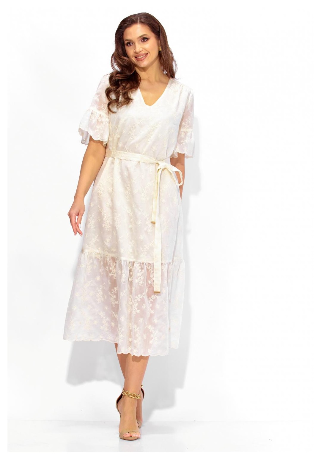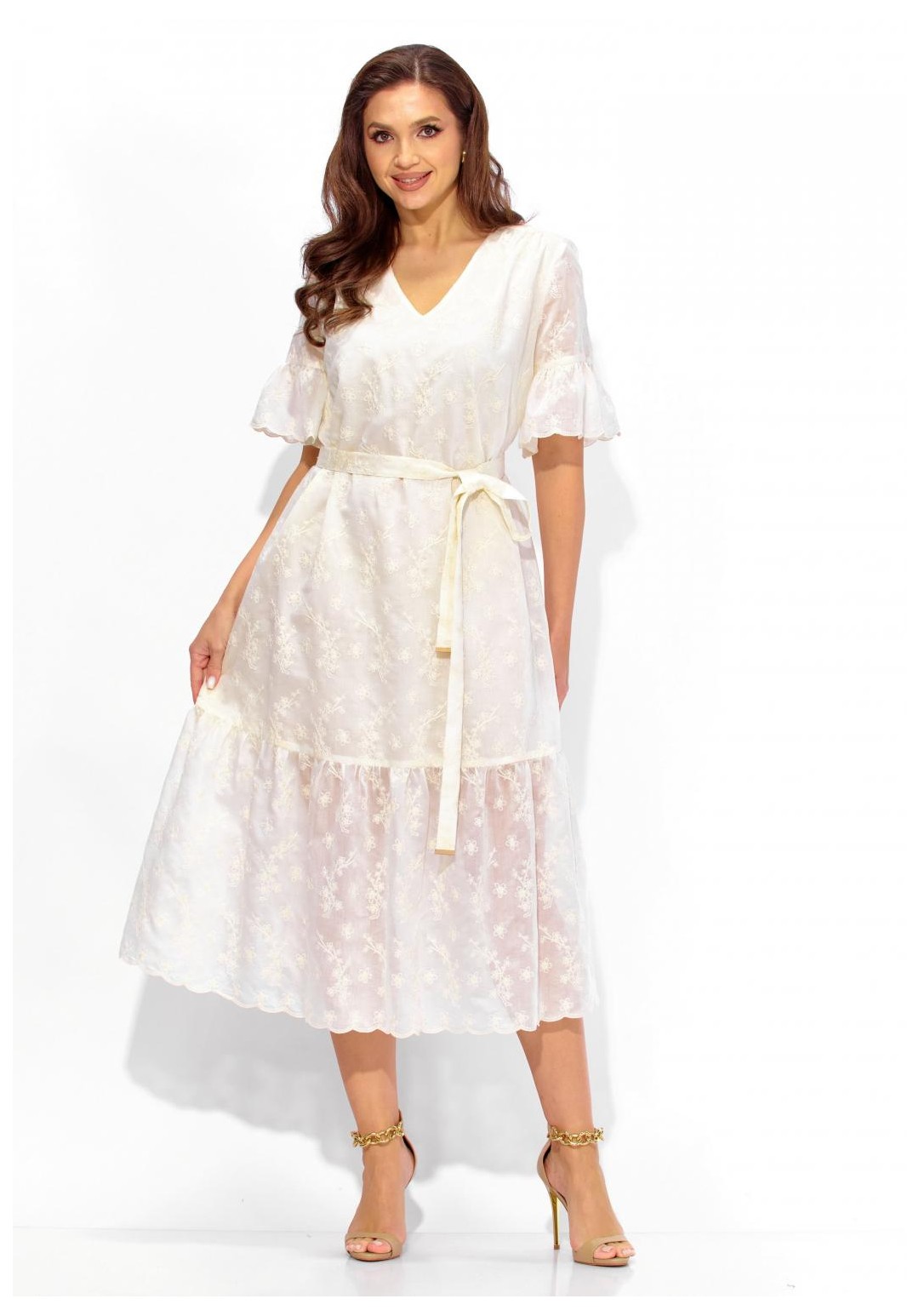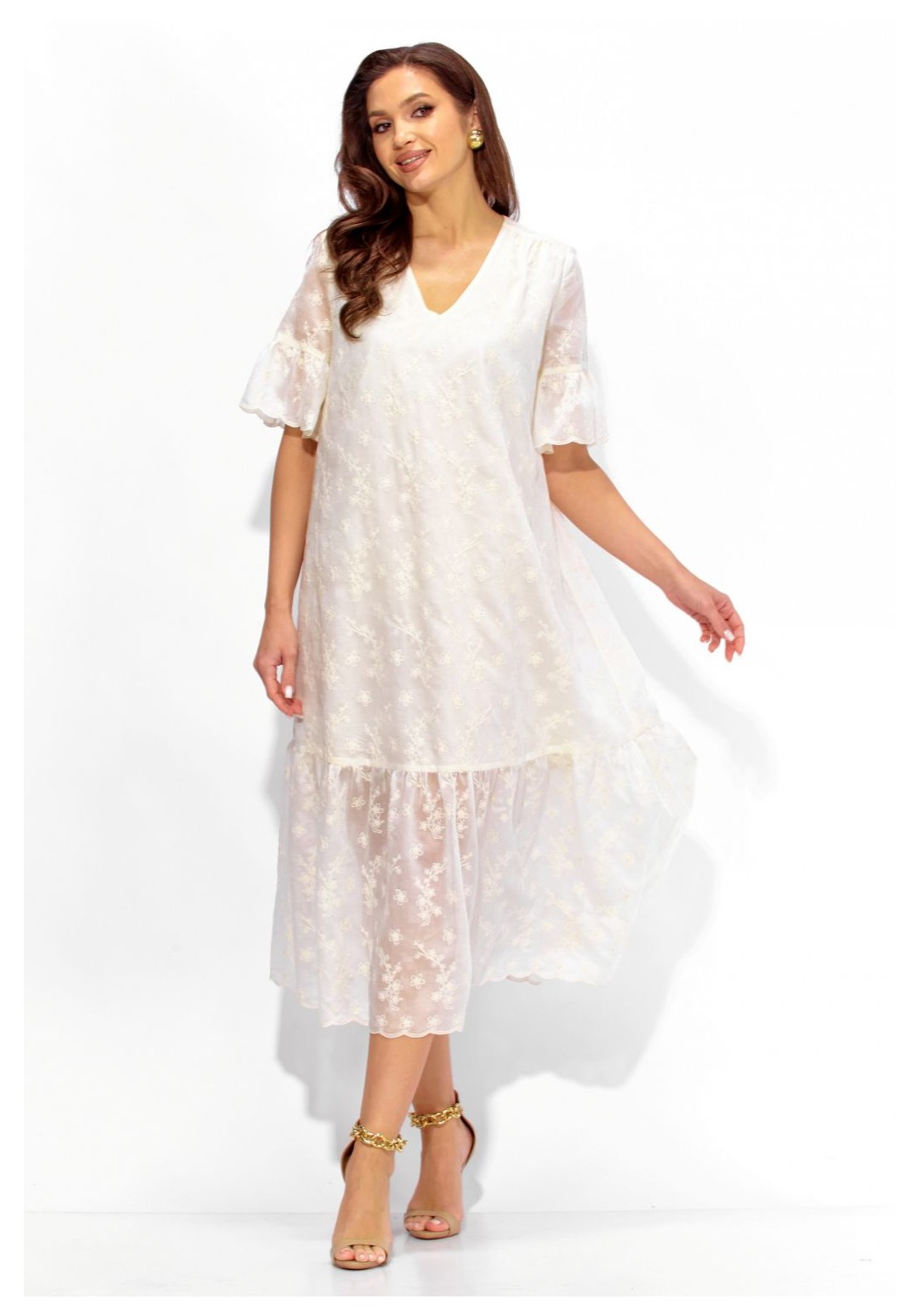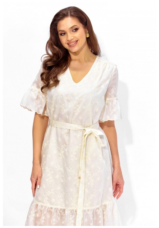 Платье женское, А-образного силуэта, расширенное к низу, с присобранным воланом по низу. Выполнено из кружевной ткани, на хлопковой подкладке. Рукав втачной, длинной до локтя с присобранным воланом по низу. Вырез горловины У-образной формы. По переду кокетка, переходящая на спинку. Сборка из под кокеток по переду, по спинке по центру кокетки. Дополнением служит съемный, мягкий пояс, с металическими зажмами на концах.