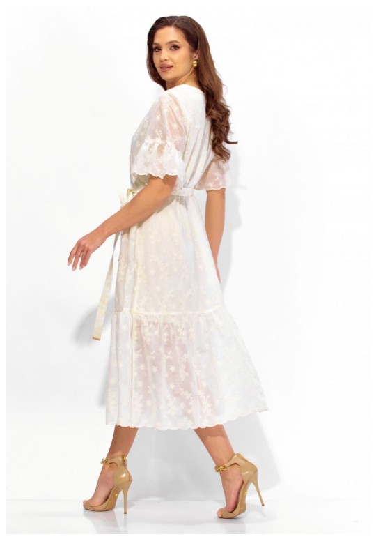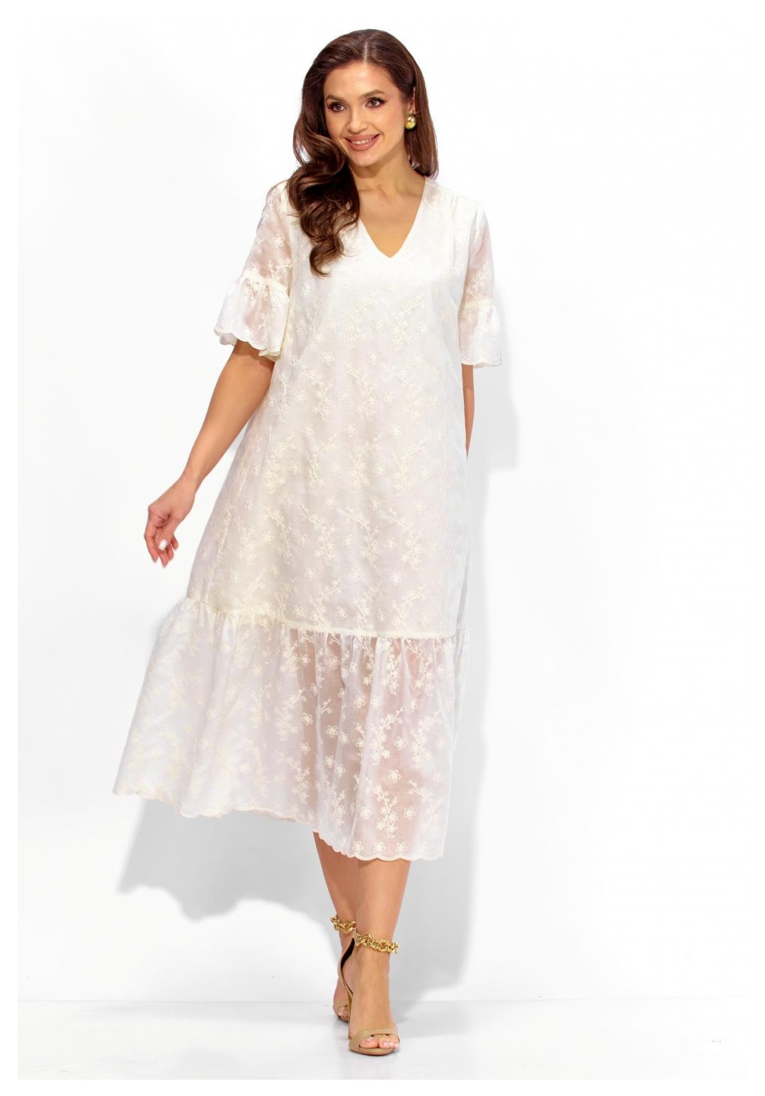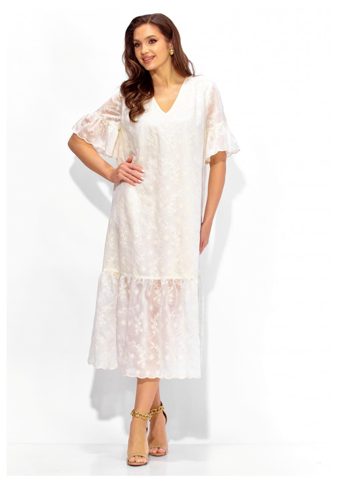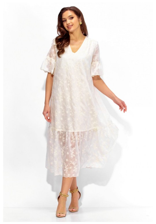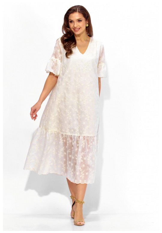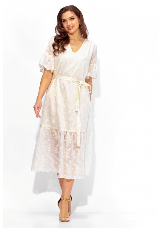 Платье женское, А-образного силуэта, расширенное к низу, с присобранным воланом по низу. Выполнено из кружевной ткани, на хлопковой подкладке. Рукав втачной, длинной до локтя с присобранным воланом по низу. Вырез горловины У-образной формы. По переду кокетка, переходящая на спинку. Сборка из под кокеток по переду, по спинке по центру кокетки. Дополнением служит съемный, мягкий пояс, с металическими зажмами на концах.