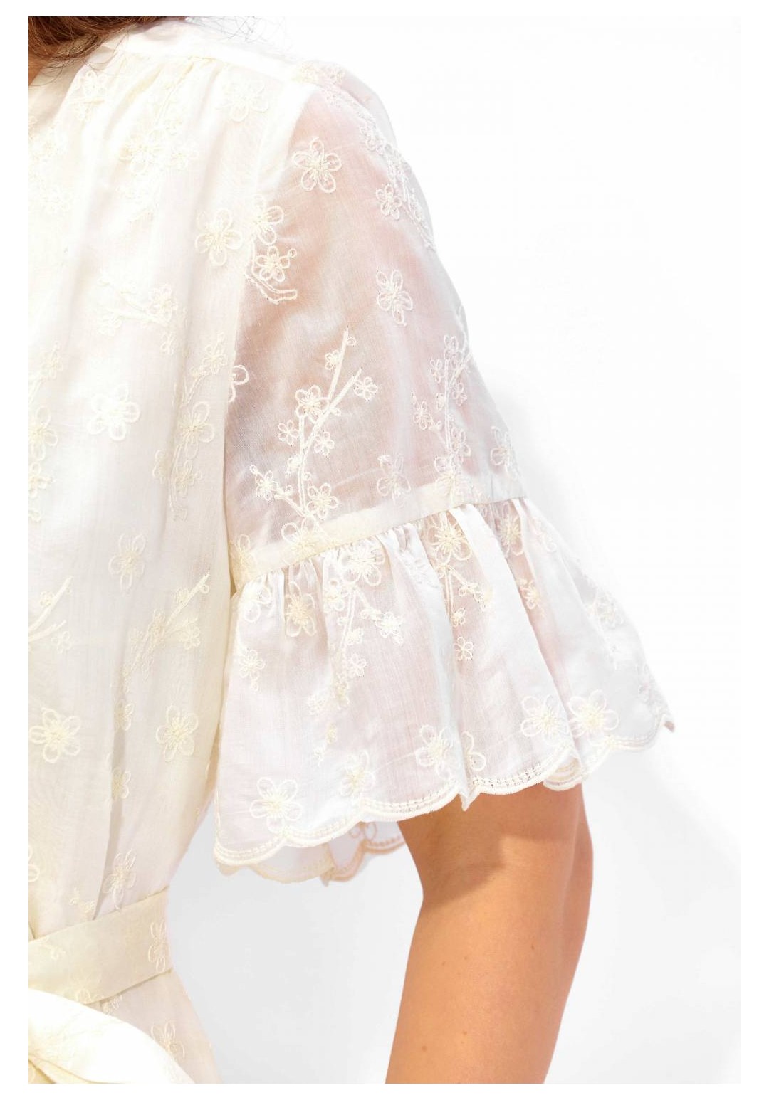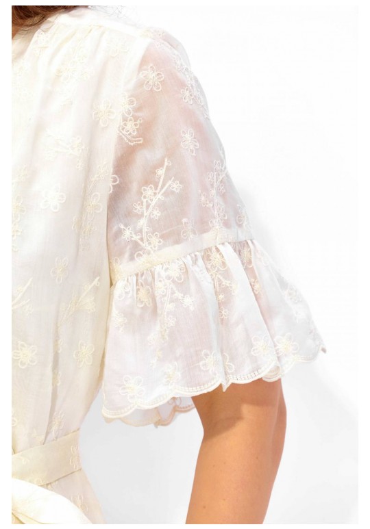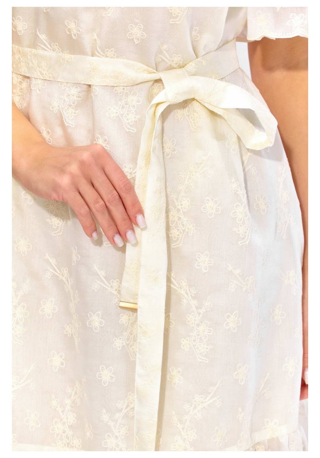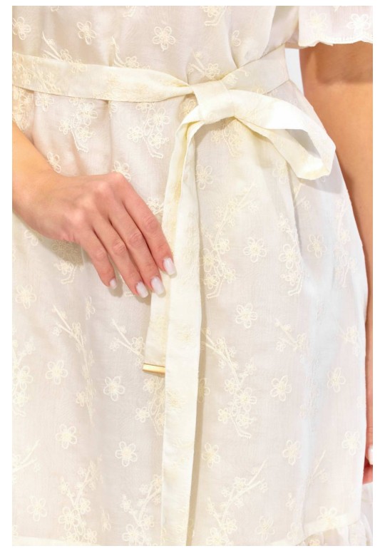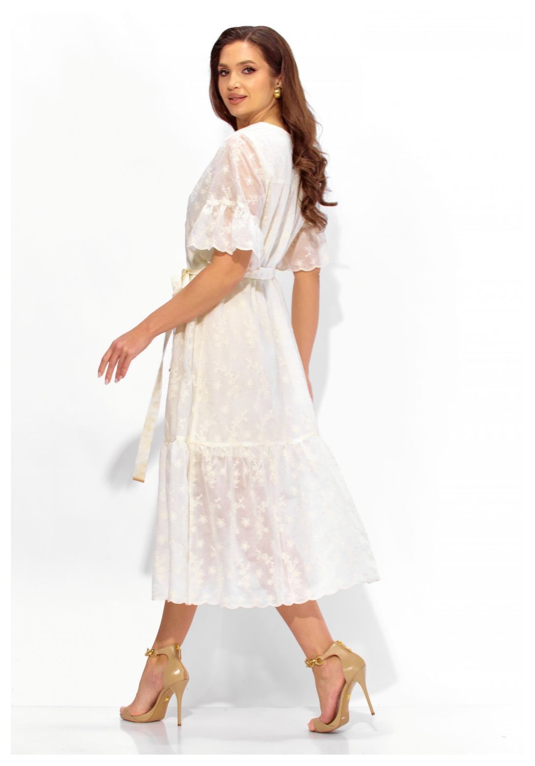 Платье женское, А-образного силуэта, расширенное к низу, с присобранным воланом по низу. Выполнено из кружевной ткани, на хлопковой подкладке. Рукав втачной, длинной до локтя с присобранным воланом по низу. Вырез горловины У-образной формы. По переду кокетка, переходящая на спинку. Сборка из под кокеток по переду, по спинке по центру кокетки. Дополнением служит съемный, мягкий пояс, с металическими зажмами на концах.