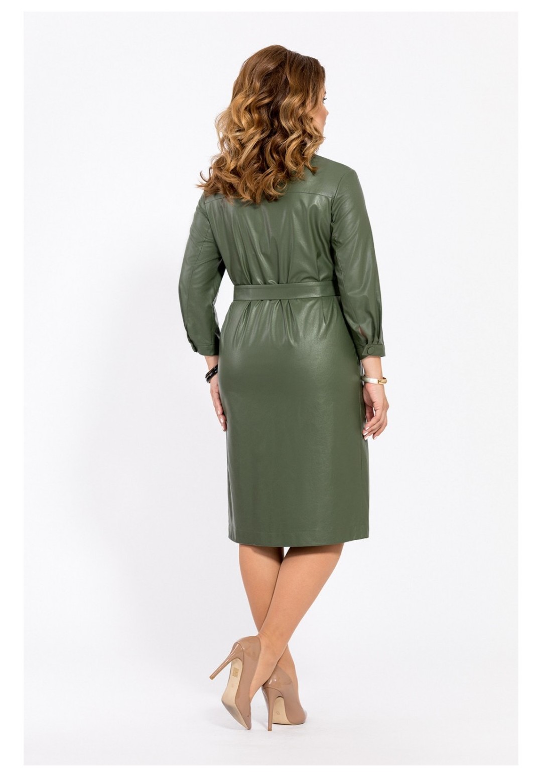 Модное кожаное платье-рубашка прямого силуэта. Рукав втачной длиной 5/6 на манжете. Рубашечный воротник, накладные карманы по бедрам, застежка до низа на пуговицы, по спинке небольшая кокетка.
