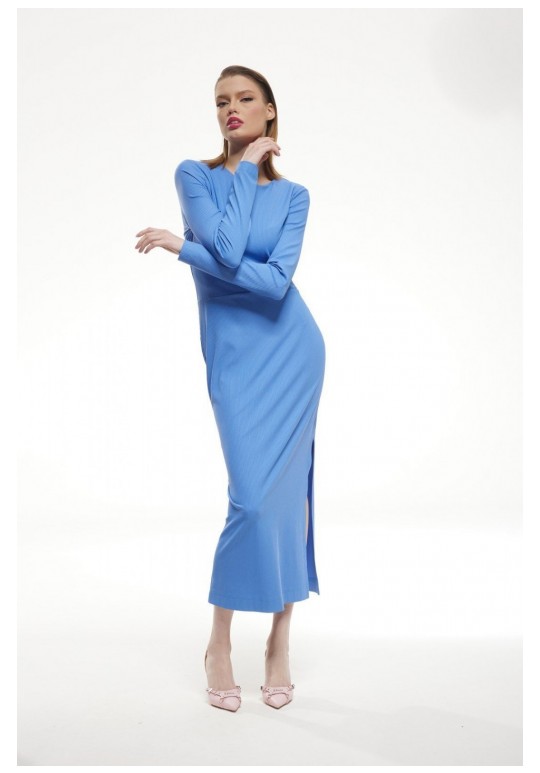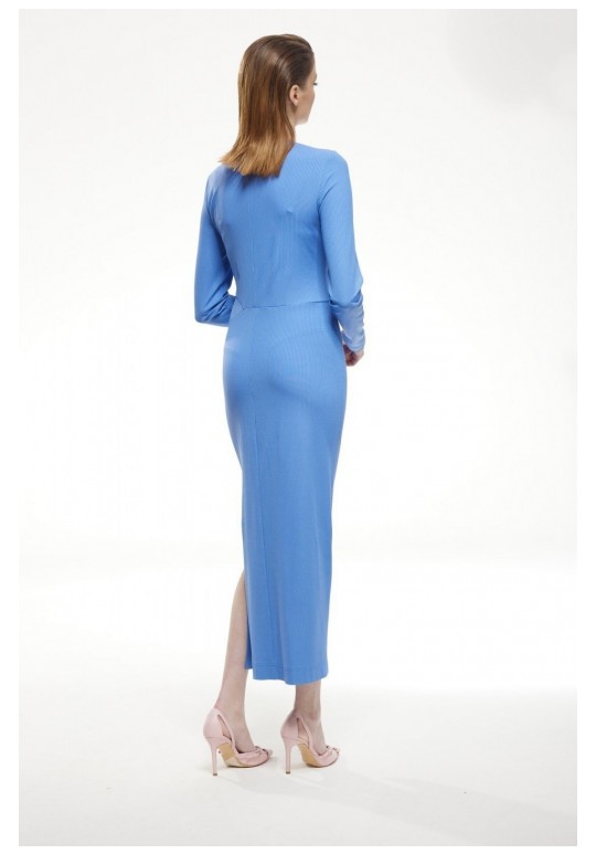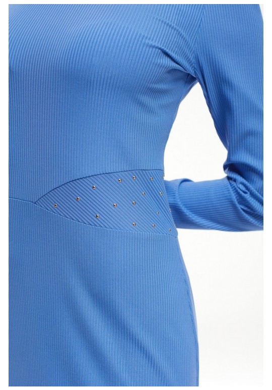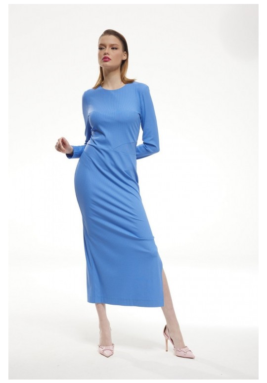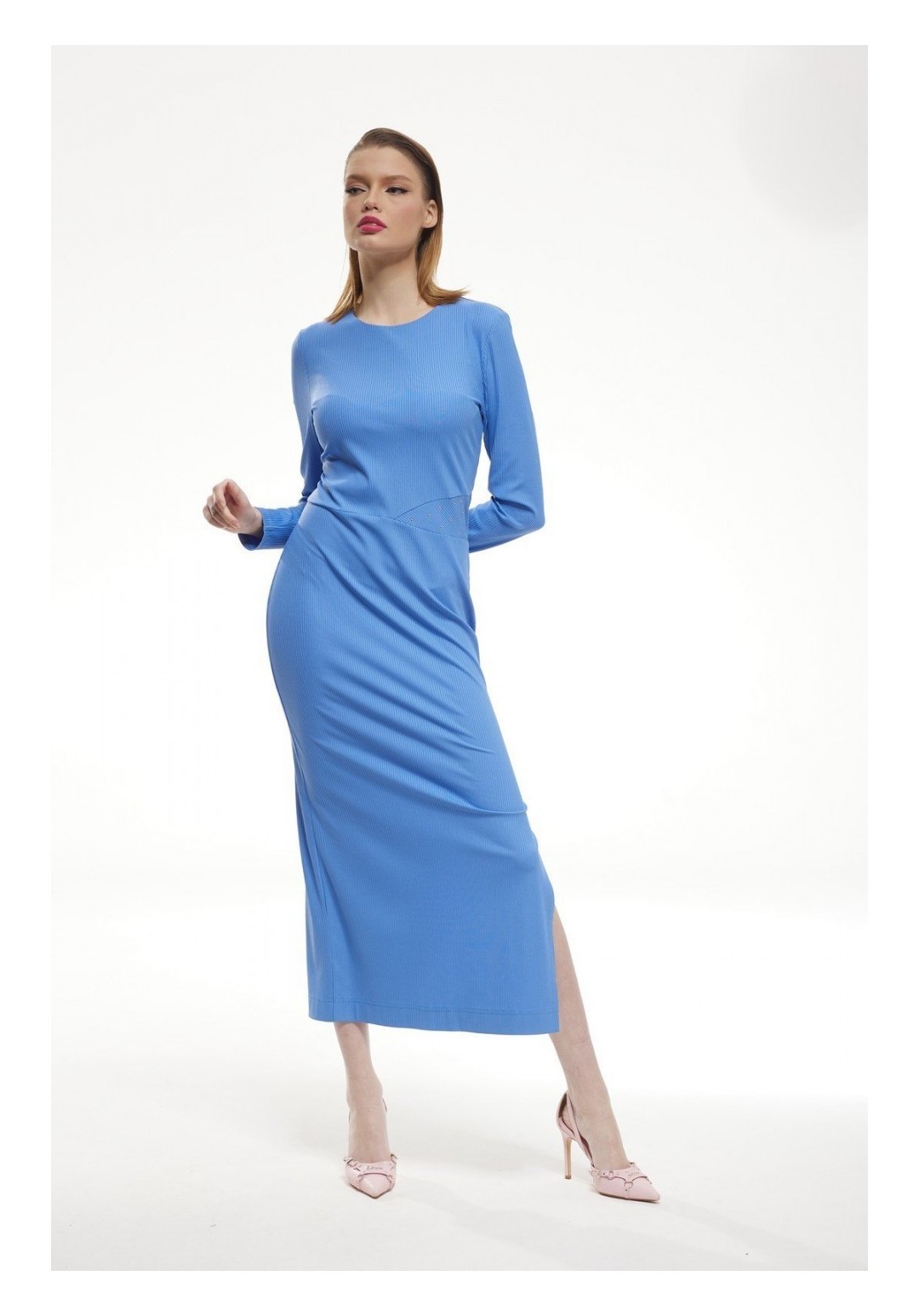 Платье, облегающее из трикотажного полотна. Длина миди. Горловина круглая. Застежка по спинке на петлю и пуговицу. Рукава длинные узкие. По линии талии вставка с декором. Длина рукава 54 см.