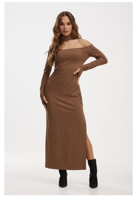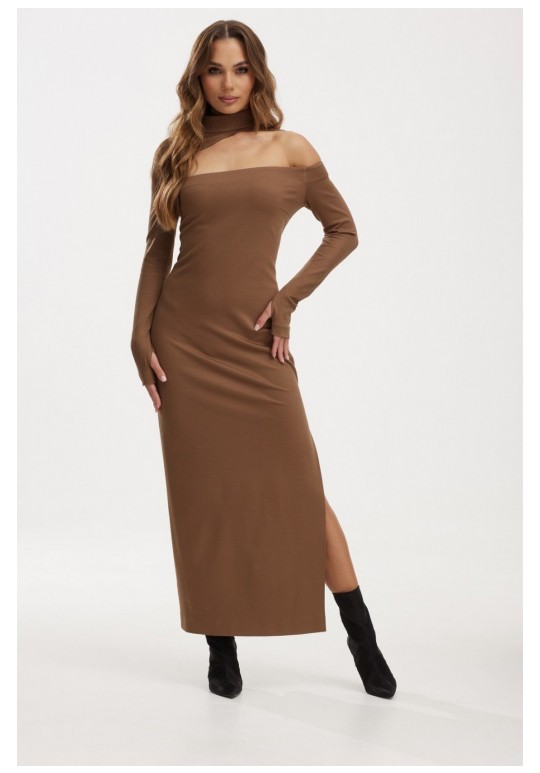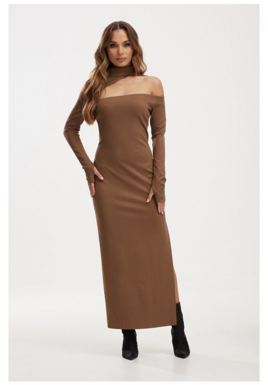 Элегантное платье прямого силуэта, выполнено из высококачественного трикотажного полотна цвета капучино. Дизайн платья включает изысканный воротник-стойку и асимметричный вырез, который эффектно обнажает одно плечо, добавляя образу нотку смелости. Длинные рукава с оригинальным решением - отверстием для большого пальца, подчеркивают спортивный стиль этой модели. В задней части платья предусмотрена незаметная потайная молния. Слева расположен глубокий разрез на 58 см, который добавляет изделию изящества и практичности, обеспечивая большую свободу движений. Длина рукава составляет 65 см, что идеально подойдёт для холодного времени года. Это платье - идеальный выбор для создания стильного и одновременно комфортного образа.