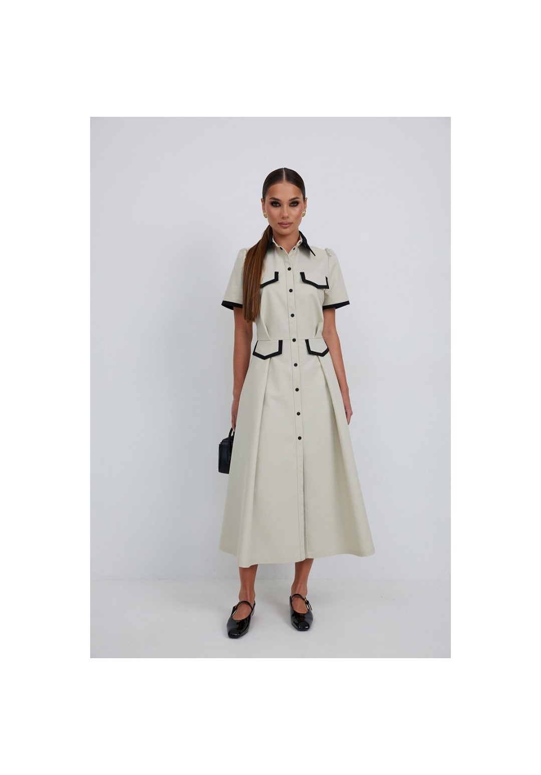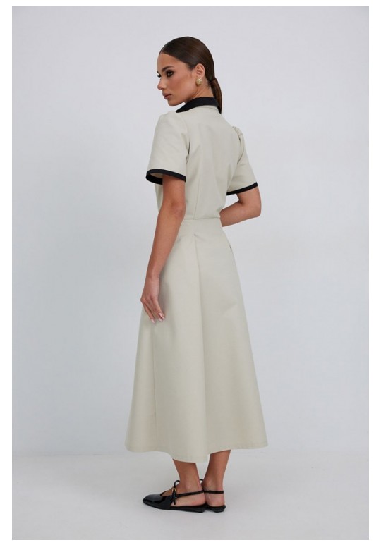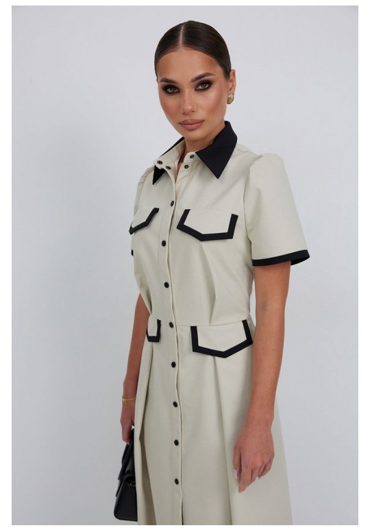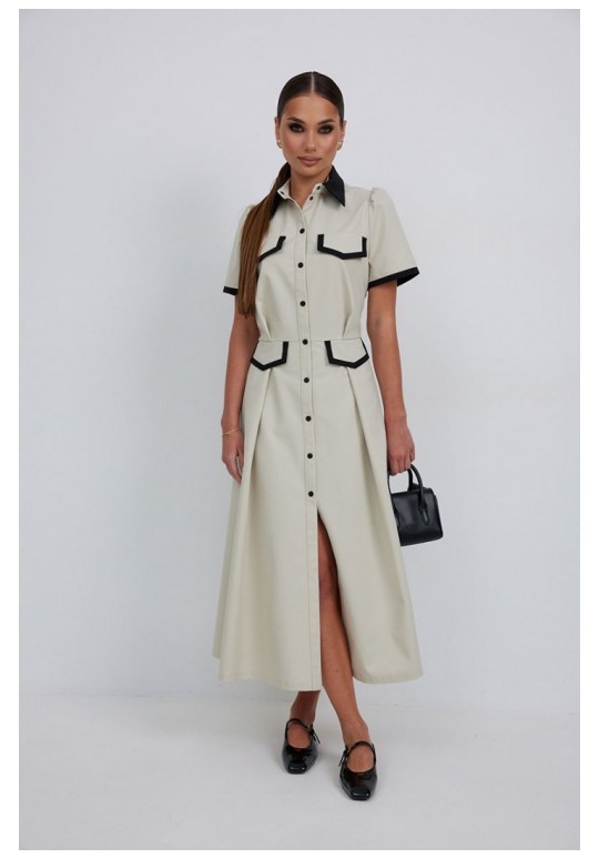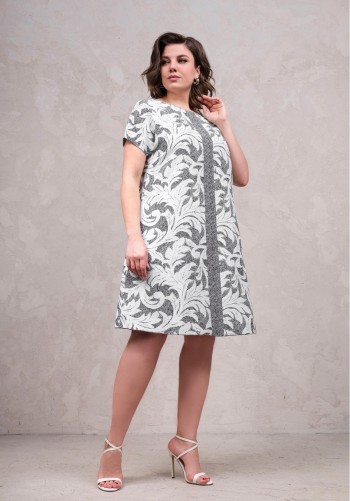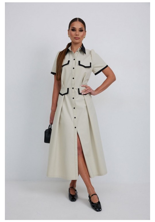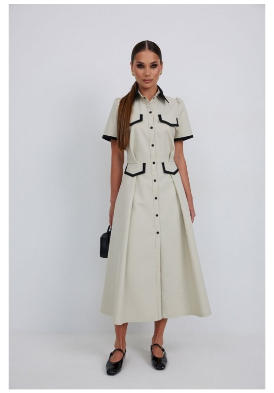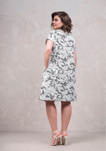Платье из тонкой джинсовой ткани полуприлегающего силуэта длины миди расширенное к низу. По талии подрез, нижняя часть платья с карманами в боковых швах и встречными складками по талии. По переду планка с застежкой на петли и пуговицы. Верх переда и линия подреза с клапанами. Воротник на стойке. Рукав втачной короткий. Край клапанов, низ рукавов и воротник из отделочной ткани. Длина рукава 25 см. 44 р-р: ОГ - 98 см., ОТ - 80 см., ОБ - 108 см. 46 р-р: ОГ - 102 см., ОТ - 84 см., ОБ - 112 см. 48 р-р: ОГ - 106 см., ОТ - 88 см., ОБ - 116 см. 50 р-р: ОГ - 110 см., ОТ - 92 см., ОБ - 120 см. 52 р-р: ОГ - 114 см., ОТ - 96 см., ОБ - 124 см.