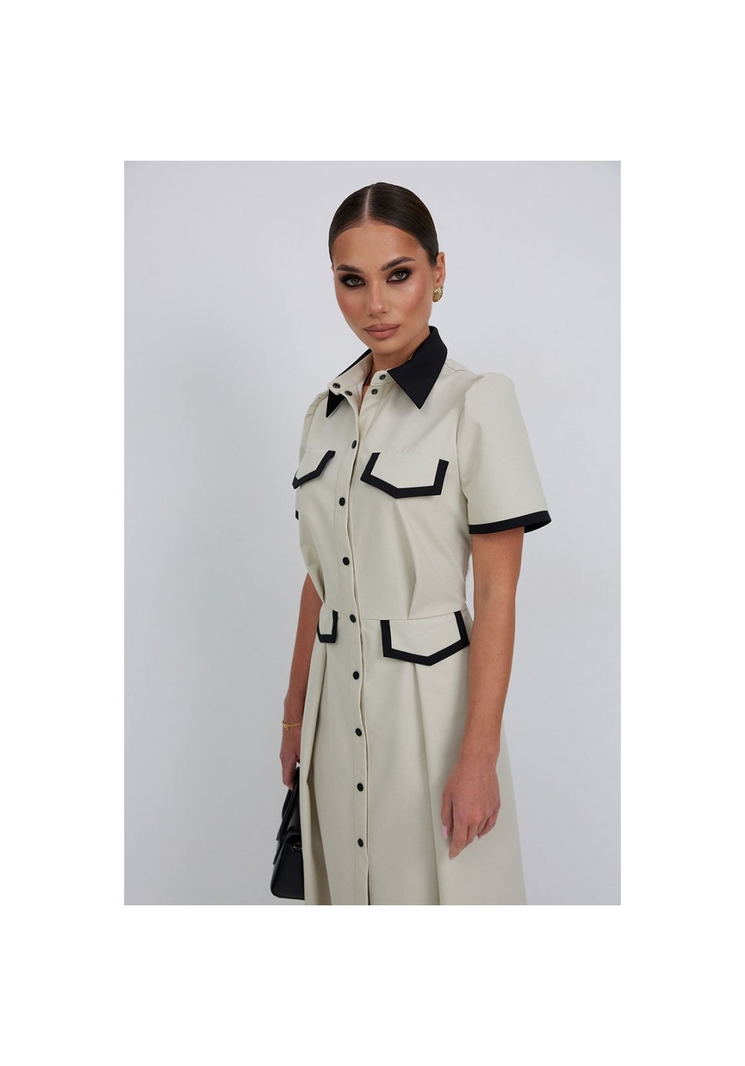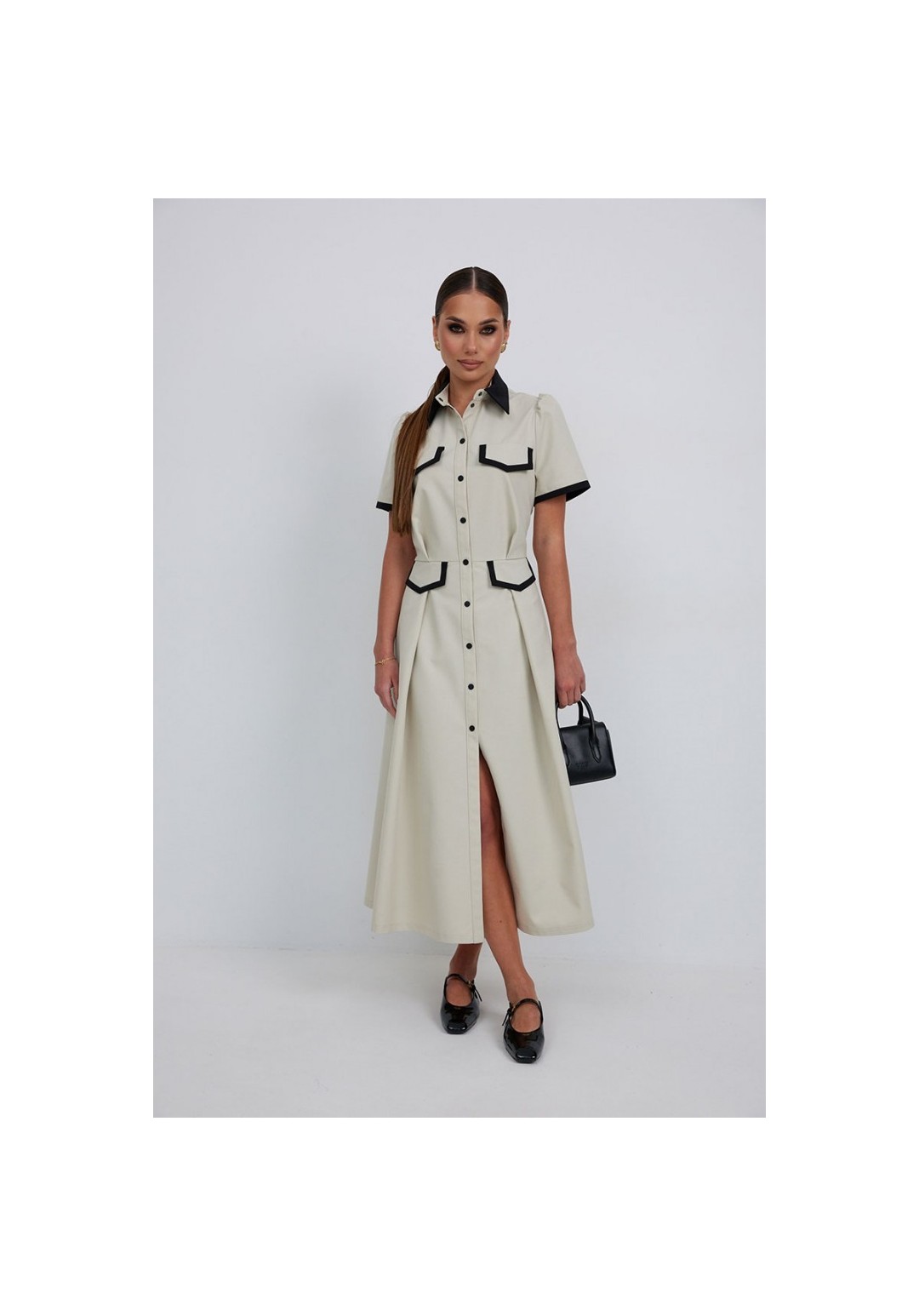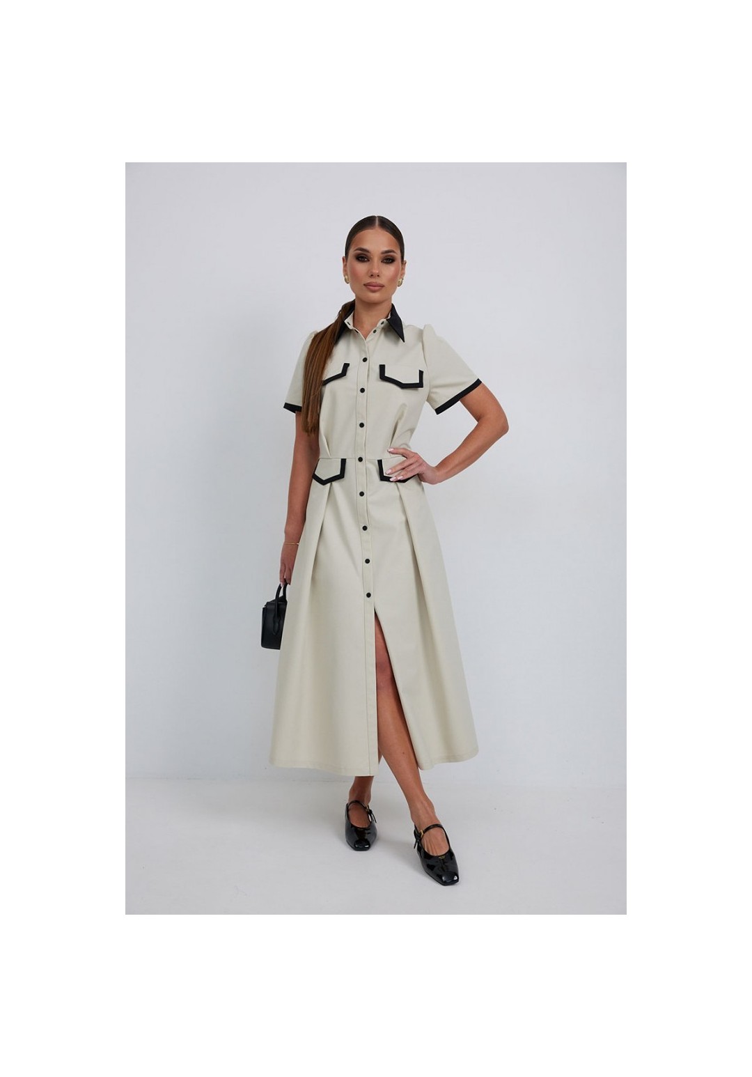 Платье из тонкой джинсовой ткани полуприлегающего силуэта длины миди расширенное к низу. По талии подрез, нижняя часть платья с карманами в боковых швах и встречными складками по талии. По переду планка с застежкой на петли и пуговицы. Верх переда и линия подреза с клапанами. Воротник на стойке. Рукав втачной короткий. Край клапанов, низ рукавов и воротник из отделочной ткани. Длина рукава 25 см. 44 р-р: ОГ - 98 см., ОТ - 80 см., ОБ - 108 см. 46 р-р: ОГ - 102 см., ОТ - 84 см., ОБ - 112 см. 48 р-р: ОГ - 106 см., ОТ - 88 см., ОБ - 116 см. 50 р-р: ОГ - 110 см., ОТ - 92 см., ОБ - 120 см. 52 р-р: ОГ - 114 см., ОТ - 96 см., ОБ - 124 см.