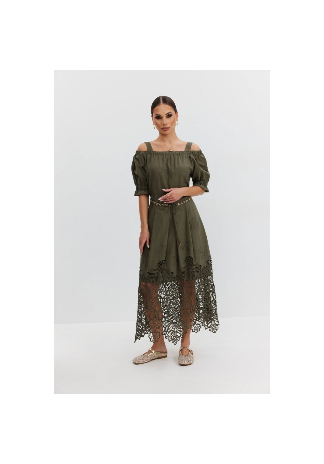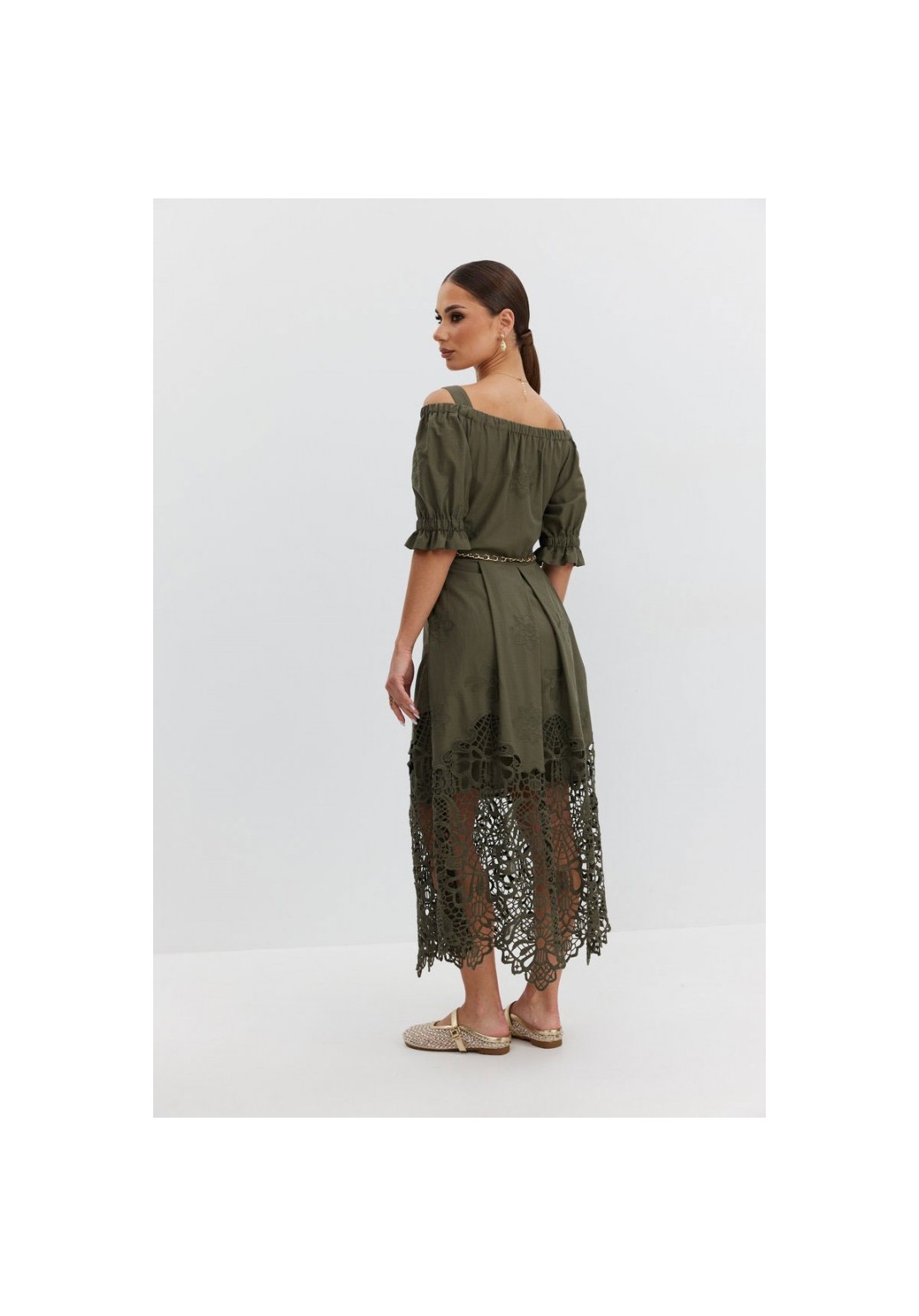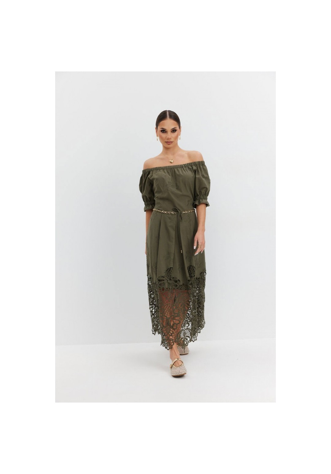 Платье из хлопковой ткани ришелье. Длина макси. Платье отрезное по талии, юбка со складками. Верх с открытыми плечами и съемными бретелями. Застежка в боковом шве на потайную молнию. Рукав фонарик. В боковых швах карманы. В комплекте декоративный пояс-завязка. Платье на подкладке. Длина рукава 30 см. 44 р-р: ОГ - 108 см., ОТ - 82 см., ОБ - 112 см. 46 р-р: ОГ - 112 см., ОТ - 86 см., ОБ - 116 см. 48 р-р: ОГ - 116 см., ОТ - 90 см., ОБ - 120 см. 50 р-р: ОГ - 120 см., ОТ - 94 см., ОБ - 124 см. 52 р-р: ОГ - 124 см., ОТ - 98 см., ОБ - 128 см.