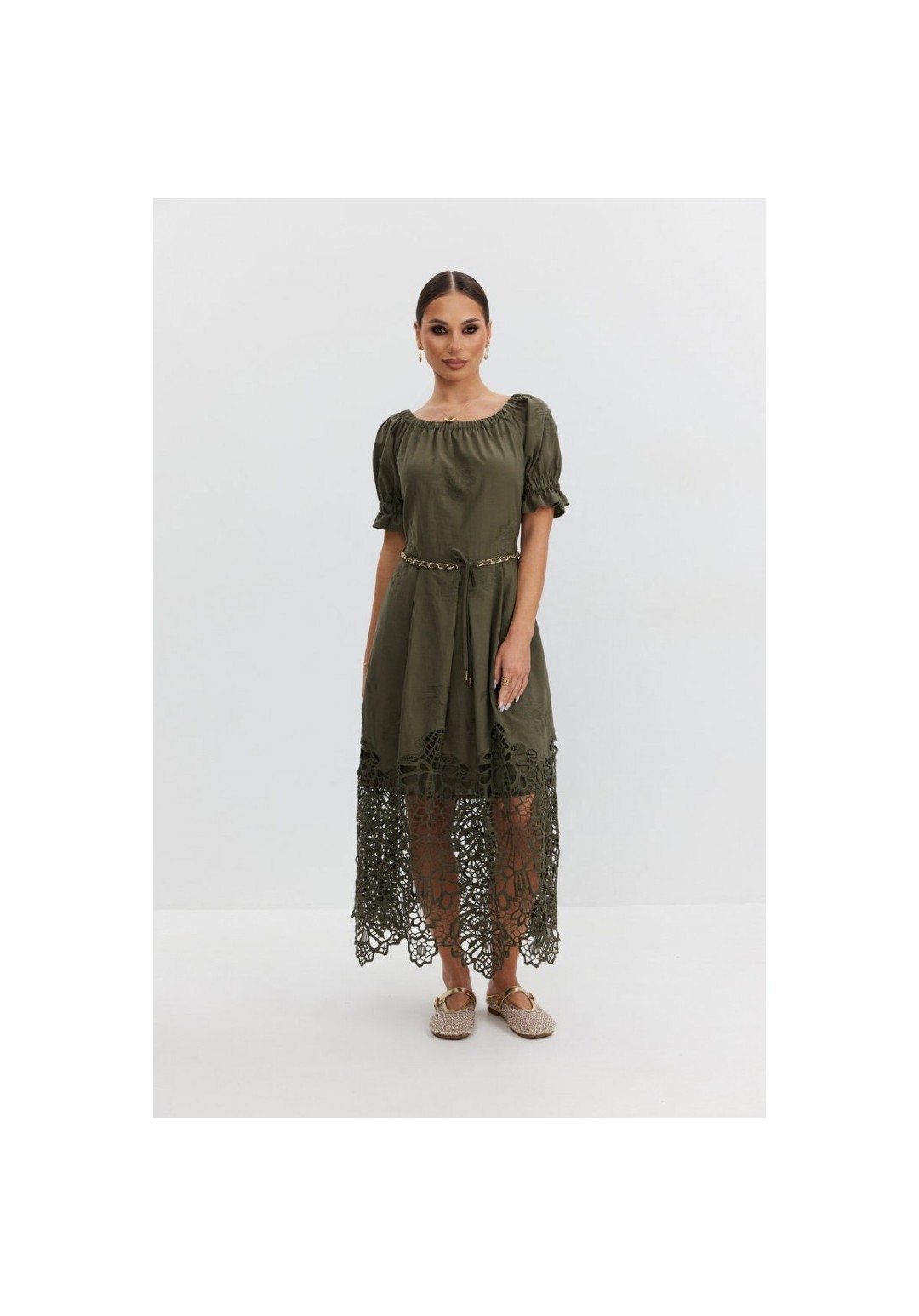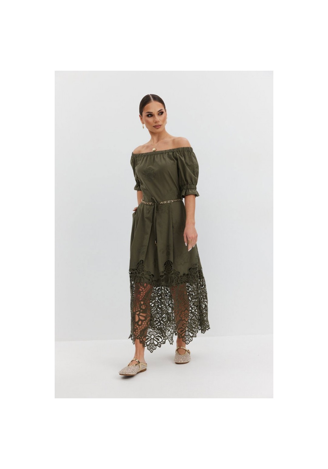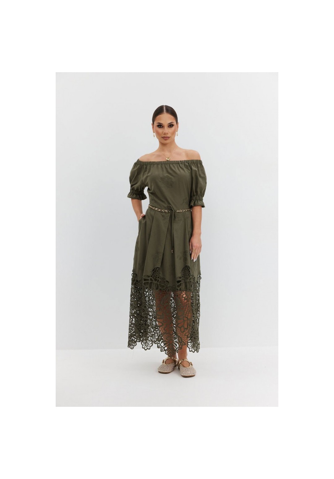 Платье из хлопковой ткани ришелье. Длина макси. Платье отрезное по талии, юбка со складками. Верх с открытыми плечами и съемными бретелями. Застежка в боковом шве на потайную молнию. Рукав фонарик. В боковых швах карманы. В комплекте декоративный пояс-завязка. Платье на подкладке. Длина рукава 30 см. 44 р-р: ОГ - 108 см., ОТ - 82 см., ОБ - 112 см. 46 р-р: ОГ - 112 см., ОТ - 86 см., ОБ - 116 см. 48 р-р: ОГ - 116 см., ОТ - 90 см., ОБ - 120 см. 50 р-р: ОГ - 120 см., ОТ - 94 см., ОБ - 124 см. 52 р-р: ОГ - 124 см., ОТ - 98 см., ОБ - 128 см.