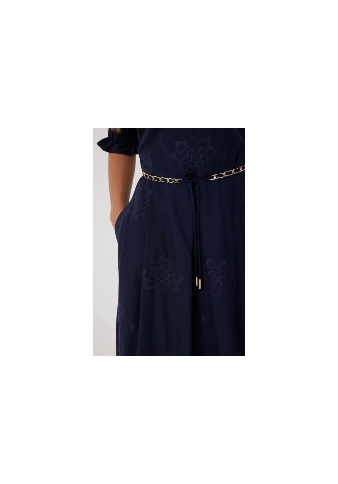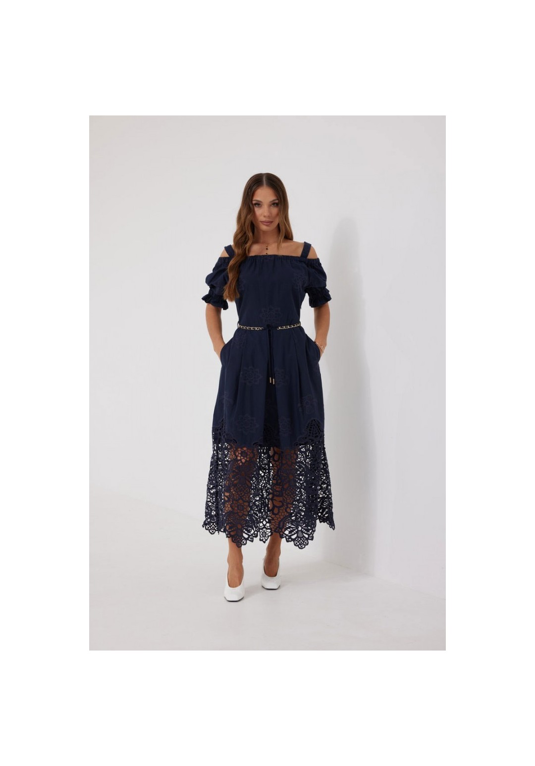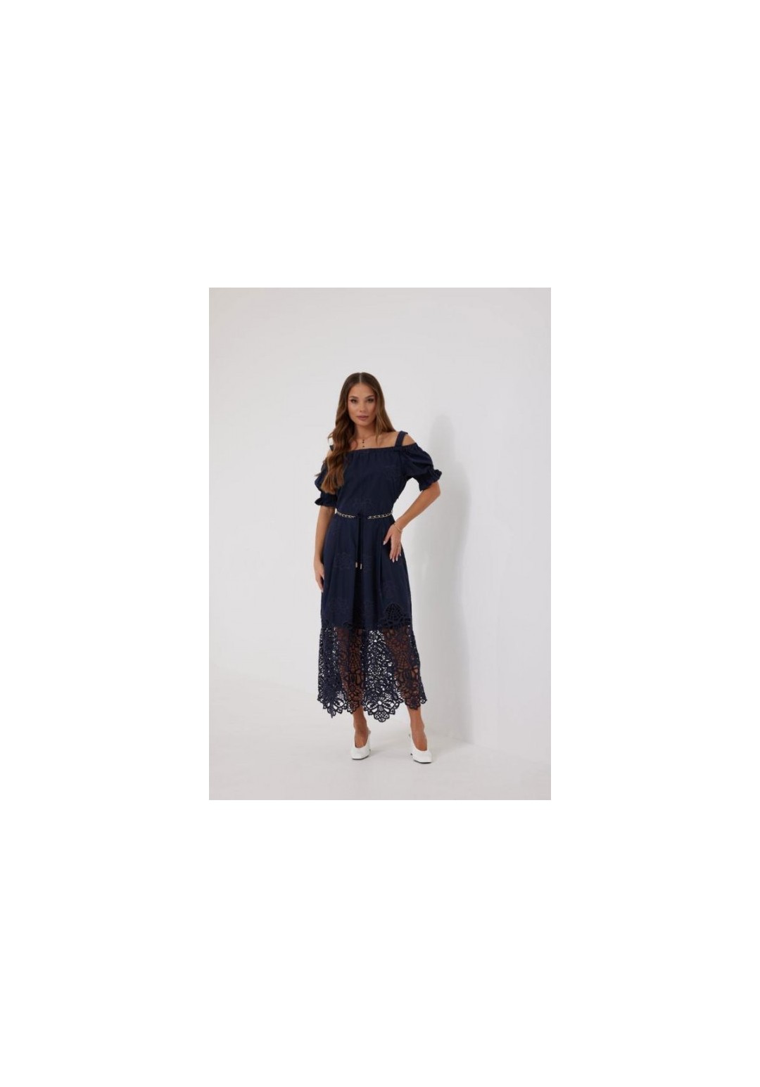 Платье из хлопковой ткани ришелье. Длина макси. Платье отрезное по талии, юбка со складками. Верх с открытыми плечами и съемными бретелями. Застежка в боковом шве на потайную молнию. Рукав фонарик. В боковых швах карманы. В комплекте декоративный пояс-завязка. Платье на подкладке. Длина рукава 30 см. 44 р-р: ОГ - 108 см., ОТ - 82 см., ОБ - 112 см. 46 р-р: ОГ - 112 см., ОТ - 86 см., ОБ - 116 см. 48 р-р: ОГ - 116 см., ОТ - 90 см., ОБ - 120 см. 50 р-р: ОГ - 120 см., ОТ - 94 см., ОБ - 124 см. 52 р-р: ОГ - 124 см., ОТ - 98 см., ОБ - 128 см.