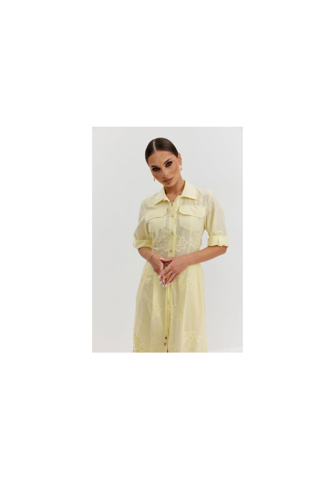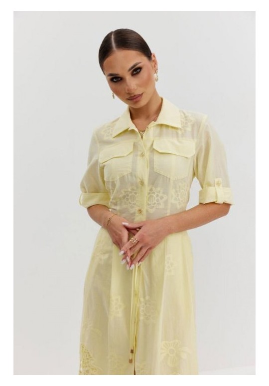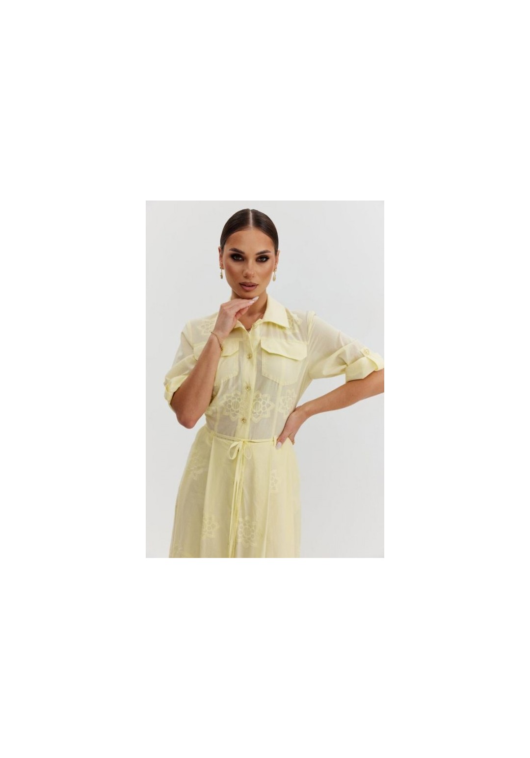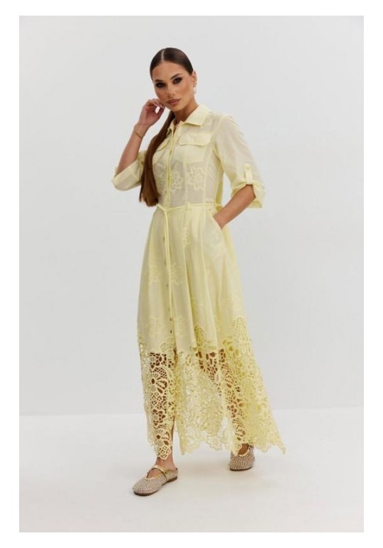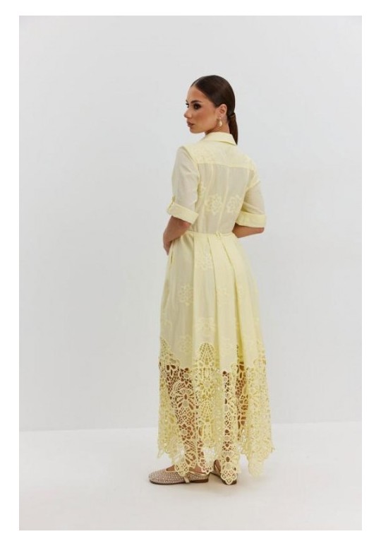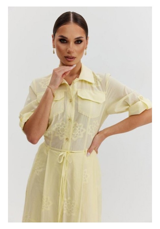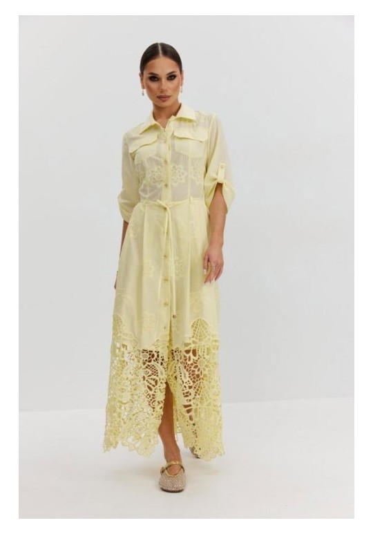 Платье из ажурной хлопковой ткани. Длина макси. Застежка на петли и пуговицы. Платье отрезное по талии. Воротник рубашечный. По переду накладные карманы с клапаном. Рукав прямой ¾ с регулируемой патой. По юбке платья складки. В боковых швах карманы. В комплекте съемный пояс-завязка. Юбка платья на хлопковой подкладке. Длина рукава 40 см. 44 р-р: ОГ - 98 см., ОТ - 82 см., ОБ - 104 см. 46 р-р: ОГ - 102 см., ОТ - 86 см., ОБ - 108 см. 48 р-р: ОГ - 106 см., ОТ - 90 см., ОБ - 112 см. 50 р-р: ОГ - 110 см., ОТ - 94 см., ОБ - 116 см. 52 р-р: ОГ - 114 см., ОТ - 98 см., ОБ - 120 см.