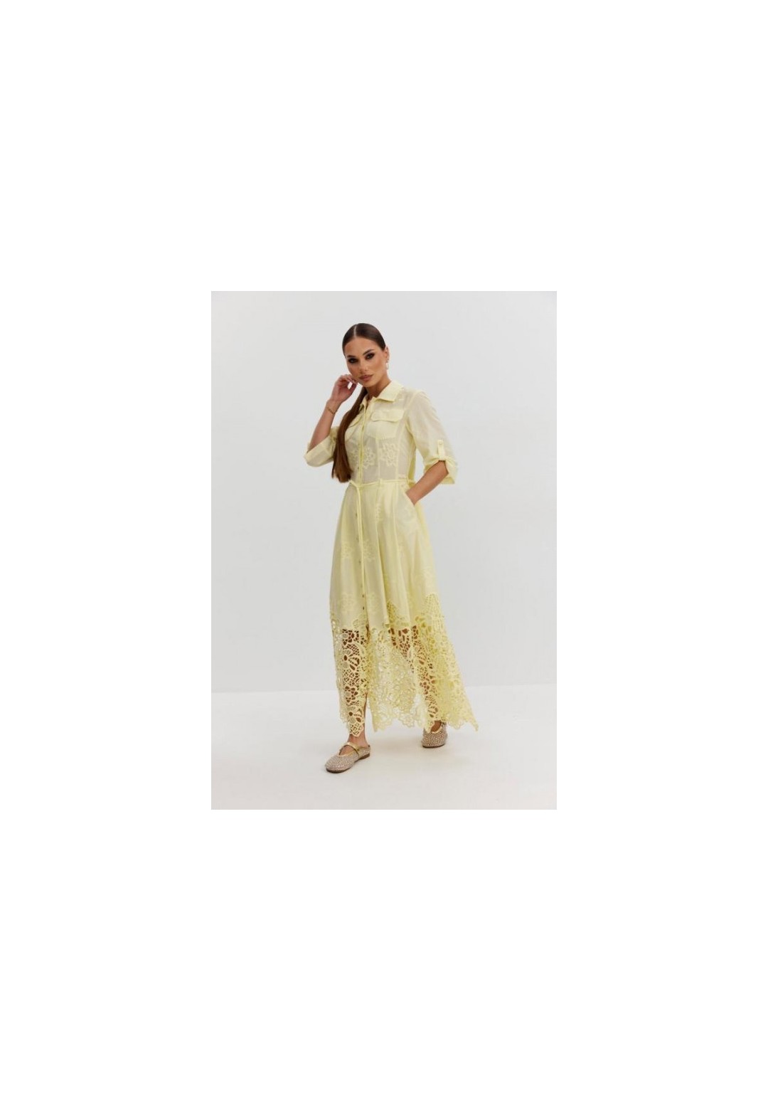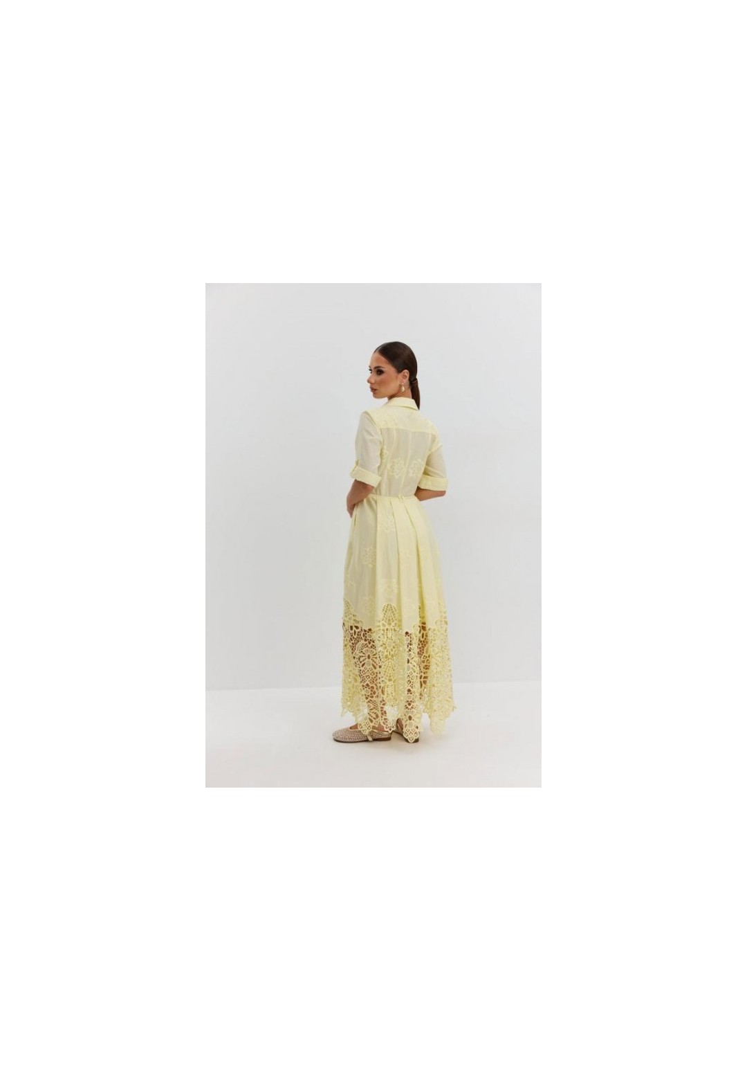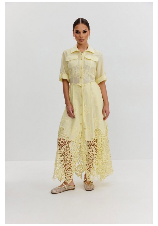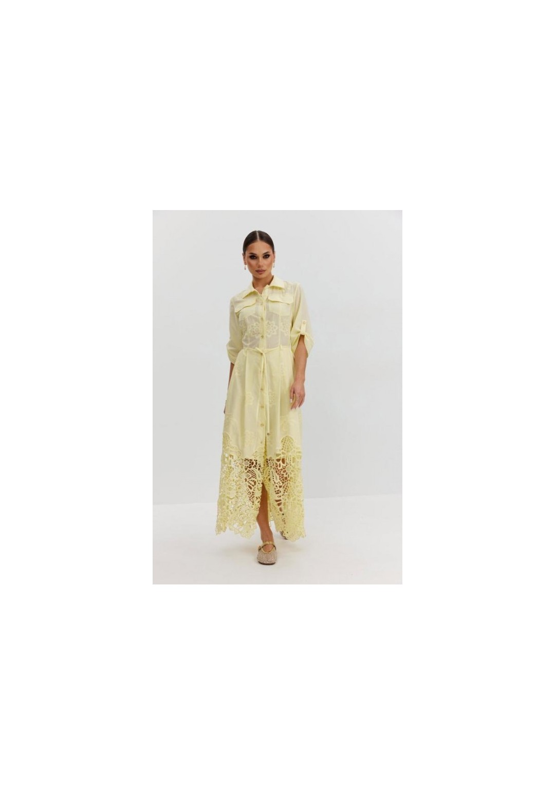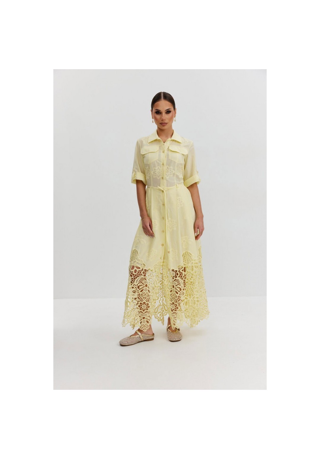 Платье из ажурной хлопковой ткани. Длина макси. Застежка на петли и пуговицы. Платье отрезное по талии. Воротник рубашечный. По переду накладные карманы с клапаном. Рукав прямой ¾ с регулируемой патой. По юбке платья складки. В боковых швах карманы. В комплекте съемный пояс-завязка. Юбка платья на хлопковой подкладке. Длина рукава 40 см. 44 р-р: ОГ - 98 см., ОТ - 82 см., ОБ - 104 см. 46 р-р: ОГ - 102 см., ОТ - 86 см., ОБ - 108 см. 48 р-р: ОГ - 106 см., ОТ - 90 см., ОБ - 112 см. 50 р-р: ОГ - 110 см., ОТ - 94 см., ОБ - 116 см. 52 р-р: ОГ - 114 см., ОТ - 98 см., ОБ - 120 см.