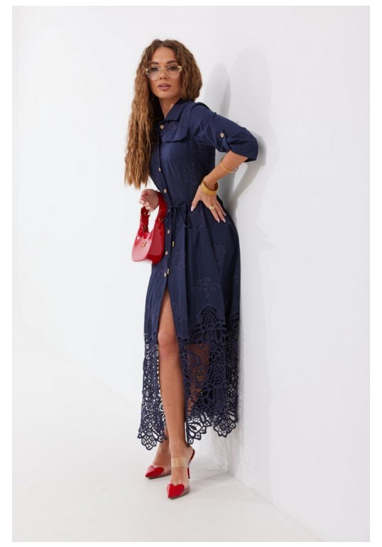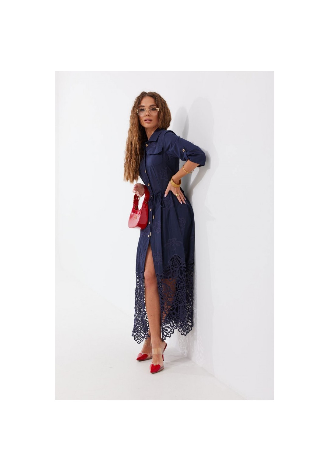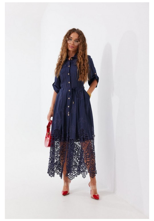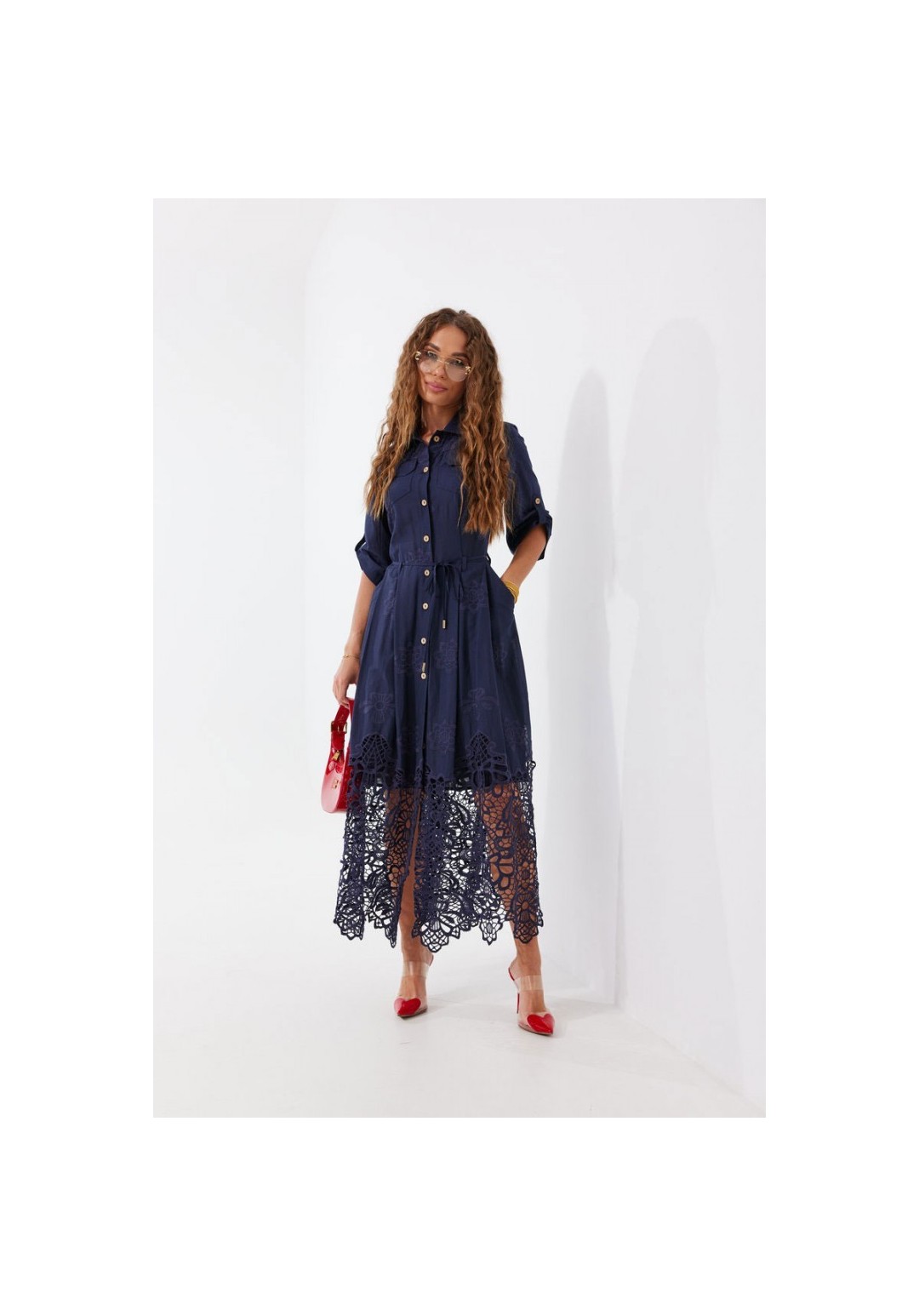Платье из ажурной хлопковой ткани. Длина макси. Застежка на петли и пуговицы. Платье отрезное по талии. Воротник рубашечный. По переду накладные карманы с клапаном. Рукав прямой ¾ с регулируемой патой. По юбке платья складки. В боковых швах карманы. В комплекте съемный пояс-завязка. Юбка платья на хлопковой подкладке. Длина рукава 40 см. 44 р-р: ОГ - 98 см., ОТ - 82 см., ОБ - 104 см. 46 р-р: ОГ - 102 см., ОТ - 86 см., ОБ - 108 см. 48 р-р: ОГ - 106 см., ОТ - 90 см., ОБ - 112 см. 50 р-р: ОГ - 110 см., ОТ - 94 см., ОБ - 116 см. 52 р-р: ОГ - 114 см., ОТ - 98 см., ОБ - 120 см.
