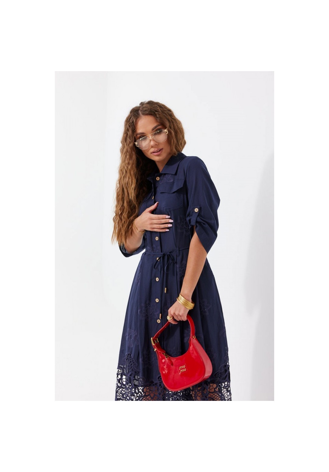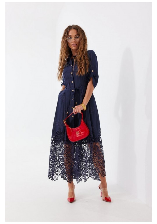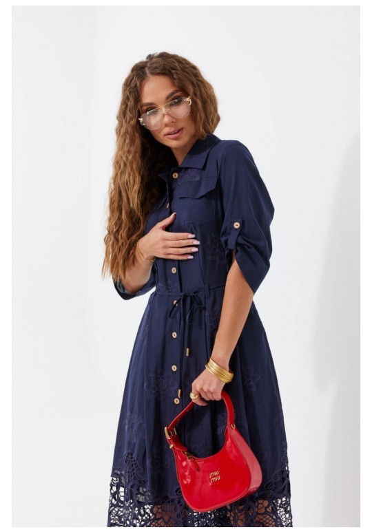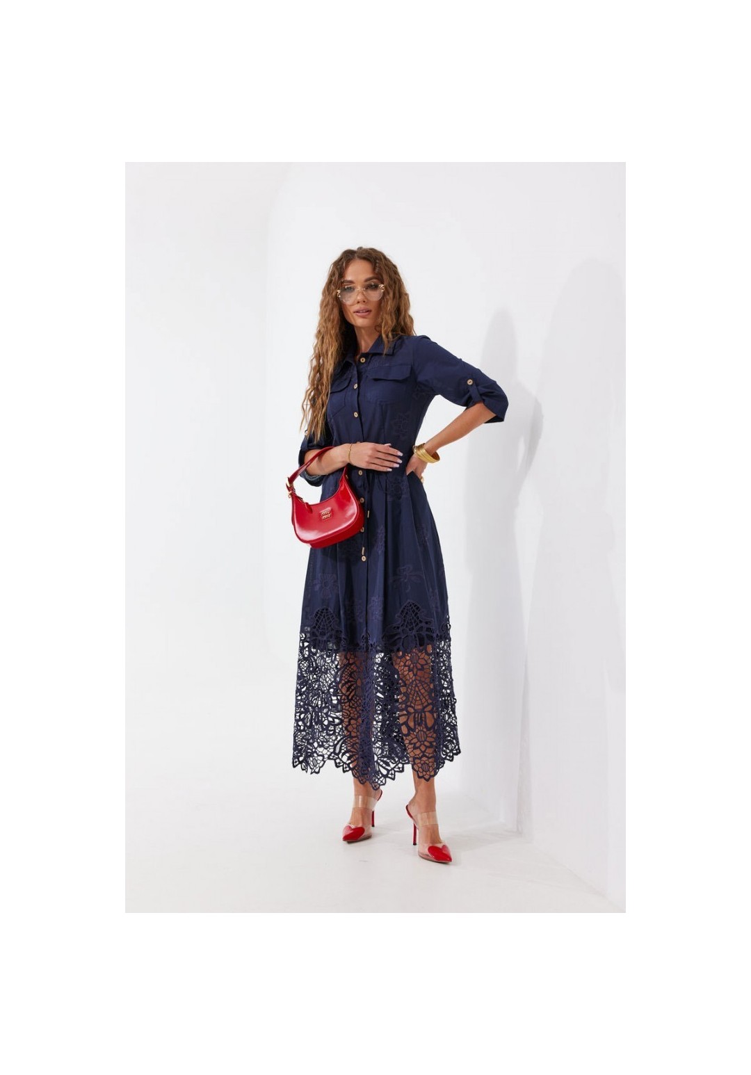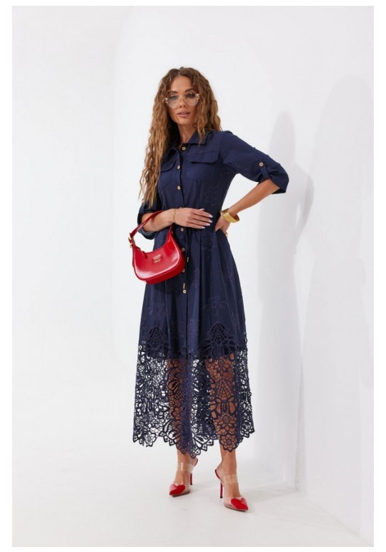 Платье из ажурной хлопковой ткани. Длина макси. Застежка на петли и пуговицы. Платье отрезное по талии. Воротник рубашечный. По переду накладные карманы с клапаном. Рукав прямой ¾ с регулируемой патой. По юбке платья складки. В боковых швах карманы. В комплекте съемный пояс-завязка. Юбка платья на хлопковой подкладке. Длина рукава 40 см. 44 р-р: ОГ - 98 см., ОТ - 82 см., ОБ - 104 см. 46 р-р: ОГ - 102 см., ОТ - 86 см., ОБ - 108 см. 48 р-р: ОГ - 106 см., ОТ - 90 см., ОБ - 112 см. 50 р-р: ОГ - 110 см., ОТ - 94 см., ОБ - 116 см. 52 р-р: ОГ - 114 см., ОТ - 98 см., ОБ - 120 см.