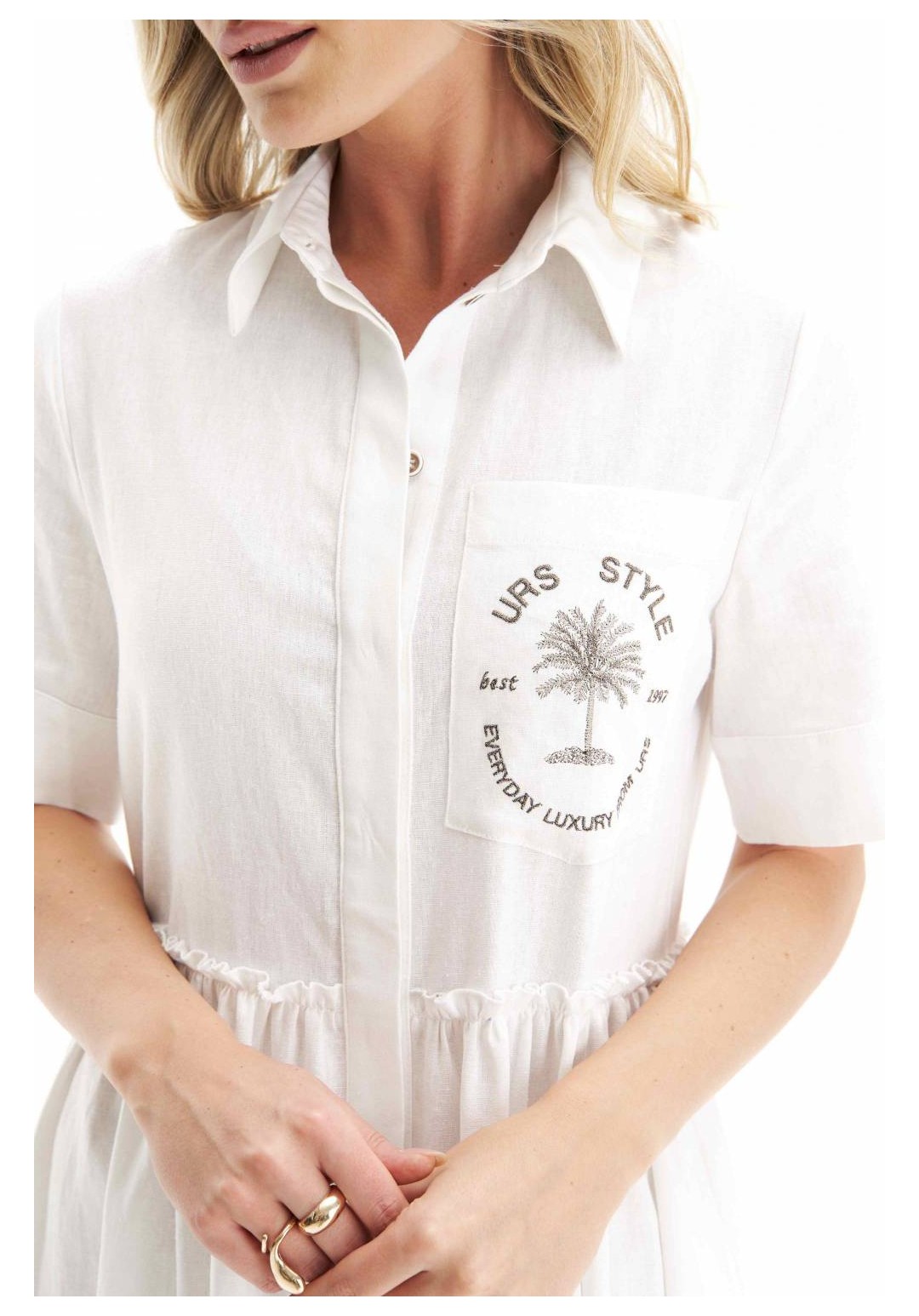 Изысканное белое платье-рубашка из натурального льна — воплощение легкости и стиля для жарких дней. Свободный крой, аккуратные рукава и свободная талия создают комфортный силуэт, который красиво подчеркивает фигуру. Особое внимание привлекает вышивка на кармане: Everyday Luxury from URS добавляют образу утончённую изюминку и атмосферу расслабленного шика. Модель идеально подходит как для городской прогулки, так и для отдыха на курорте. Лен обеспечивает натуральную вентиляцию, дарит прохладу даже в самую жаркую погоду, а универсальный белый цвет легко сочетается с яркими аксессуарами. Платье женское свободного силуэта, расклешенное к низу, из плательной ткани лен, отрезное по линии талии, с центральной бортовой застежкой с притачной потайной планкой на 10 петель и 10 пуговиц, предназначенное для повседневной носки. Левая верхняя часть переда с накладным карманом фигурной формы. Карман оформлен декоративной вышивкой. Верхняя часть спинки цельная. Нижняя часть переда и спинки на подкладке, в боковых швах с карманами. Верхний срез нижней части переда и спинки обметан узким оверлочным швом улитка, присборен и настрочен на расстоянии 1,5 см от обметки на лиф. Горловина с воротником с отрезной стойкой, застегивающейся на 1 петлю и 1 пуговицу. Рукава втачные, короткие, понизу с притачными манжетами.