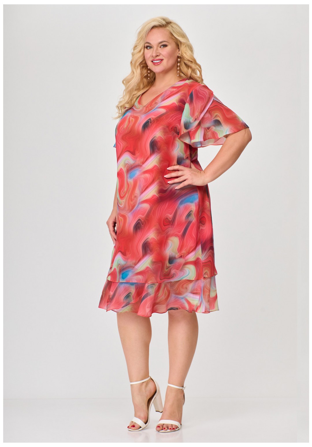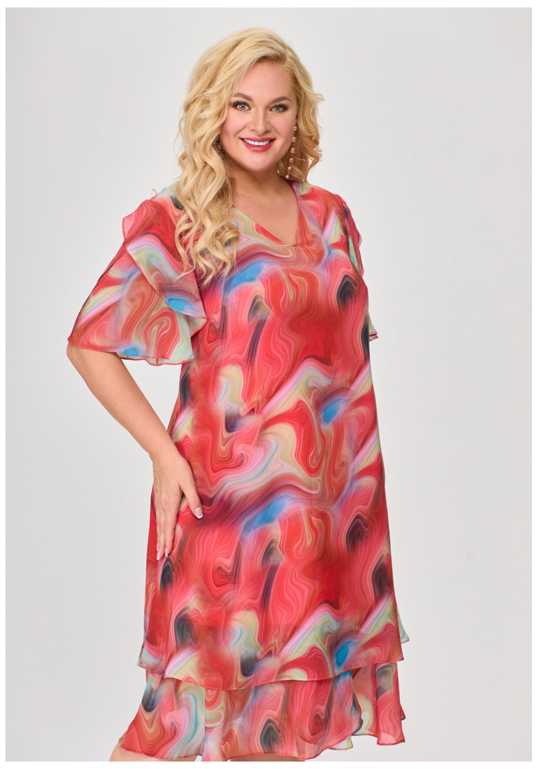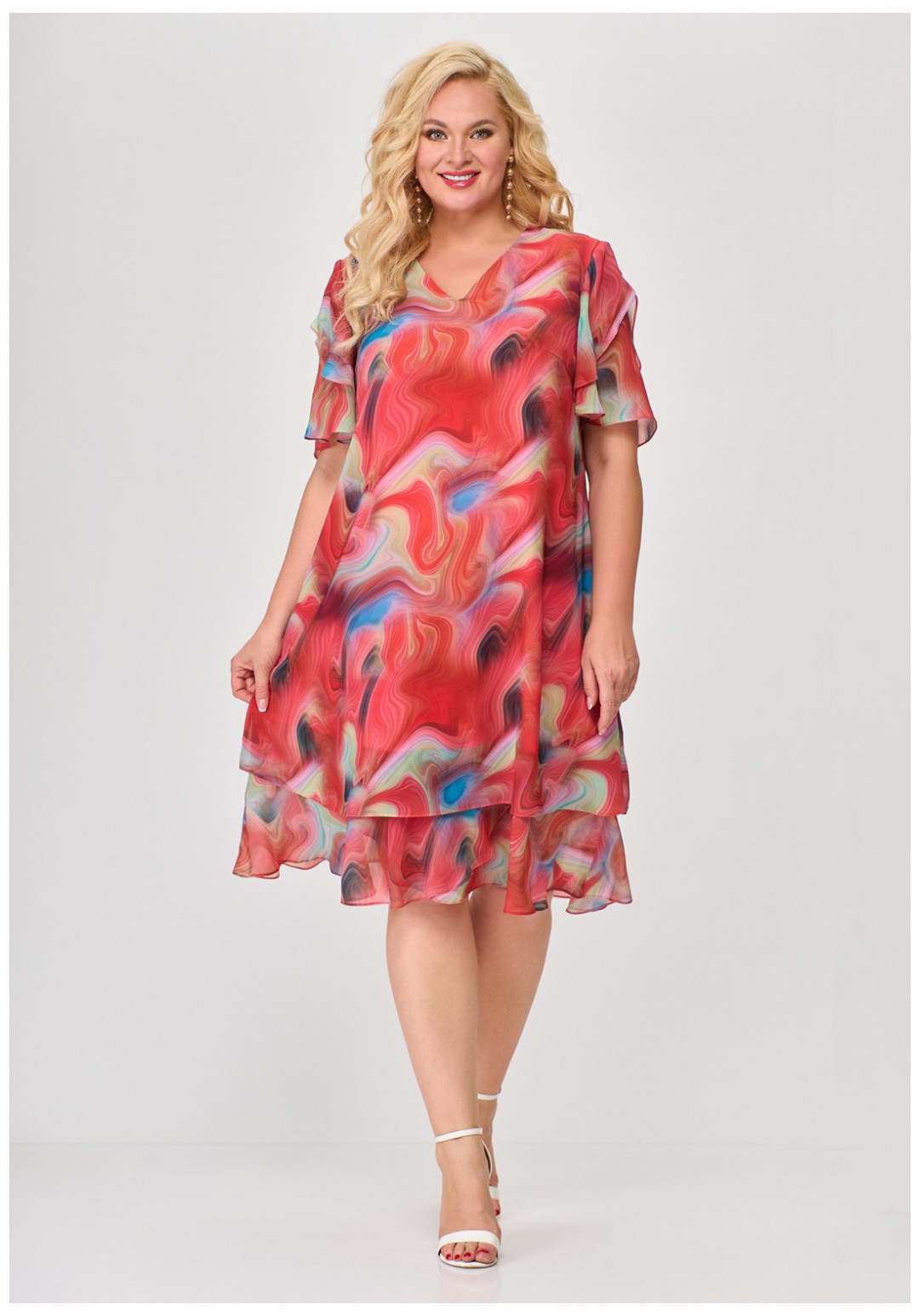 Летнее платье из нежного шифона актуально для любого мероприятия. Платье с ярким корраловым рисунком визуально стройнит ноги, делает их "бесконечно" длинными.