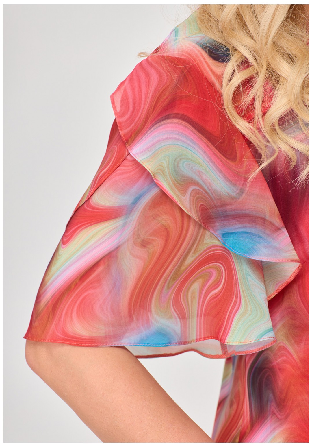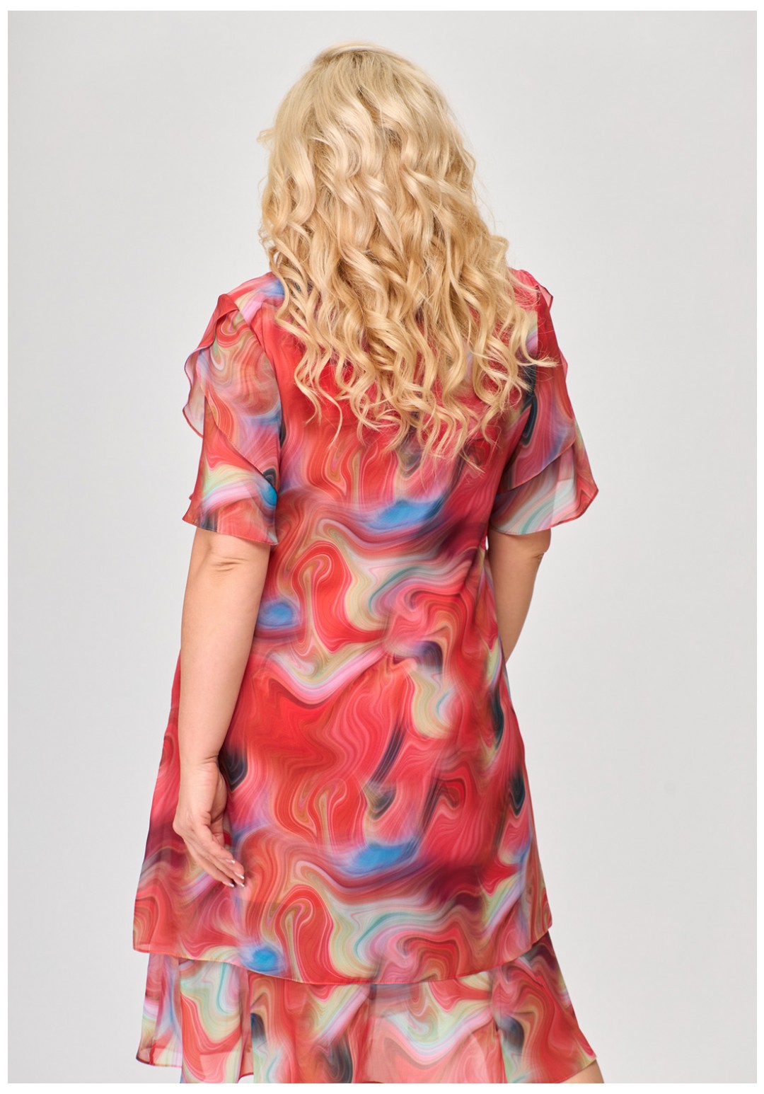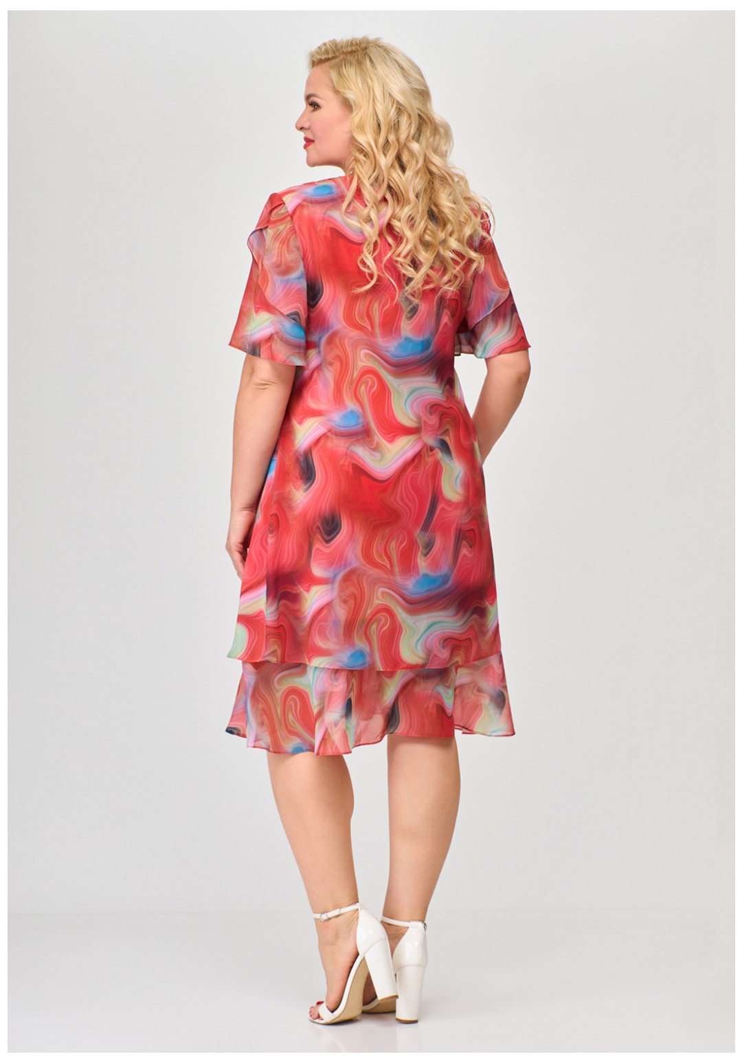 Летнее платье из нежного шифона актуально для любого мероприятия. Платье с ярким корраловым рисунком визуально стройнит ноги, делает их "бесконечно" длинными.