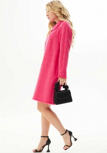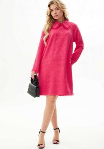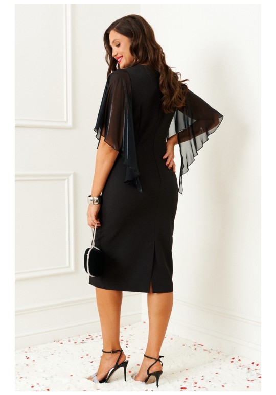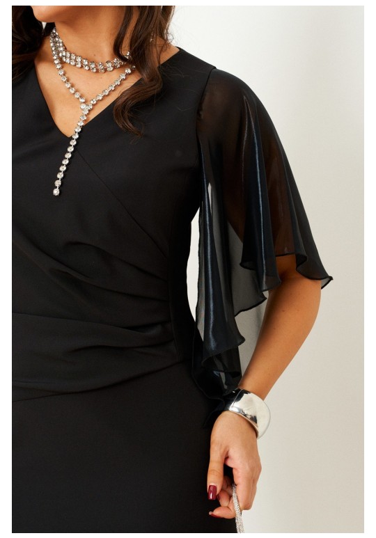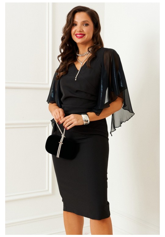 Воплощение вечной классики! Контраст мягкой асимметрии и тонких изгибов, пересечение оттенков и фактур – то самое платье для зимних праздников. Одеваем и наслаждаемся. Платье женское, прилегающего силуэта в романтическом стиле, средней длины, выполнено из костюмно-смесового полотна в комбинации с лёгким, струящимся шифоном. Лиф переда на подкладке. Передняя часть платья с наклонным подрезом на уровне бёдер. Верхняя часть с вертикальными рельефами от проймы и декоративными складками на уровне талии. Спинка разрезная по среднему шву, в верхней части которого предусмотрена длинная потайная молния, а в нижней – шлица. На талии расположены две вертикальные вытачки. Горловина V – образной формы. Рукав фантазийной формы из шифонового полотна. Свободный, летящий и комфортный. Длина изделия по спинке ~ 109 см. Длина рукава ~ 30,5 см.