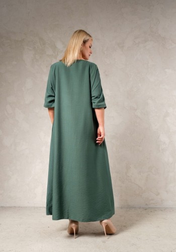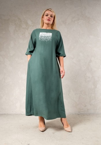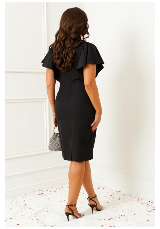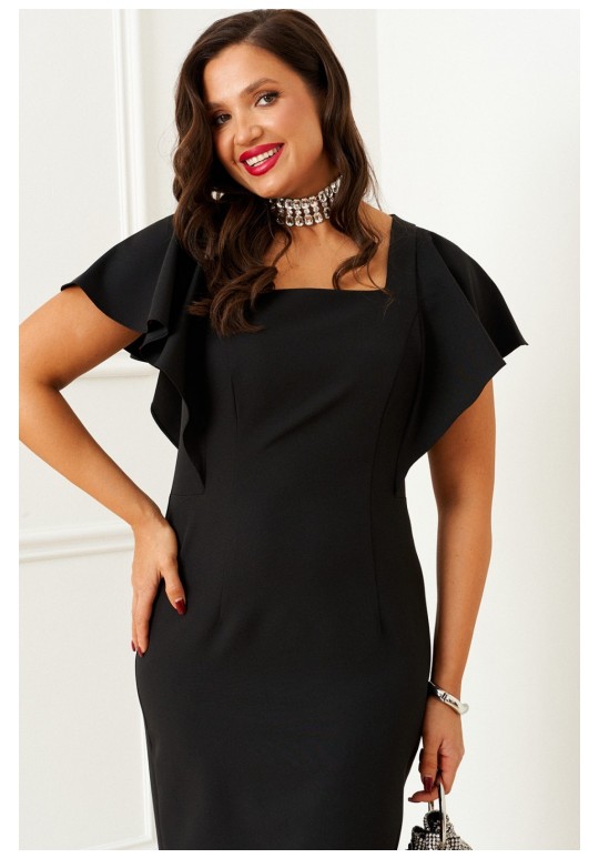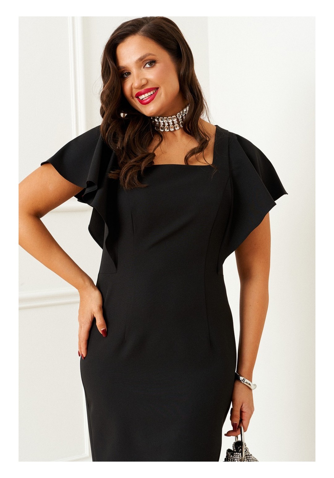 Изысканный нарядный образ создаётся благодаря красивому сочетанию деталей и безупречного силуэта. Платье прилегающего силуэта средней длины выполнено из костюмного смесового полотна. Перед с двумя вертикальными рельефами от плеча, которые заканчиваются вытачкой и с двумя горизонтальными подрезами на уровне талии. Спинка разрезная по среднему шву, с двумя вертикальными вытачками и с двумя горизонтальными подрезами на талии. Внизу среднего шва спинки для удобства в динамике предусмотрена шлица. Вверху среднего шва спинки предусмотрена потайная застежка–молния. По вертикальному рельефу до талии вставлен фантазийный рукав-волан. Горловина переда прямоугольной формы тип каре. Длина платья (по среднему шву спинки) ~ 102,5 см.