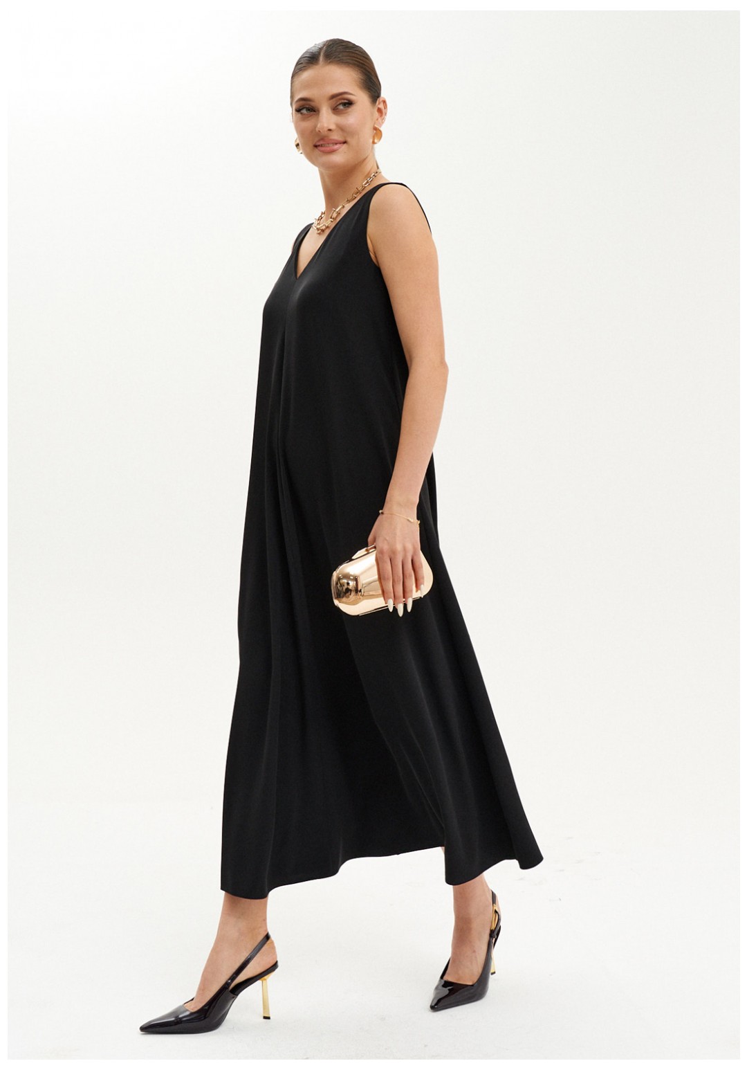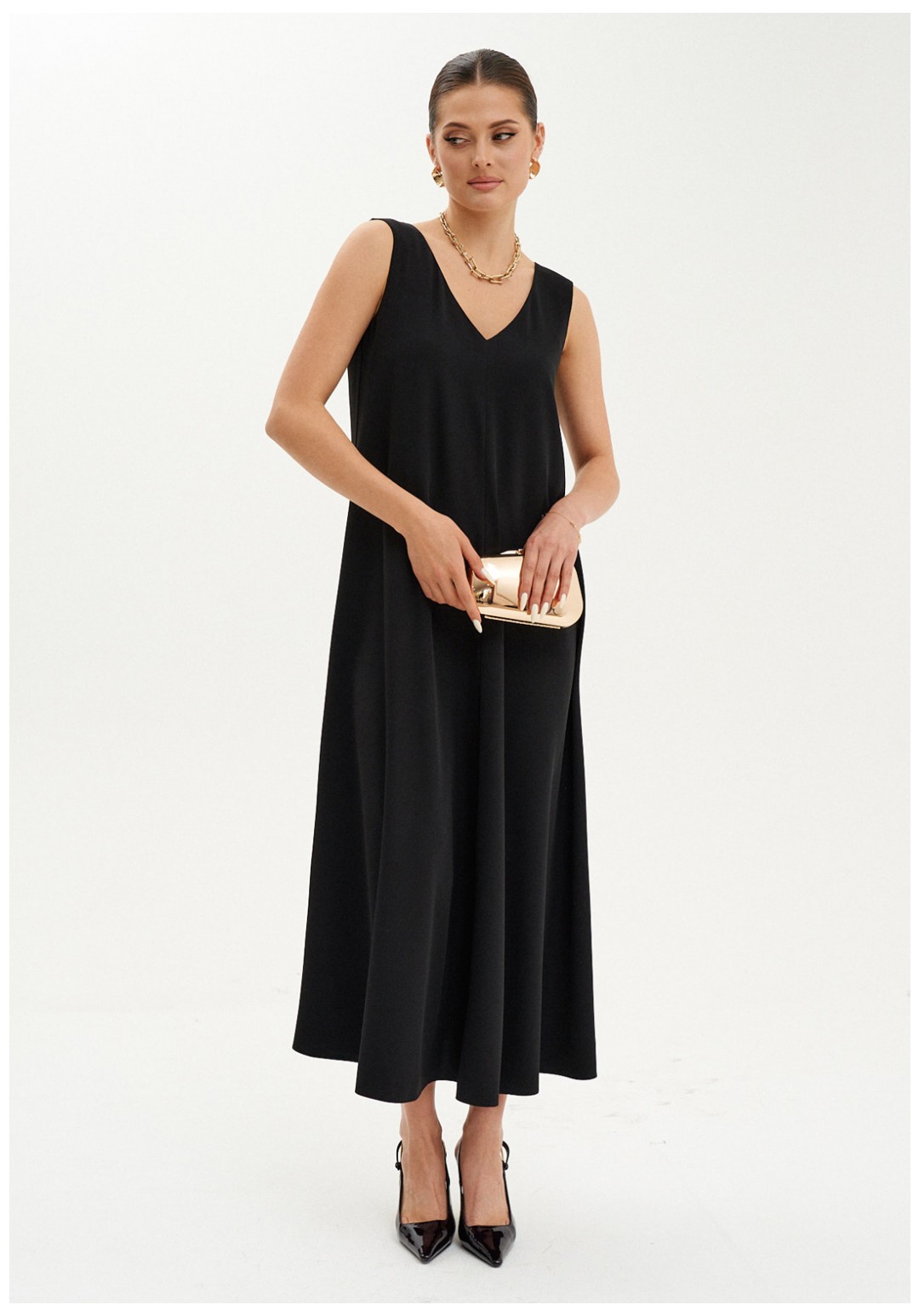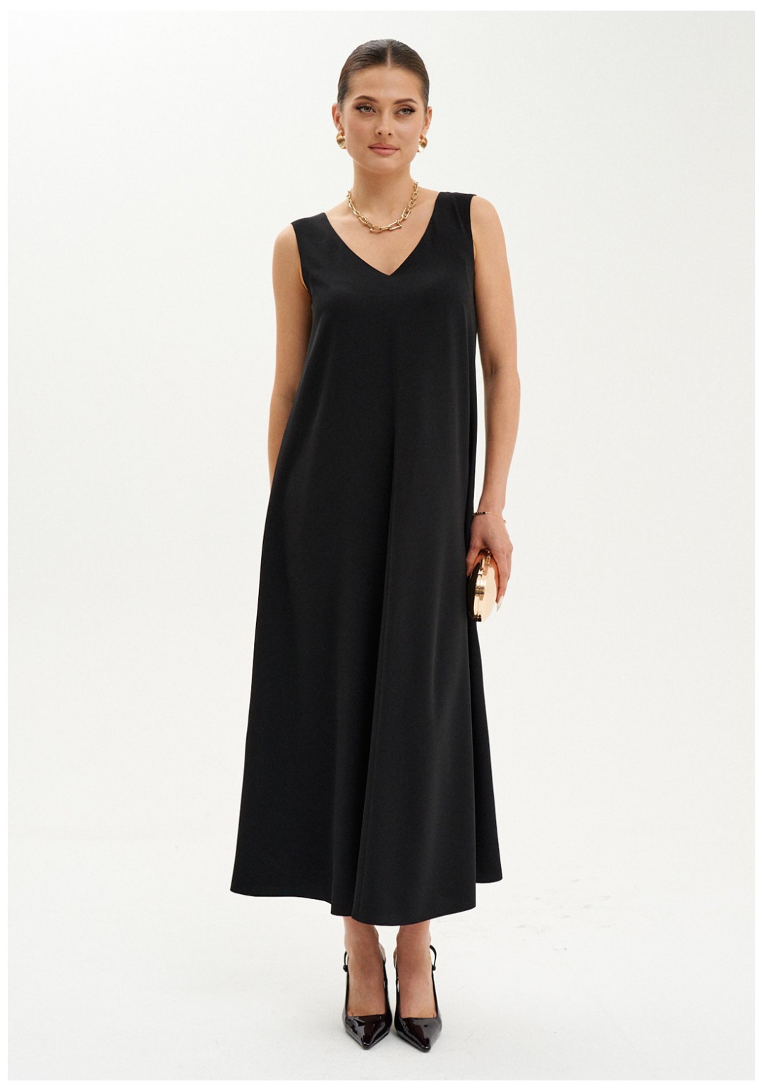 Элегантное макси-платье из струящейся ткани станет идеальным вариантом как для повседневной носки, так и для торжественных мероприятий. Платье слегка расширяется к низу, подчеркивая женственный силуэт и создавая легкость в движении. V-образная горловина спереди и на спинке визуально удлиняет шею и добавляет образу изысканности. Безрукавный дизайн позволяет сочетать платье с кардиганами и жакетами, создавая новые образы. В этом платье вы будете выглядеть стильно и привлекательно на любом мероприятии, а его фасон подчеркнёт вашу фигуру, придавая женственности и уверенности.