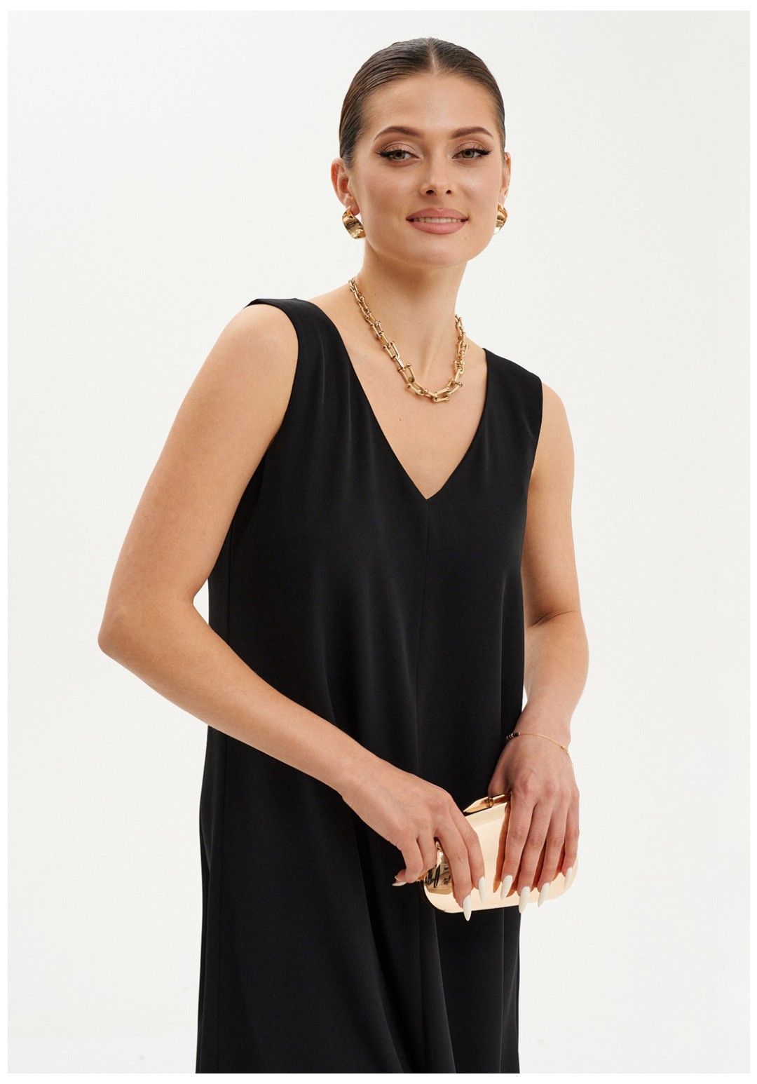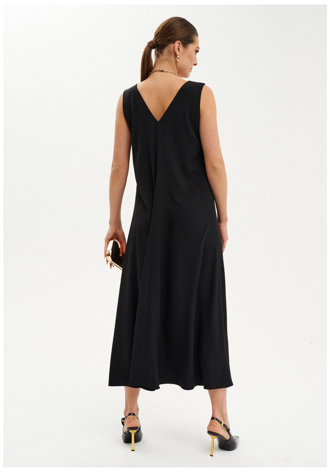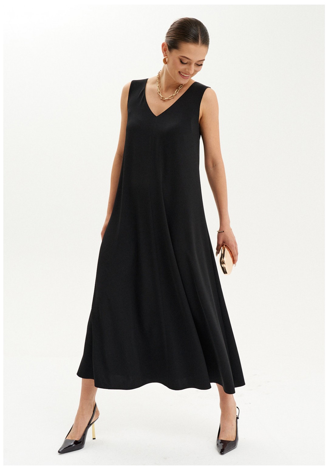 Элегантное макси-платье из струящейся ткани станет идеальным вариантом как для повседневной носки, так и для торжественных мероприятий. Платье слегка расширяется к низу, подчеркивая женственный силуэт и создавая легкость в движении. V-образная горловина спереди и на спинке визуально удлиняет шею и добавляет образу изысканности. Безрукавный дизайн позволяет сочетать платье с кардиганами и жакетами, создавая новые образы. В этом платье вы будете выглядеть стильно и привлекательно на любом мероприятии, а его фасон подчеркнёт вашу фигуру, придавая женственности и уверенности.