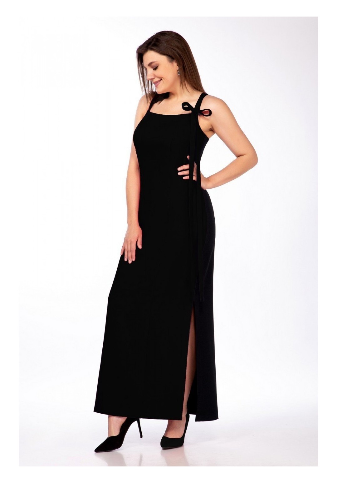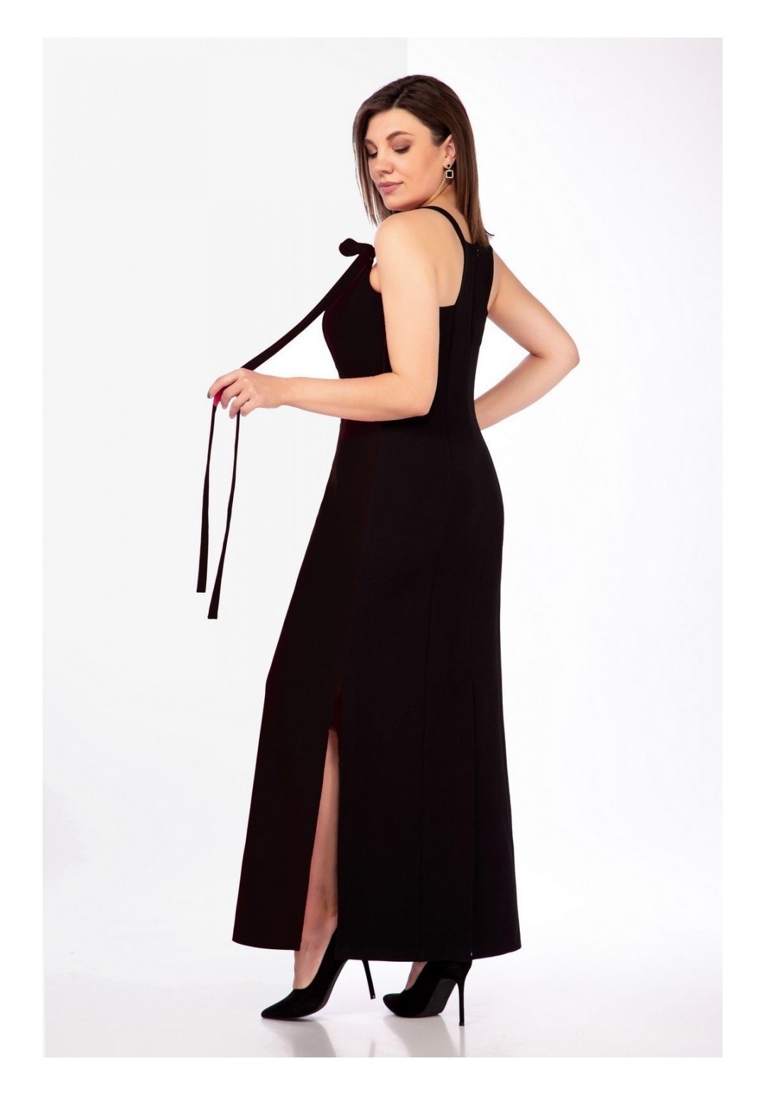 Нарядное платье в пол в стиле Колор-блок. Лаконичность силуэта оригинально сочетается с игрой цвета ткани (перед-спинка). Платье эффектное и элегантное, в нем чувствуешь себя просто неотразимой. Фигура выгодно подчеркнута рельефами, по боковым швам – высокие кокетливые разрезы, по спинке застежка молния и шлица. Платье на бретелях, которые впереди завязываются на бант. Длина платья 145 см