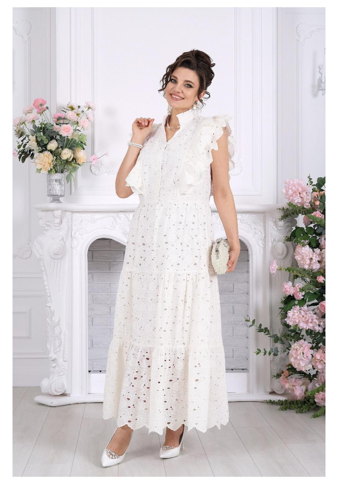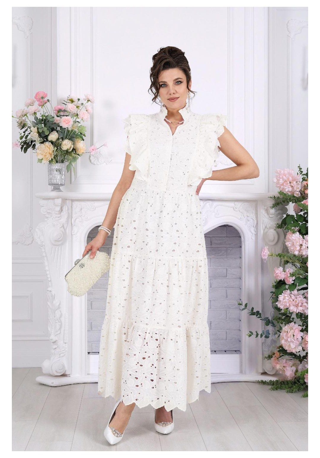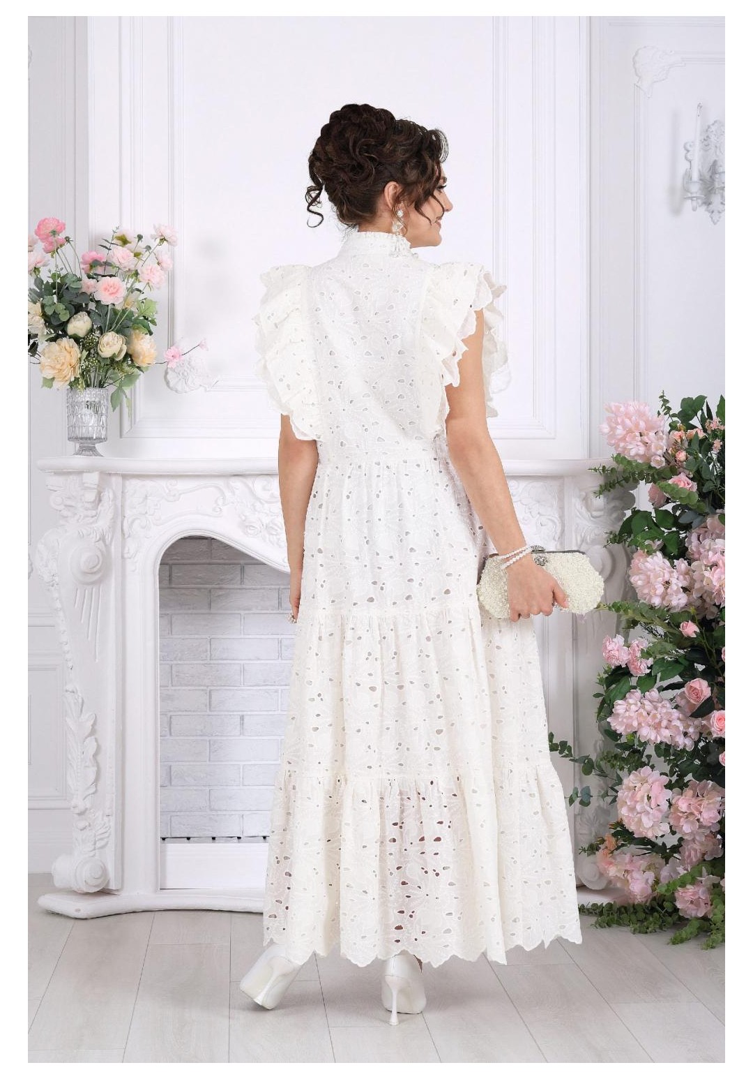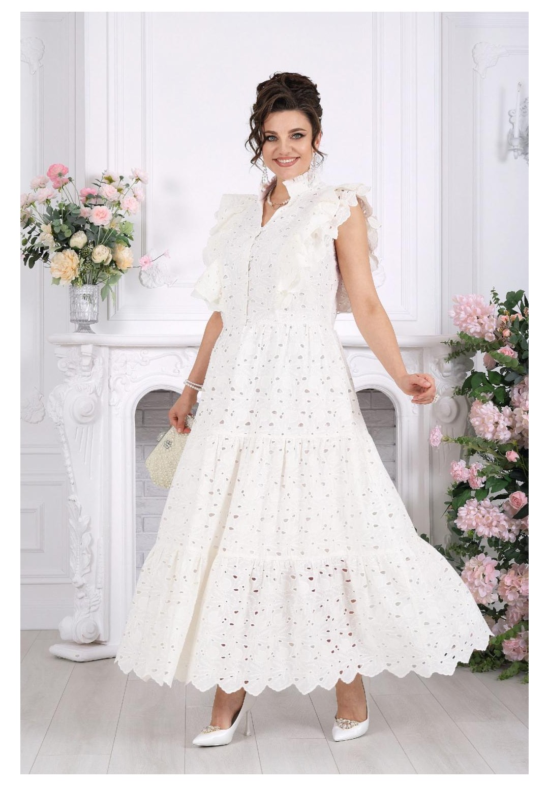 Платье, в котором вы — главное украшение вечера. Это не просто платье — это готовый праздничный образ. Эффектное хлопковое ришелье с ажурным рисунком создаёт ощущение лёгкости и торжественности, словно вы уже на особом событии, где каждый взгляд прикован к вам. Изысканные воланы, утончённые линии и фактура ткани делают модель по-настоящему нарядной. Оно не требует сложных сочетаний — достаточно добавить украшения, и вы готовы к любому празднику. Хлопковое ришелье — это всегда про статус и эстетику. Ажурный рисунок добавляет глубины образу, а натуральная подкладка обеспечивает комфорт даже на длительных мероприятиях. Платье женское из хлопка ришелье, отрезное по линии талии, с лифом прилегающего силуэта и юбкой. Модель на х/б подкладке, без рукавов и плечевых накладок. Спинка и полочка с рельефными швами, направленными от пройм до талии, вставленными в них двумя воланами, присборенными по всей длине. Нижний волан широкий с фестоном по краю, верхний волан с обработанным краем. Горловина платья с V-образным вырезом по переду, оформлена воротником стойкой с присборенной рюшей по верхнему срезу воротника. По полочке оформлена центральная застёжка на 6 навесных петель и 6 пуговиц. В левом боковом шве застёжка на потайную тесьму-молнию (35 см). Юбка платья свободного кроя состоит из трёх присборенных воланов, по краю нижнего волана фестон. Длина платья по среднему шву спинки - см; длина платья по среднему шву спинки (от талии) – 139 см (50-58 р-р).
