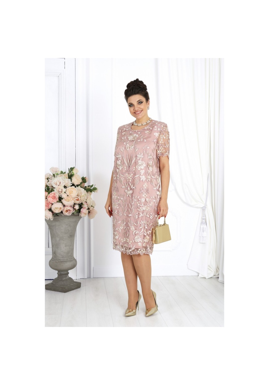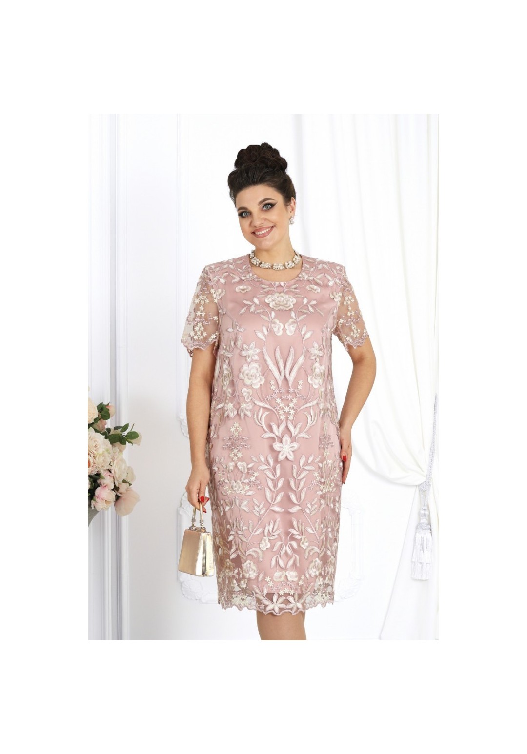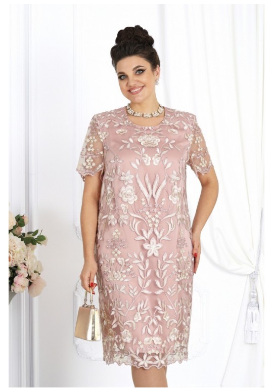 Очаровательное платье полуприлегающего силуэта, воплощающее в себе утонченность и элегантность. Это платье — прекрасный выбор для вечерних мероприятий, торжеств и встреч, в котором вы будете выглядеть безупречно. В этом платье вы будете блистать, ощущая себя великолепно и уверенно. Платье женское, полуприлегающего силуэта, выполнено из гипюра и плательной ткани сатин. Перед и спинка состоят из двух разных по длине слоев: нижний короче верхнего на 5 см. Модель без подкладки, с плечевыми накладками. Низ платья и рукавов оформлен фестонами. Перед в верхнем и нижнем слоях с нагрудными вытачками, выходящими из пройм. Спинка с талиевыми вытачками и средним швом, в верхней части которого обработана застежка на потайную тесьму-молнию (50см), в нижней – разрез. Вырез горловины переда и спинки округлый, углубленный по переду. Рукав короткий, втачной. Верхний и нижний слои платья скреплены по среднему шву, плечевым и проймам. Длина платья (верхний слой)-108 см, длина рукава-26 см.