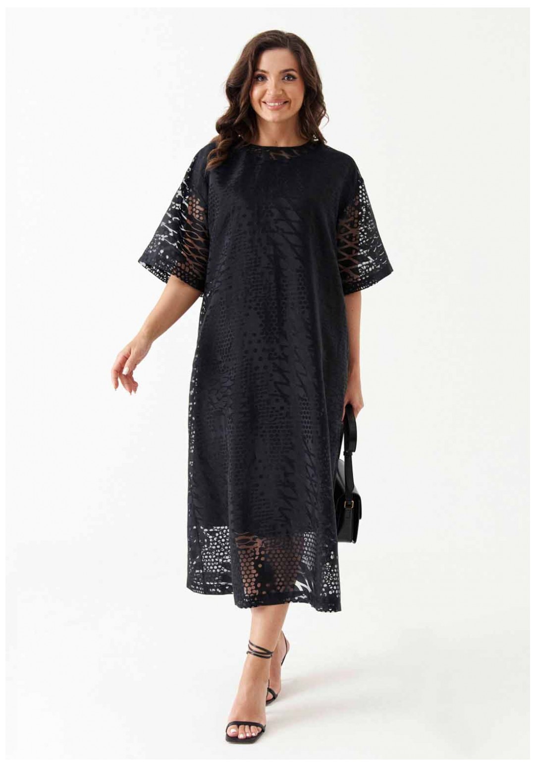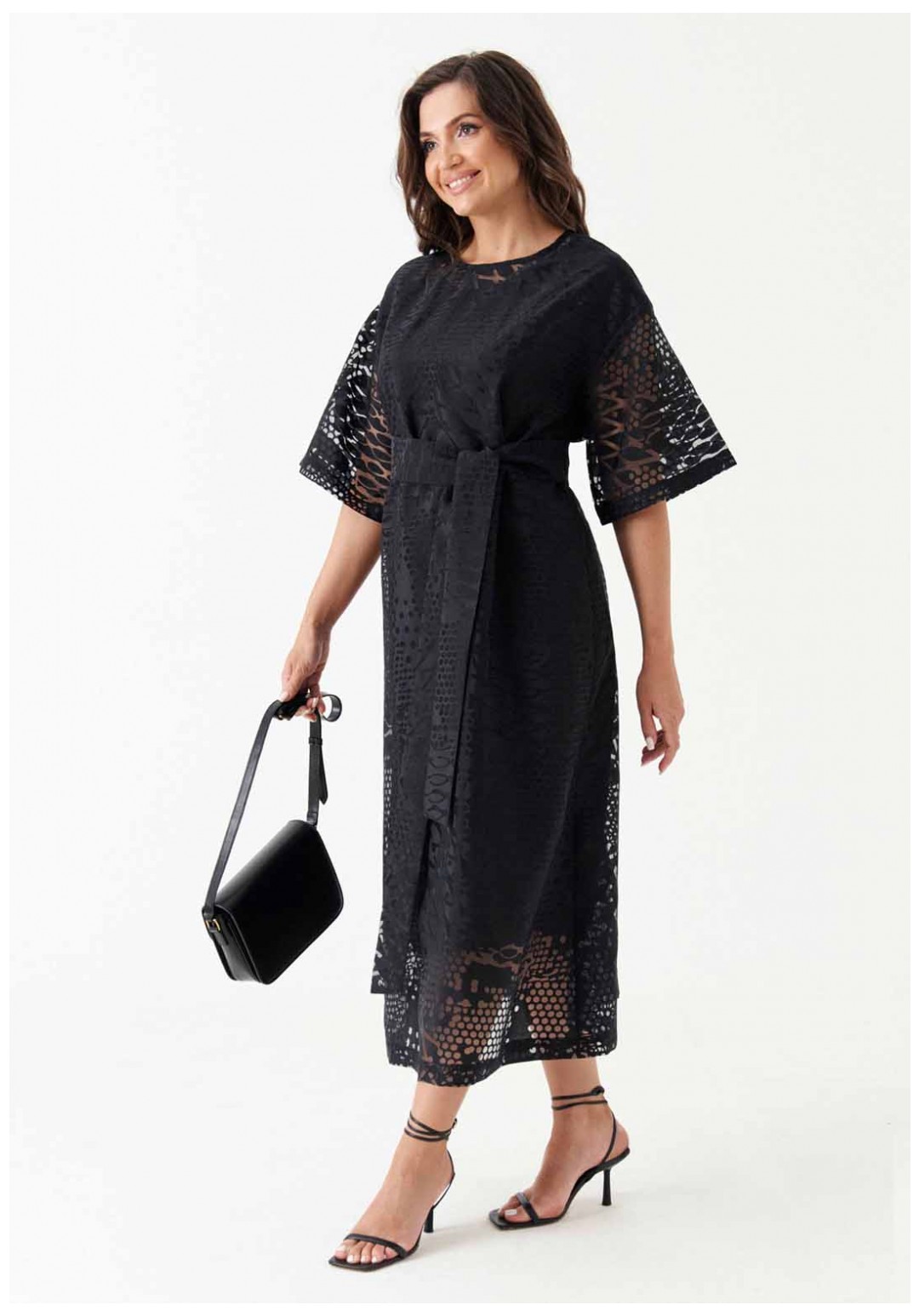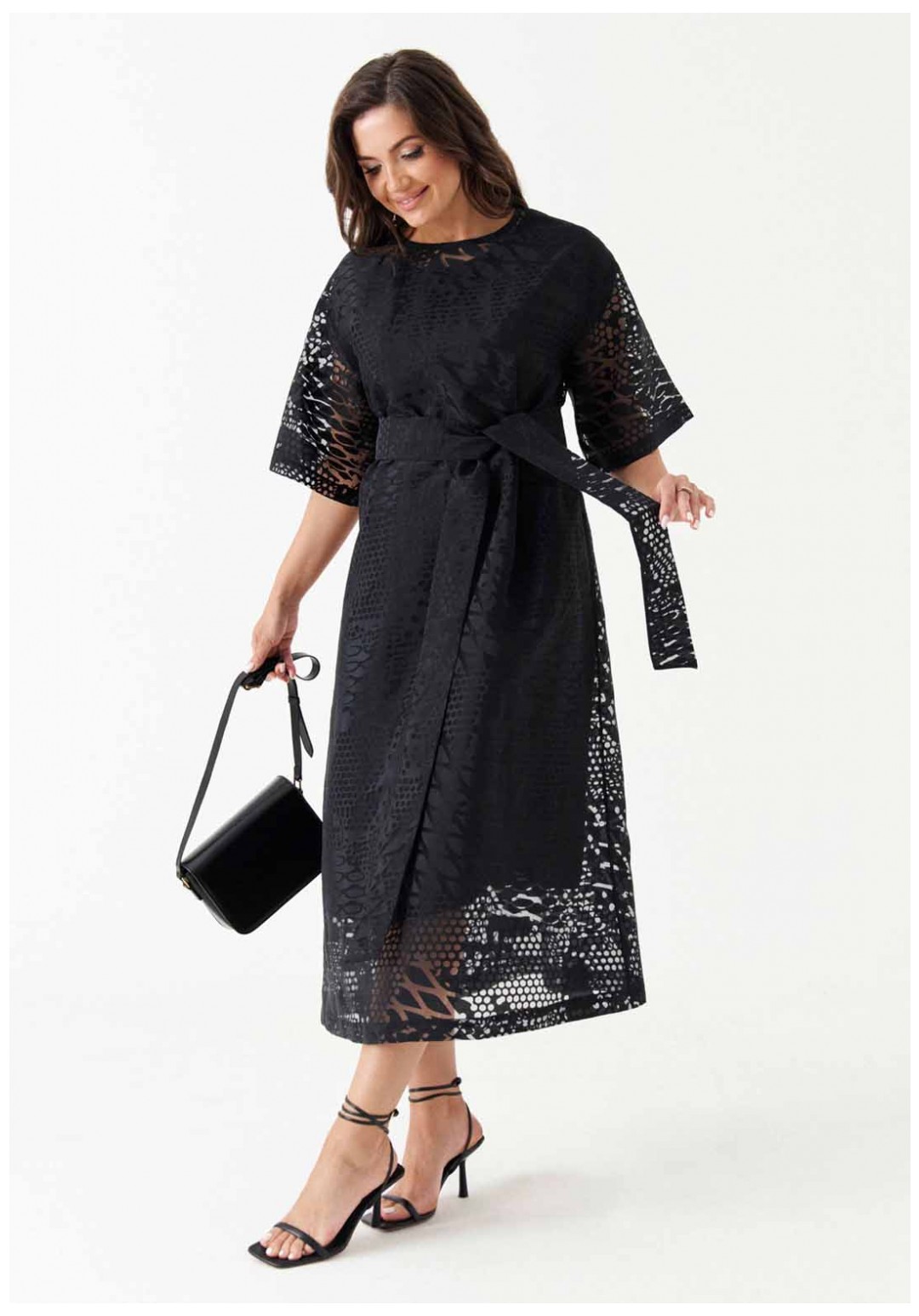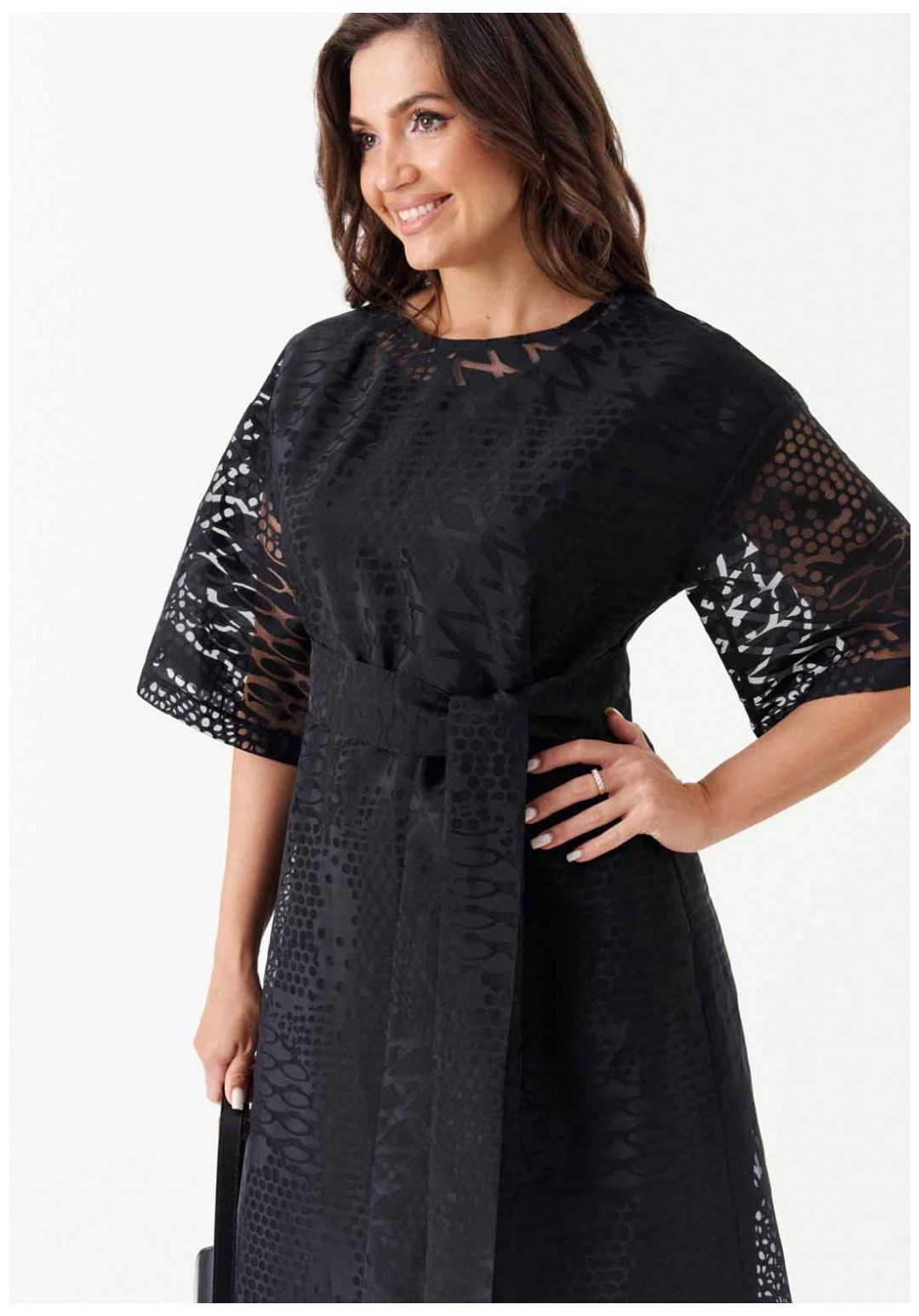 Платье расширенного силуэта с поясом из основной ткани подчёркивает женственность и создаёт лёгкий, романтичный образ. Спинка с разрезом и застёжкой-петлёй, а также слегка расширенная горловина добавляют модели элегантности. Короткие расширенные рукава и спущенная линия плеча придают платью игривость. Нижнее платье из вискозы обеспечивает комфорт, а платье в целом станет отличным выбором для различных мероприятий, будь то вечерняя встреча или торжественное событие.