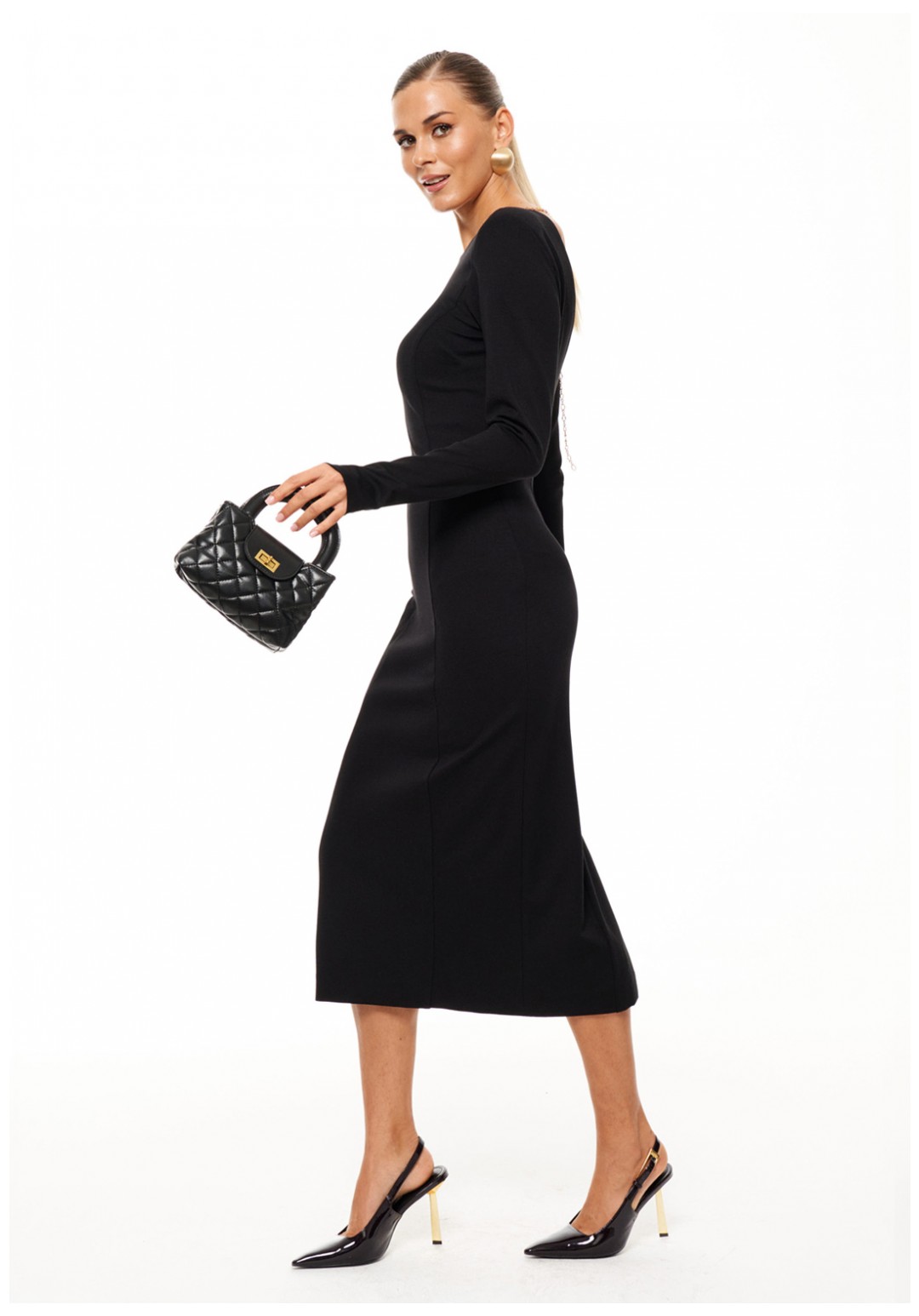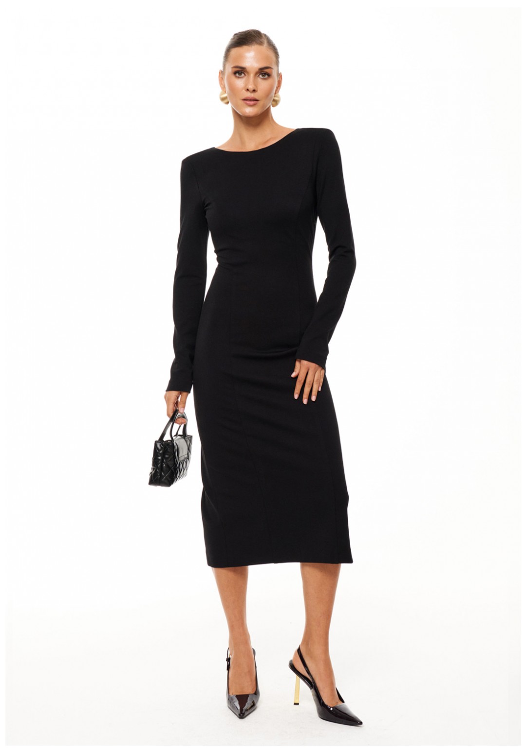 Вечернее платье длины миди прилегающего силуэта. Выполнено из вискозного трикотажного полотна. Рукав полноценной длины. По переду через центры груди проходят два рельефа. По спинке также имеются рельефы и глубокий V-образный вырез с декоративной золотой цепочкой на карабинах, которую можно снять при желании. Также по спинке идёт высокая шлица.