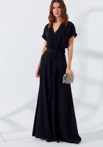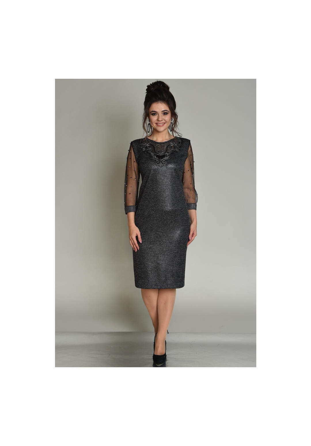 Нарядное платье полуприталенного силуэта из мягчайшего трикотажа, мерцающего при определенном освещении серебром. Верх горловины округлый отделан готовой кружевной вставкой, которая состоит из ажурно выложенного кантика и пришивных черных пайеток. Рукава 3/4 из прочной тянущейся сетки с набитыми жемчужинами и вшитыми мельчайшими пайетками. Манжет состоит из основной ткани платья.Спинка со средним швом и талиевыми вытачками. Застежка- потайная молния по центру спинки. Имеется щлица. Длина по центру спинки в 50р- 100 см. Длина рукава- 47 см.