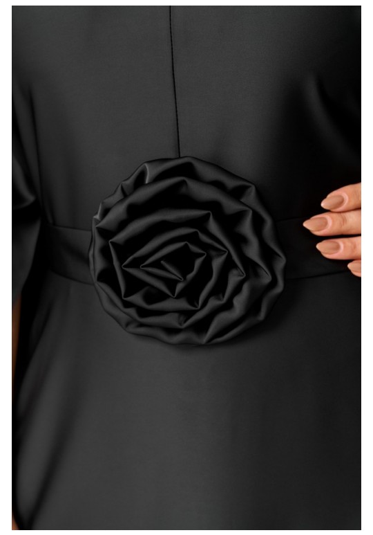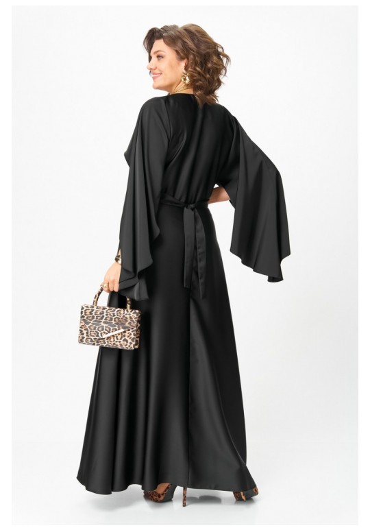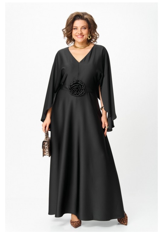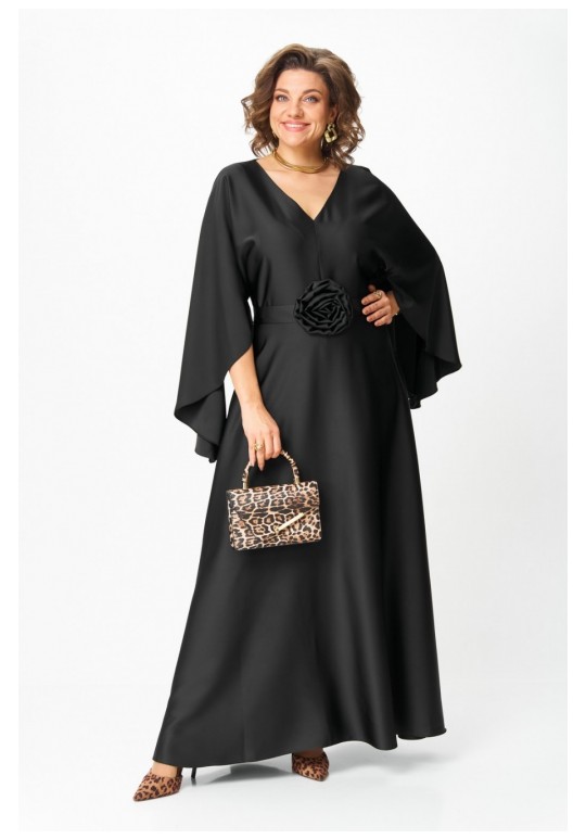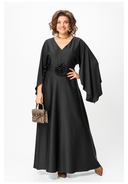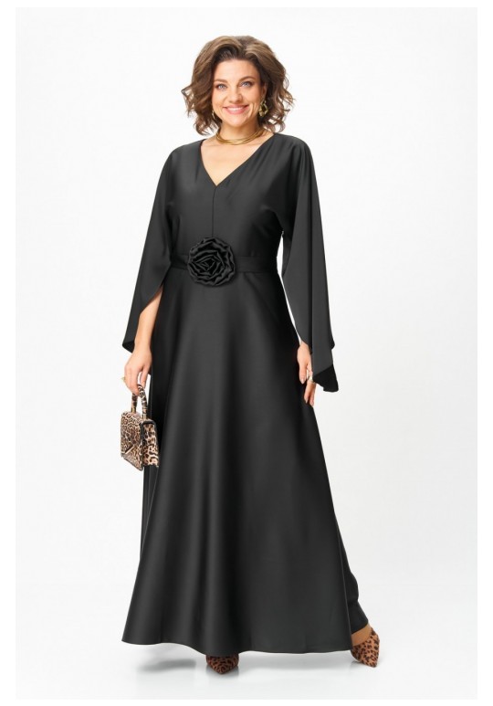 Платье женское вечернее полуприлегающего силуэта с расширением понизу. Вырез горловины v- образный. Застежка на потайную молнию в левом боковом шве. Платье отрезное по линии талии, нижняя часть переда и спинки расклешенная. Цельнокроеные рукава волнообразной формы добавляют романтичности и легкости. По линии талии съемный пояс с украшением ручной работы в виде цветка. Такое платье отлично подойдет как для вечернего выхода, так и для более формальных событий. Длина по спинке: 142 см Длина рукава от горловины: 80 см