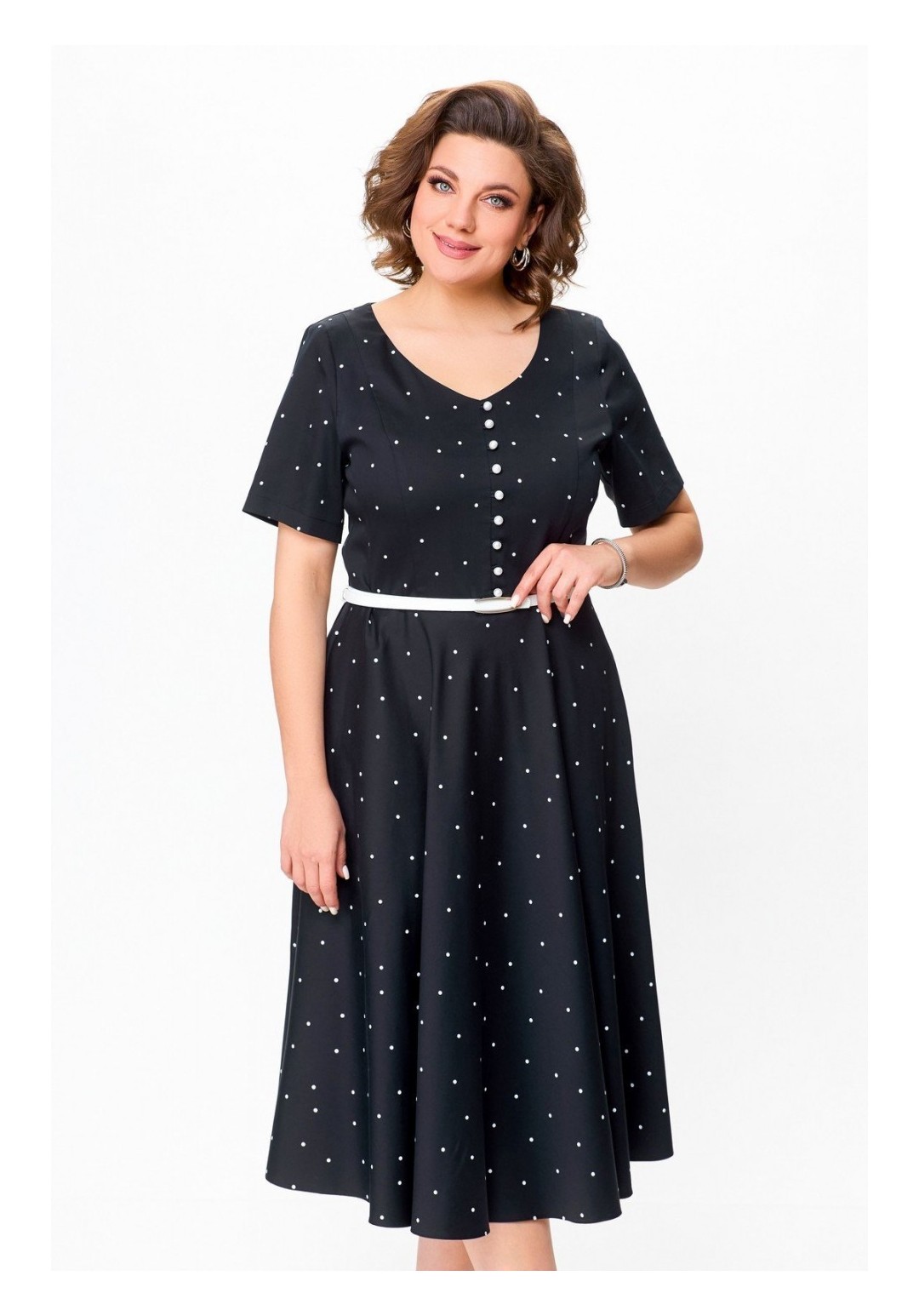 Платье из хлопка Х-образного силуэта с полуприлегающим лифом. Платье отрезное по линии талии. Перед лифа с рельефами, выходящими из плечевого шва. В центральном шве лифа ряд навесных петель с декоративными пуговицами, спинка лифа с талиевыми выточками. Горловина V-образной формы, рукав втачной, короткий. Застёжка в боковом шве на потайную тесьму-молнию. Длина рукава 25 см. Длина изделия по спинке – 117см. В комплекте ремень с декоративной пряжкой.