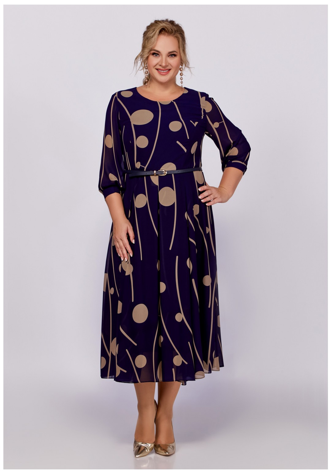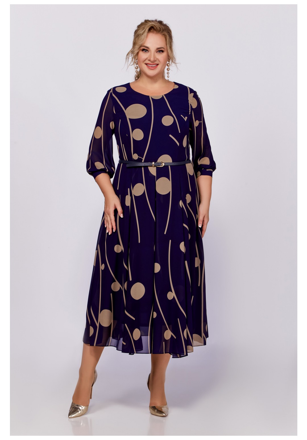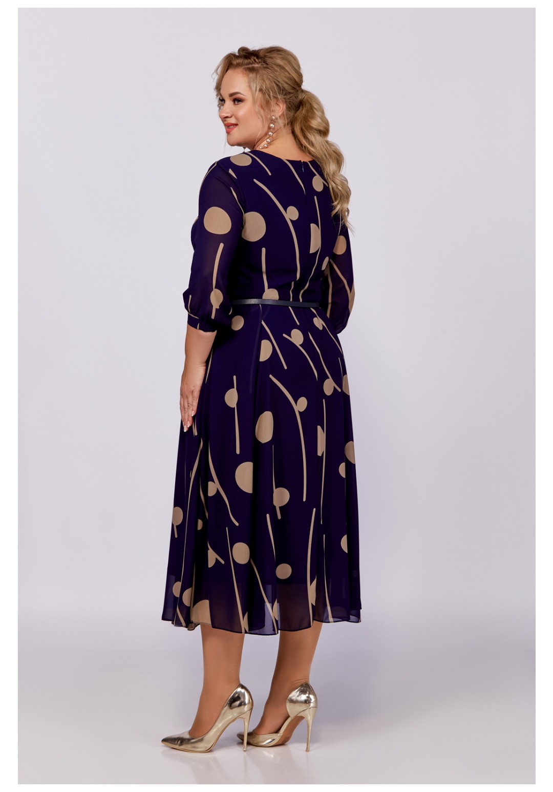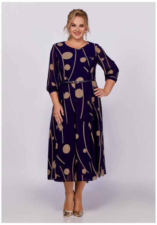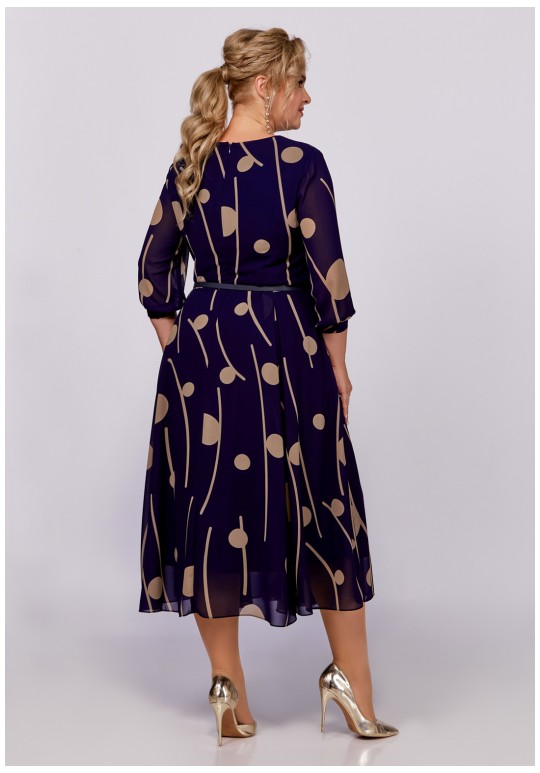 Платье из шифоновой ткани на трикотажной подкладке, Х-образного силуэта с полуприлегающим лифом. Платье отрезное по линии талии. По переду лифа расположены рельефы, по спинке лифа талиевые выточки. Юбка расклешенная из шести клиньев со встречными складками по линии талии. В среднем шве спинки предусмотрена молния. Рукав втачной длиной ¾, по низу манжета с эластичной вставкой .