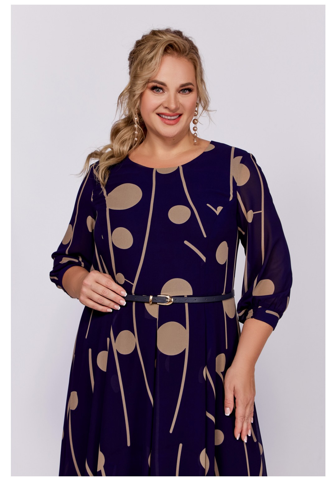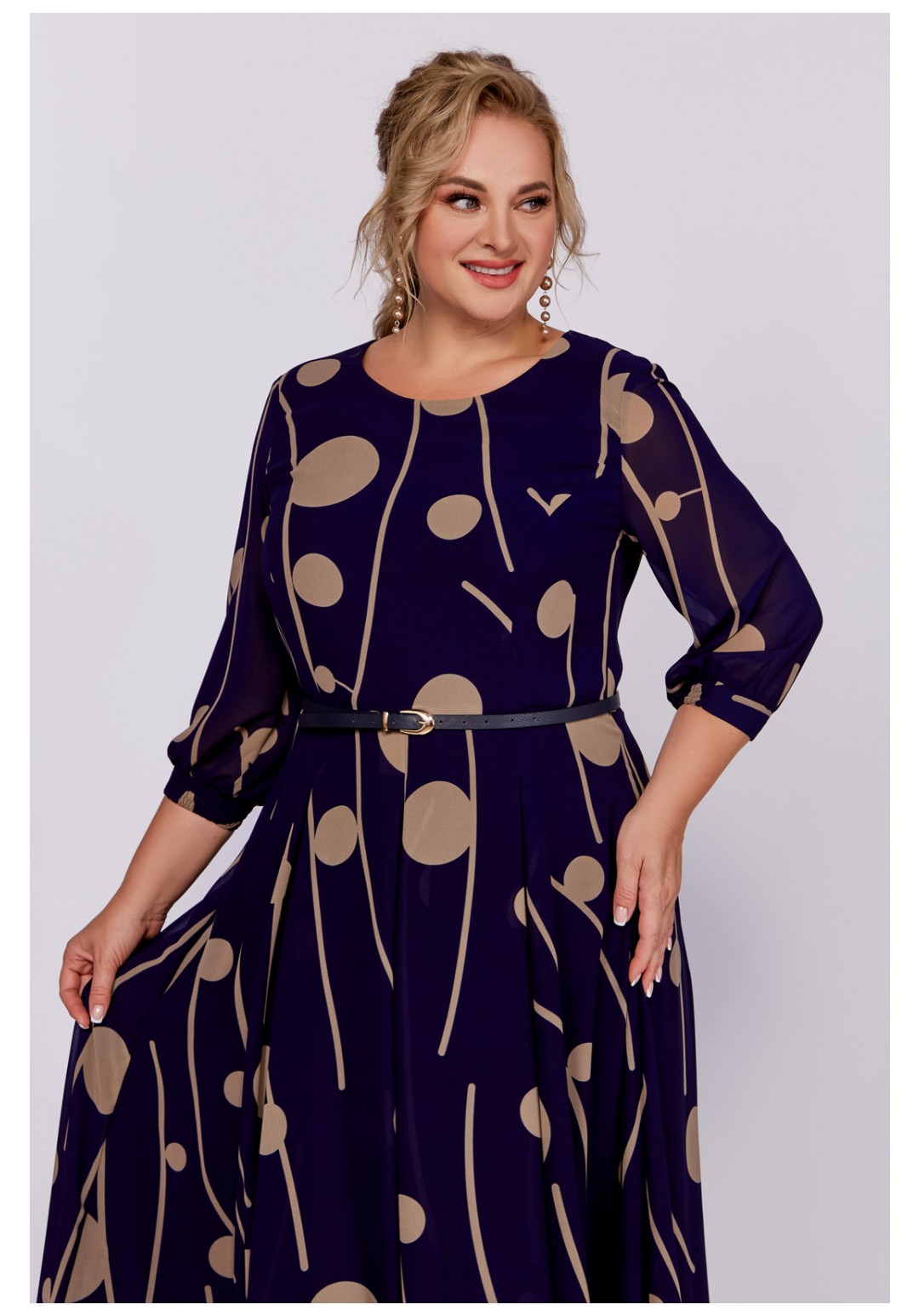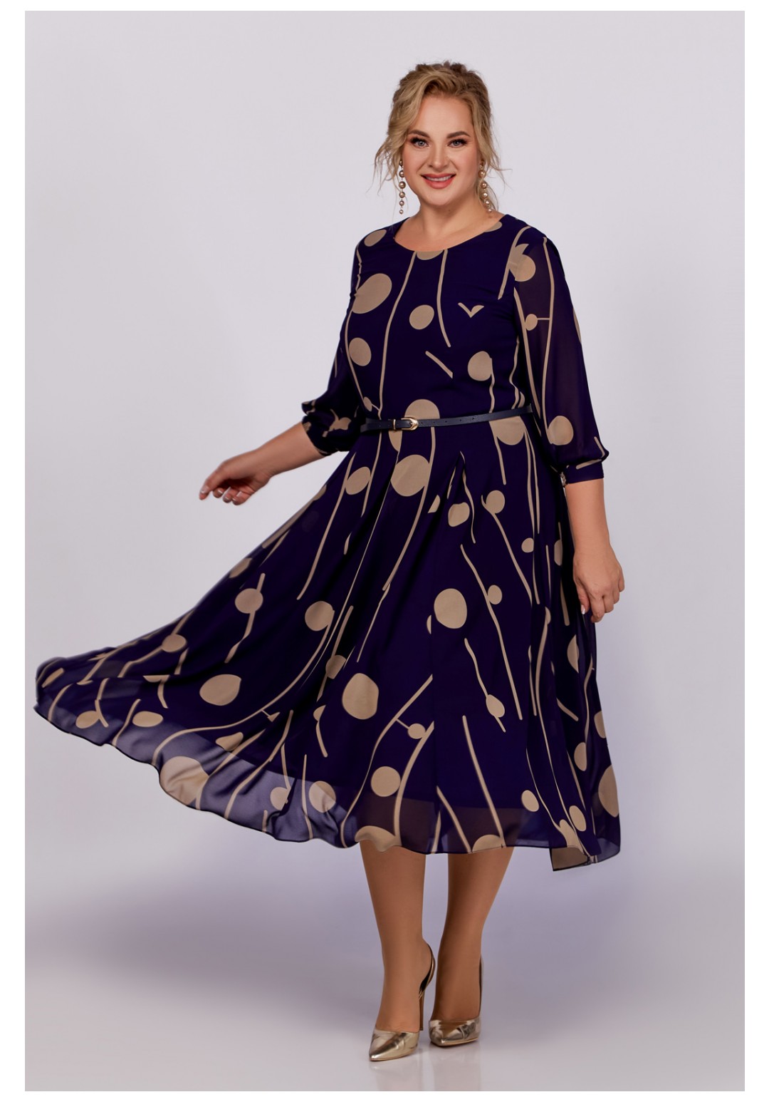 Платье из шифоновой ткани на трикотажной подкладке, Х-образного силуэта с полуприлегающим лифом. Платье отрезное по линии талии. По переду лифа расположены рельефы, по спинке лифа талиевые выточки. Юбка расклешенная из шести клиньев со встречными складками по линии талии. В среднем шве спинки предусмотрена молния. Рукав втачной длиной ¾, по низу манжета с эластичной вставкой .