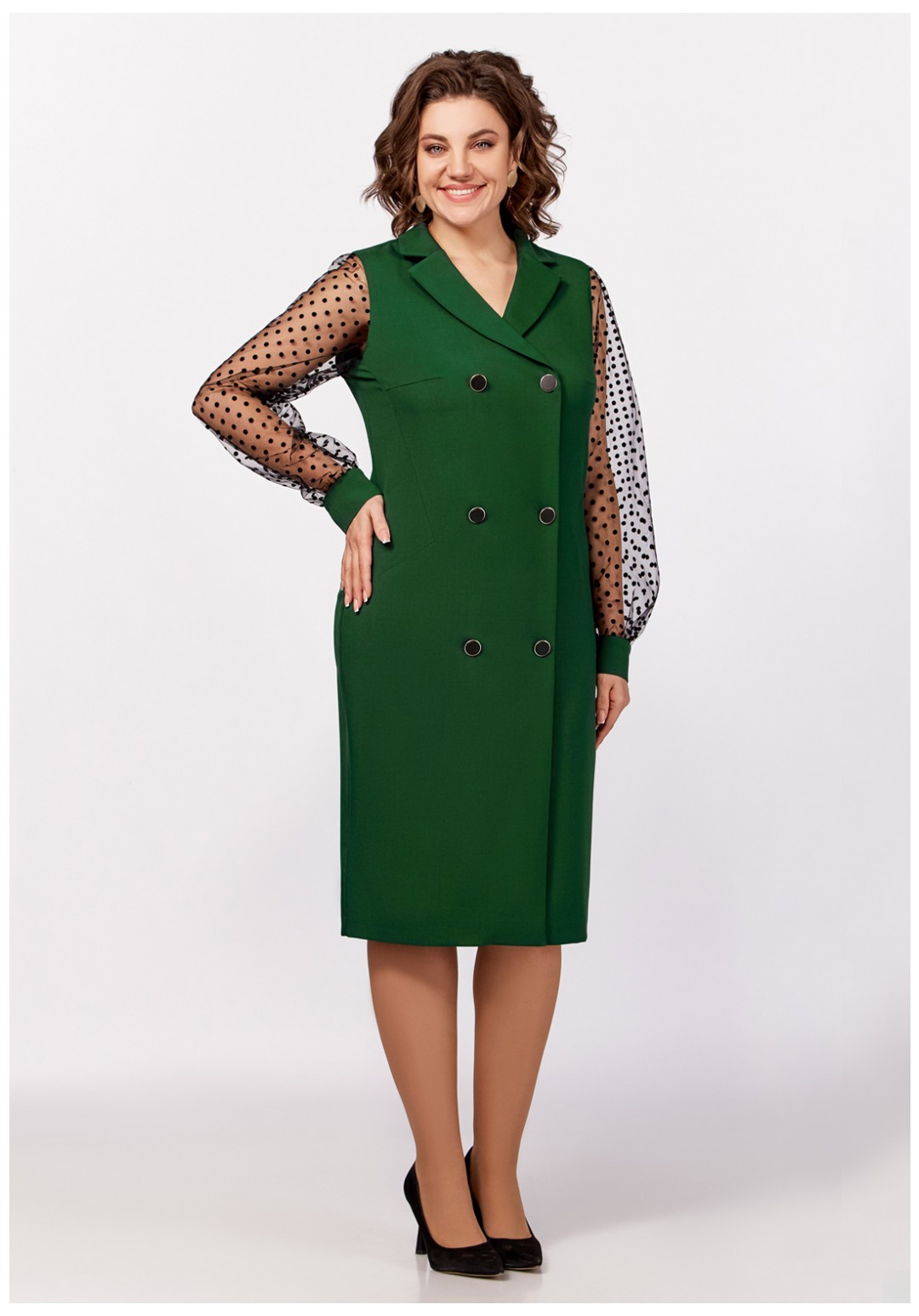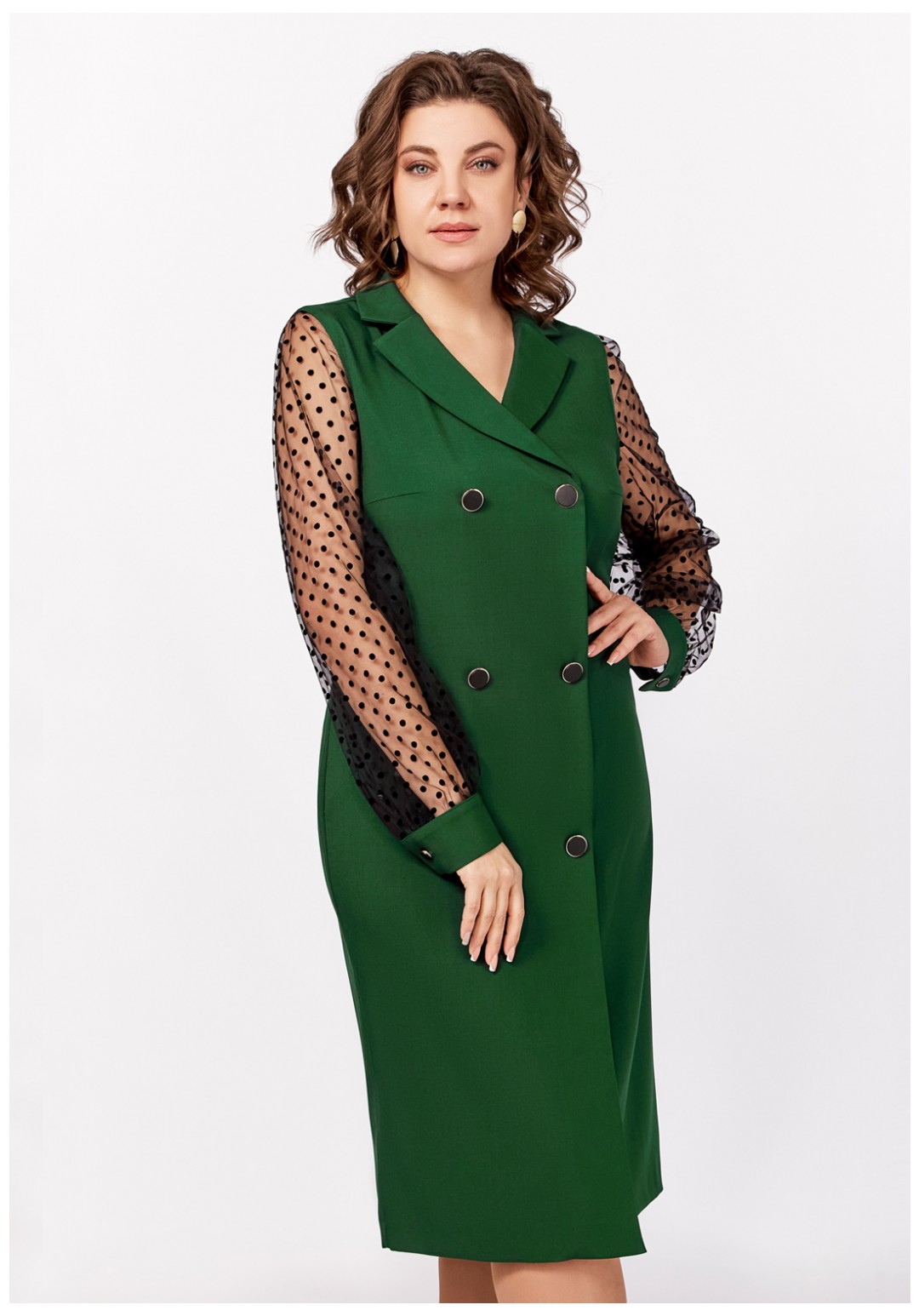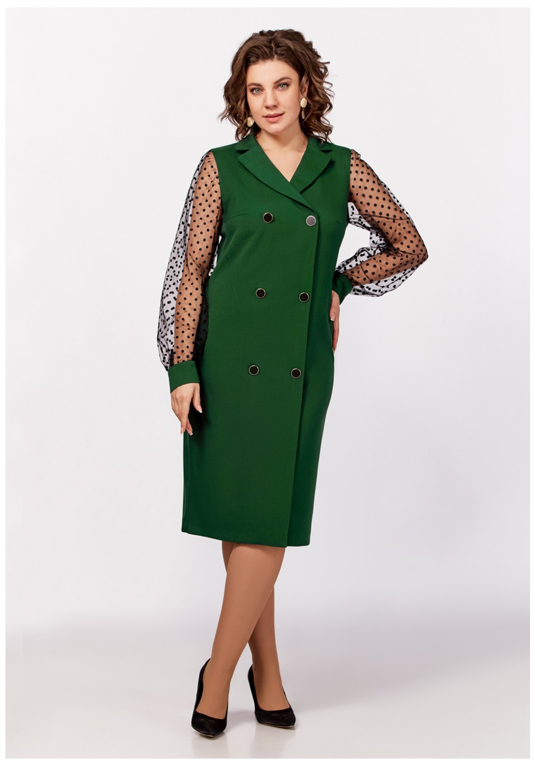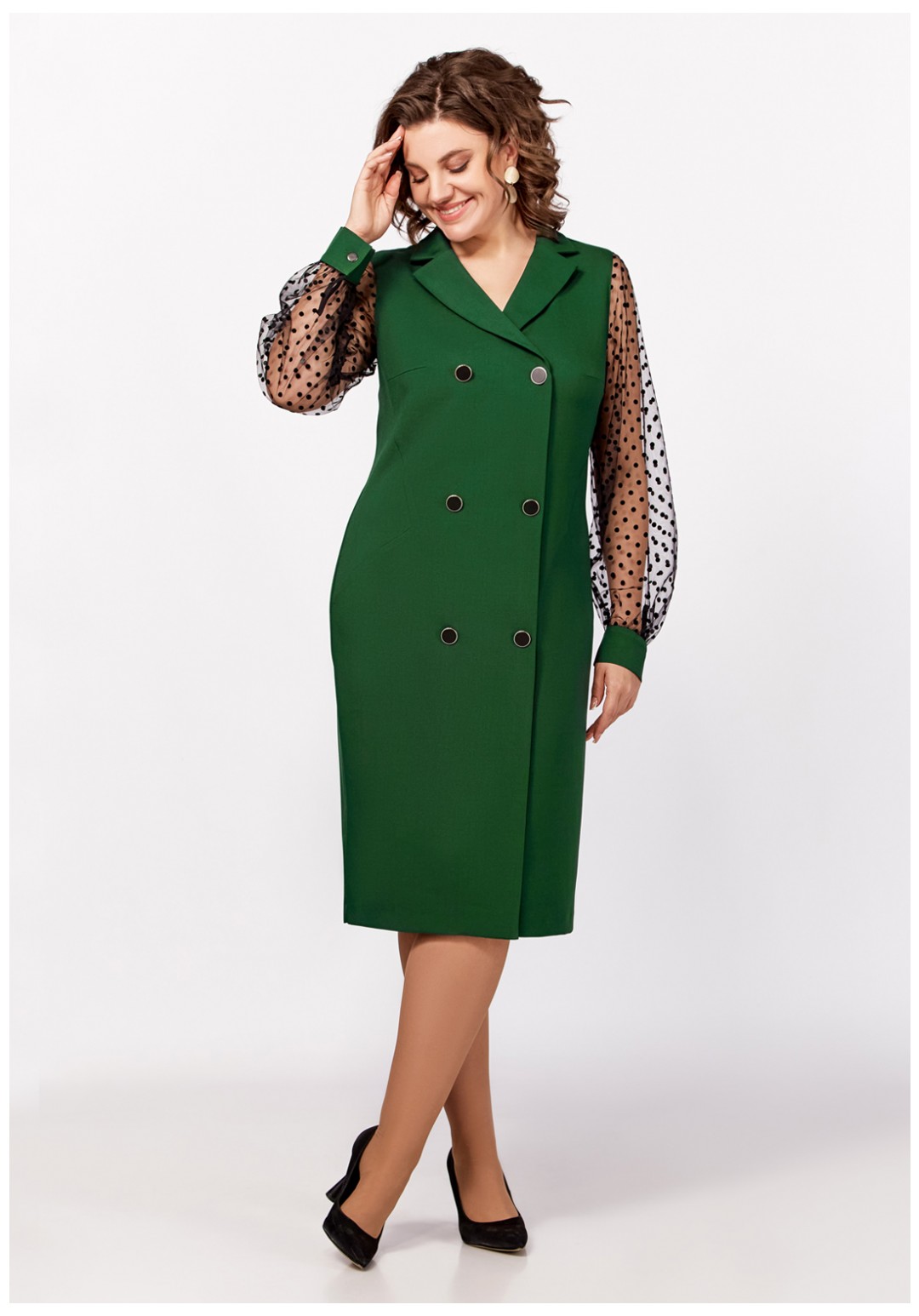 Нарядное платье из поливискозной ткани полуприлегающего силуэта. Спереди имитация двубортной застёжки с декоративными пуговицами в два ряда. Полочки с фигурными бочками и нагрудными выточками. Спинка с центральным швом и талиевыми выточками. Горловина V-образной формы с отложными лацканами и воротником пиджачного типа. Рукав втачной длинный из отделочной ткани "сетка", по низу со сборкой и манжетой из основной ткани, застёгивающейся на петлю и декоративную пуговицу. В боковом шве застёжка на потайную тесьму-молнию.