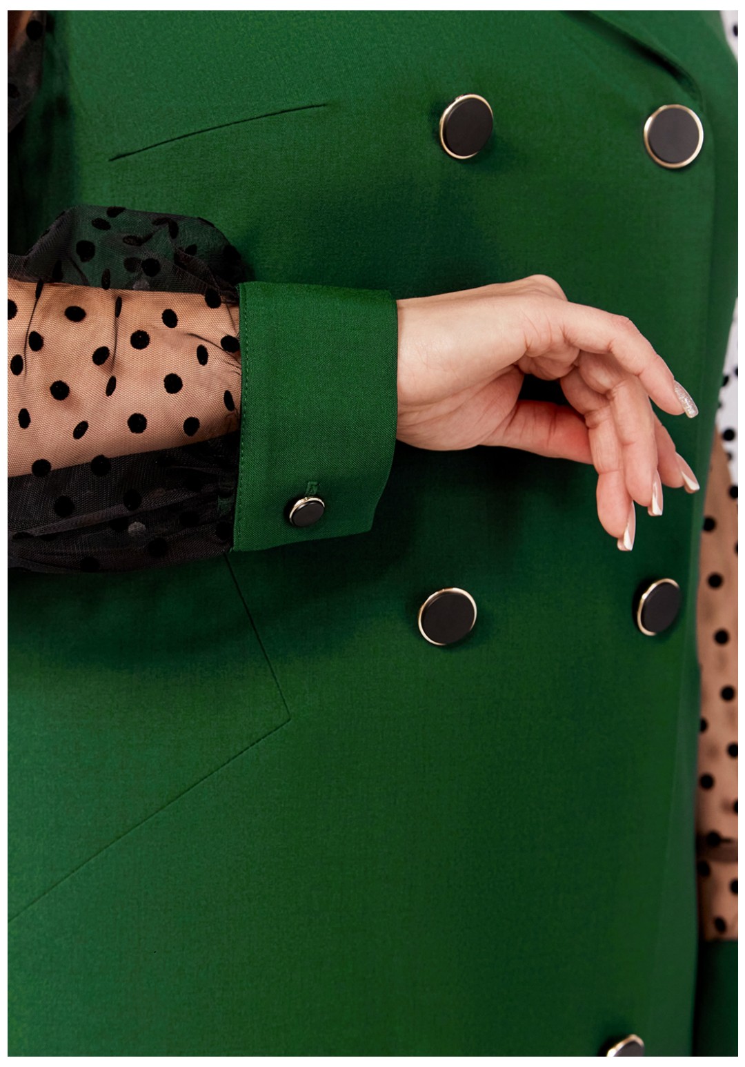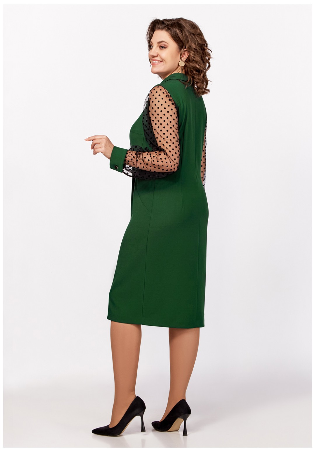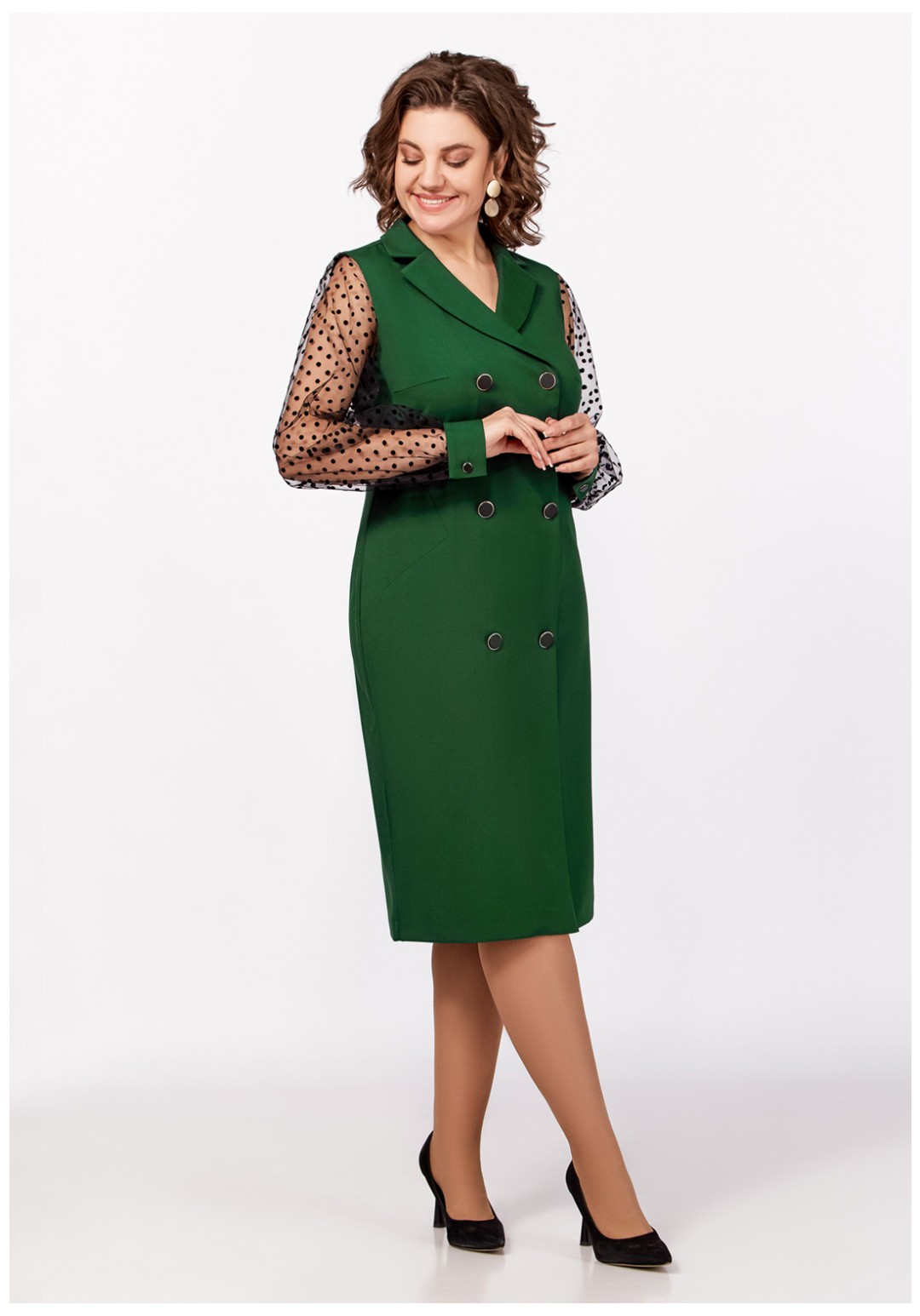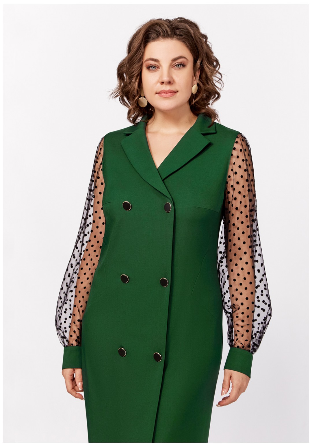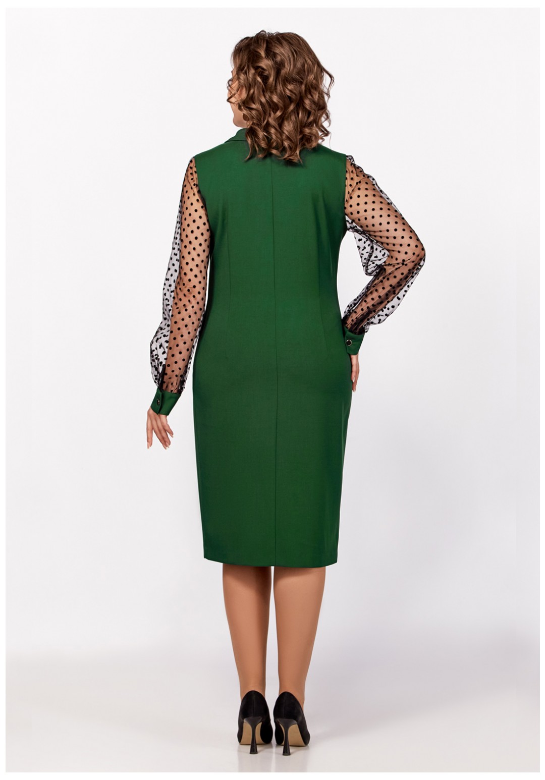 Нарядное платье из поливискозной ткани полуприлегающего силуэта. Спереди имитация двубортной застёжки с декоративными пуговицами в два ряда. Полочки с фигурными бочками и нагрудными выточками. Спинка с центральным швом и талиевыми выточками. Горловина V-образной формы с отложными лацканами и воротником пиджачного типа. Рукав втачной длинный из отделочной ткани "сетка", по низу со сборкой и манжетой из основной ткани, застёгивающейся на петлю и декоративную пуговицу. В боковом шве застёжка на потайную тесьму-молнию.
