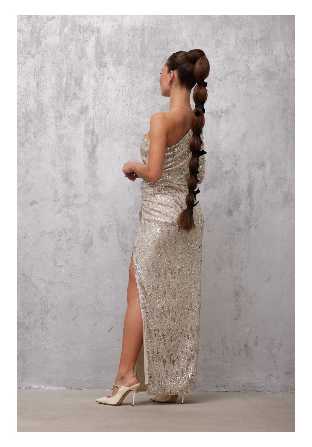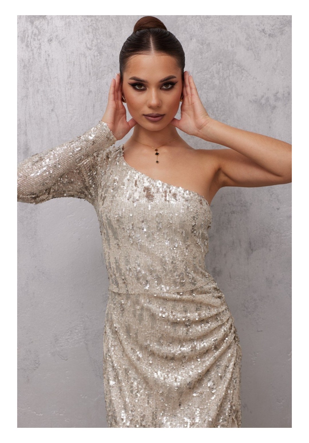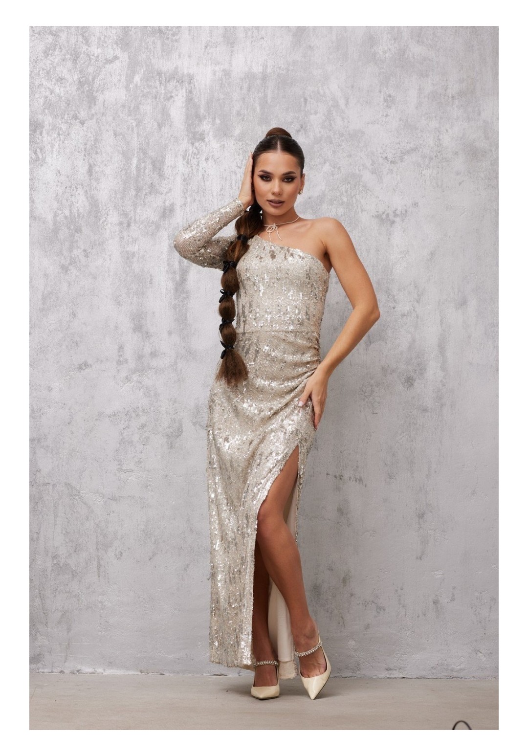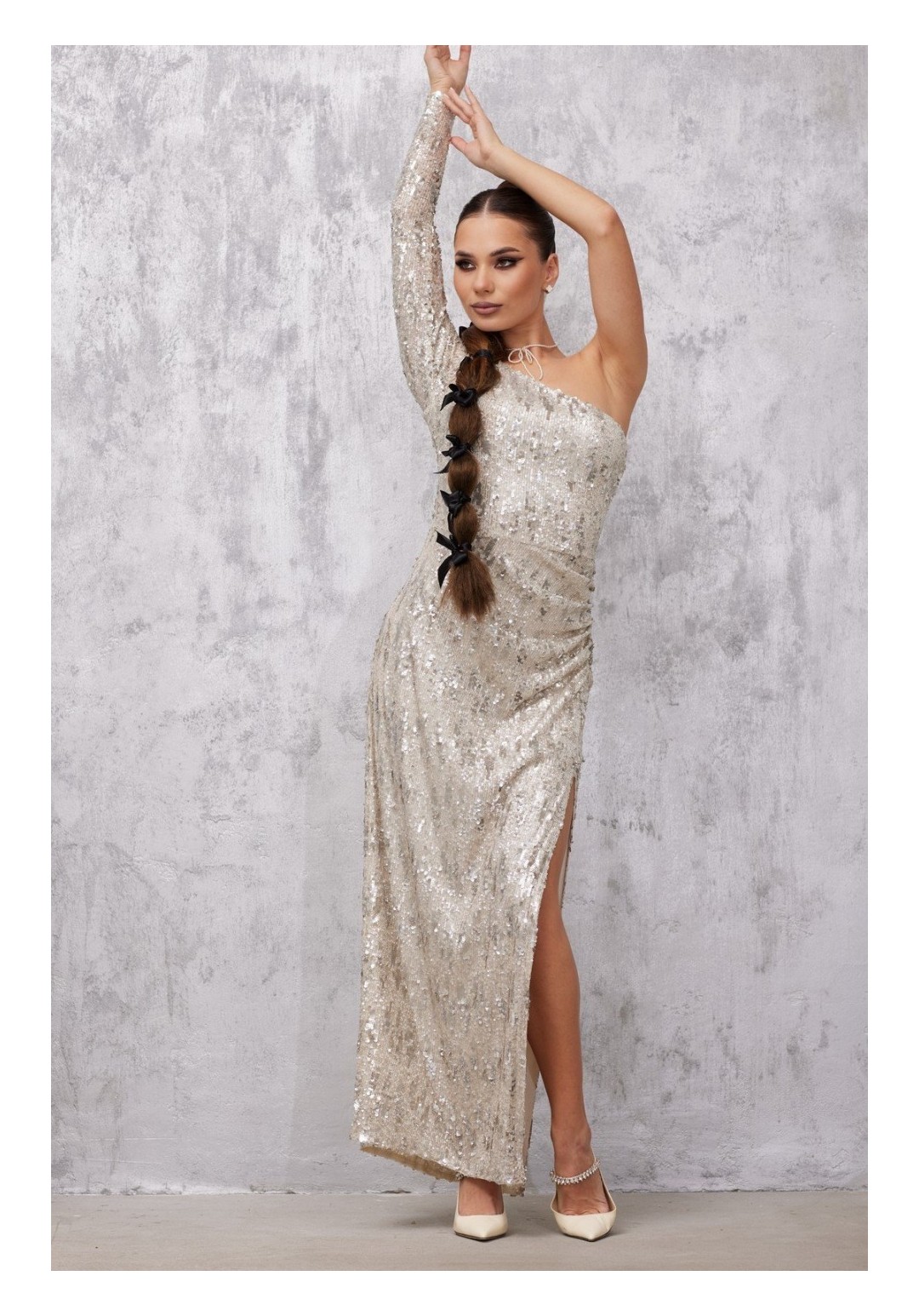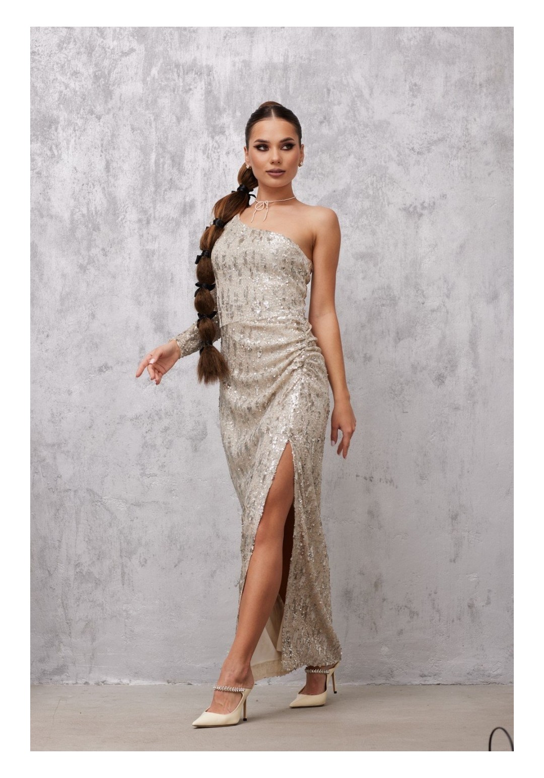 Элегантное длинное платье на одно плечо, выполненное из блестящего трикотажного полотна пайетки. Эффектный серебристый цвет создает иллюзию звездного неба на вашем наряде. Платье обладает прилегающим силуэтом, подчеркивающим фигуру, и дополнено узким длинным рукавом. Интригующий элемент — высокий разрез на боку, украшенный сборкой, добавляет изюминку и делает образ более динамичным. Встроенная подкладка обеспечивает комфорт при носке. Это платье станет изысканным выбором для торжественного мероприятия или вечернего выхода.