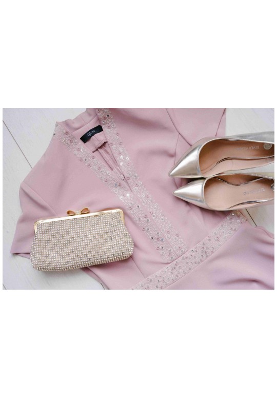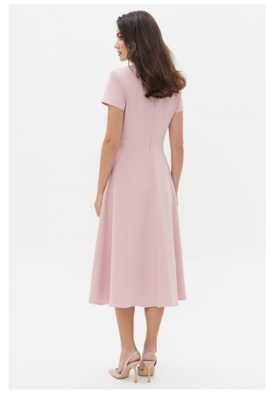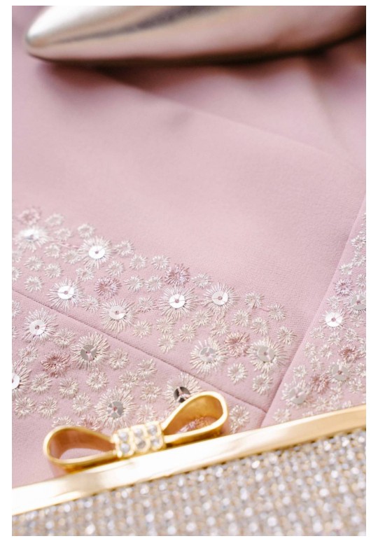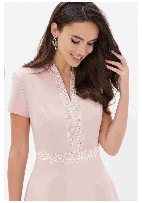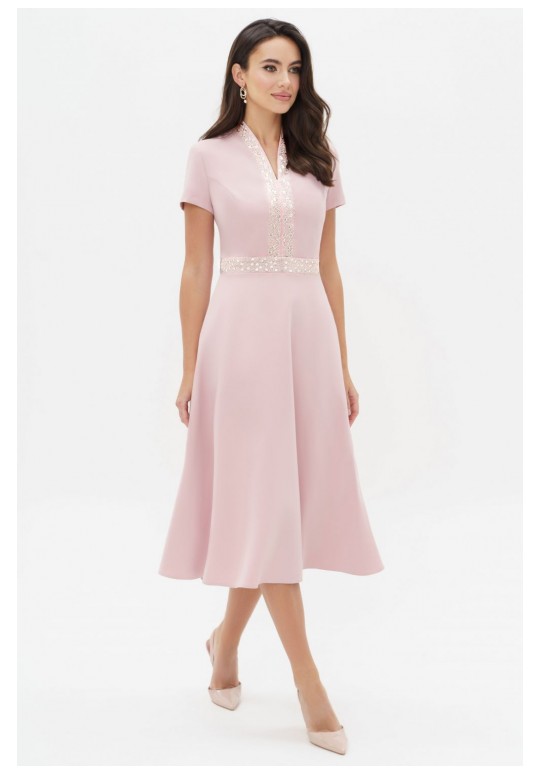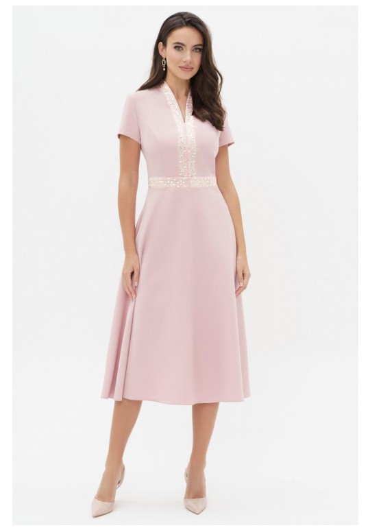Летнее платья с дизайнерской вышивкой – это всегда восхитительные и женственные образы, позволяющие выглядеть роскошно и привлекательно. Платье женское из костюмно-плательной ткани, силуэта песочные часы, отрезное по линии талии с притачным поясом, длиной миди, с декоративной вышивкой. Верхняя часть переда (лиф) с рельефными швами, идущими от притачного пояса до проймы и швом посередине переда. Спинка (лиф) со средним швом, в котором обработана застежка на потайную тесьму-молнию и с рельефными швами от проймы до шва притачивания пояса. Нижняя часть платья (юбка) расклешенная книзу. В боковых ниже талии расположены карманы в швах. Рукава втачные одношовные, короткие. Горловина V-образной формы обтачная, с цельнокроеным воротником стойкой. По притачному поясу переда и центральным деталям вдоль горловины расположена декоративная вышивка с пайетками. Длина платья по среднему шву спинки до низа - 119,0 см (±3,0 см), Длина рукава платья - 17,0 см (±1,0 см). Тип ткани: костюмно-плательная.