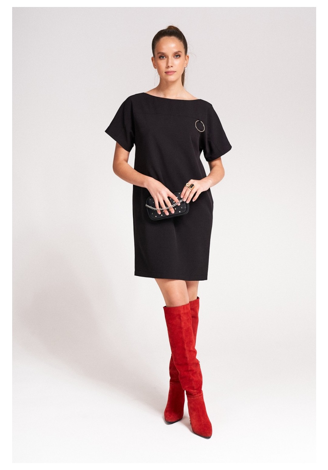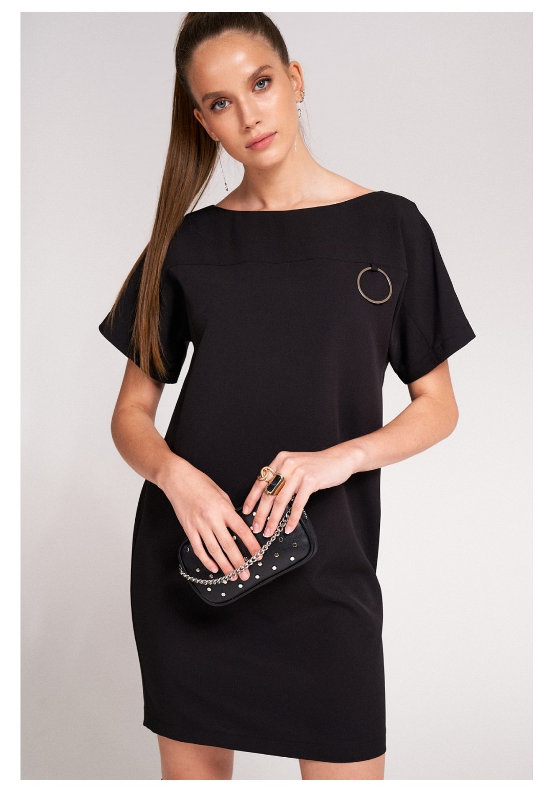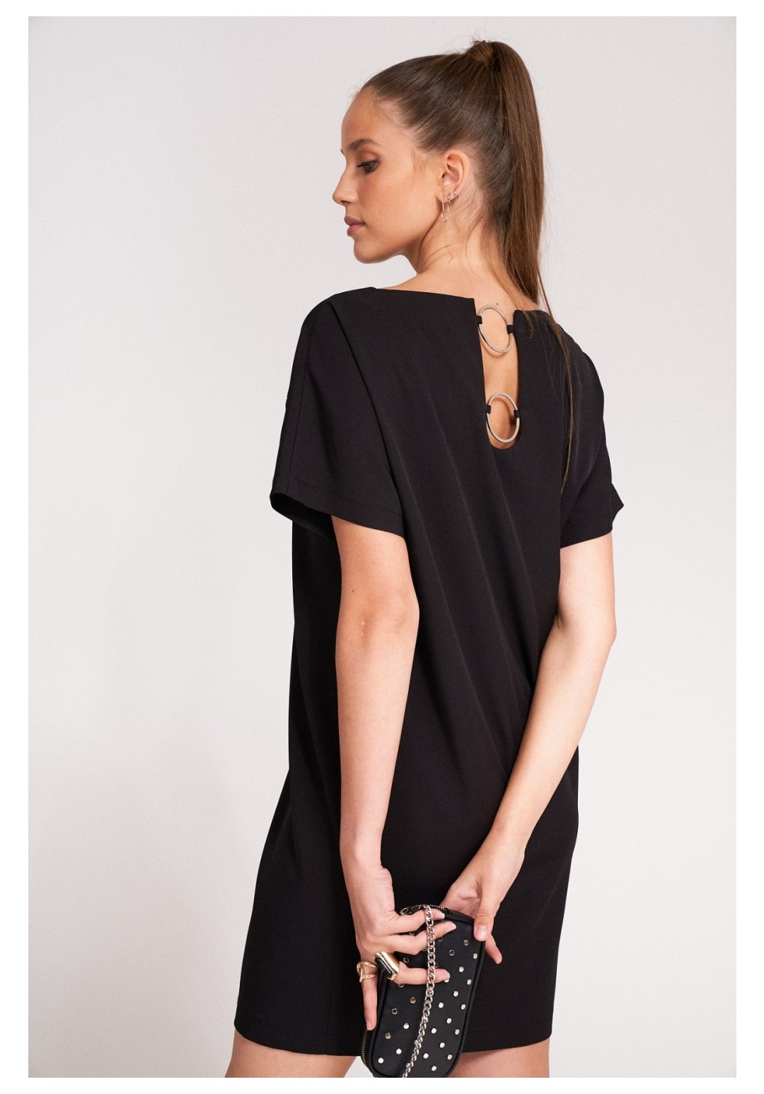 Платье женское свободного кроя, прямого силуэта с цельнокроеным рукавом. Горловина – лодочка. На левой стороне переда декоративное металлическое кольцо. Спинка с фигурным вырезом, украшена металлическими кольцами. Длина рукава от горловины - 29 см. Длина изделия - 90 см.