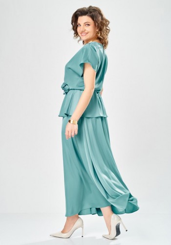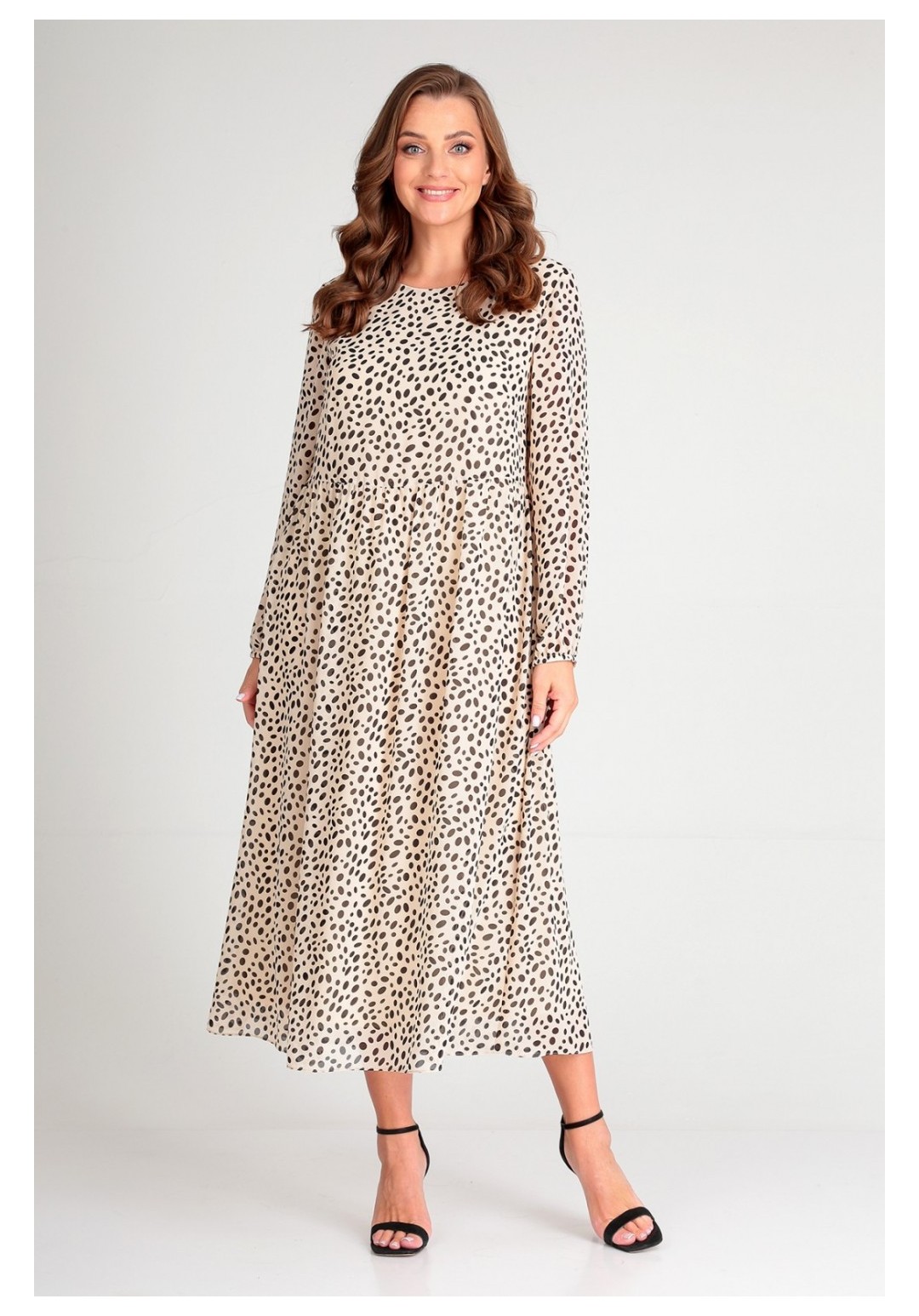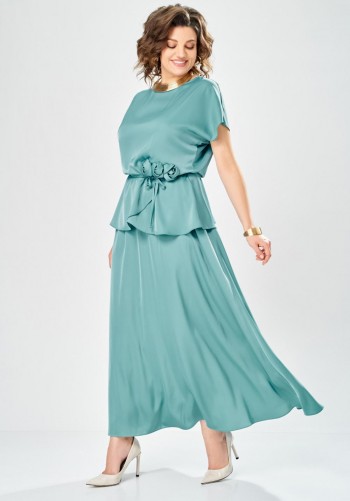 Шифоновое платье свободного силуэта на трикотажной подкладке. Горловина овальной формы. Платье отрезное чуть выше линии талии, на сборке. Рукав втачной. Низ рукава собран на эластичную тесьму Длина платья по середине спинки: 124 см. Длина рукава: 60 см.