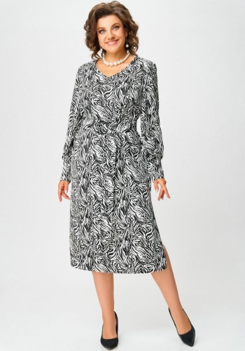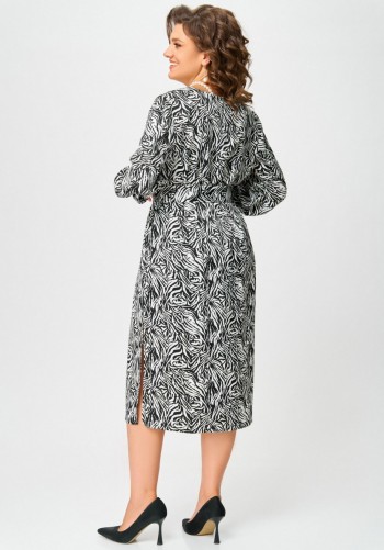 Платье выполнено из трикотажного полотна высокого качества. Платье приталенного силуэта, отрезное по линии талии. Лиф платья с нагрудными вытачками и застёжкой поло на 3 пуговицы. Рукав втачной. Юбка А-образного силуэта. Длинна платья по спинке: 123 см. Длина рукава: 21 см.
