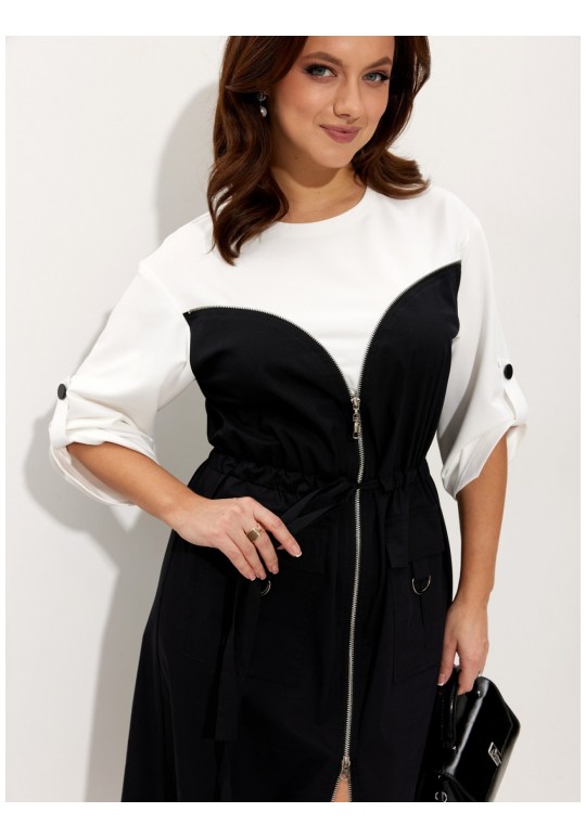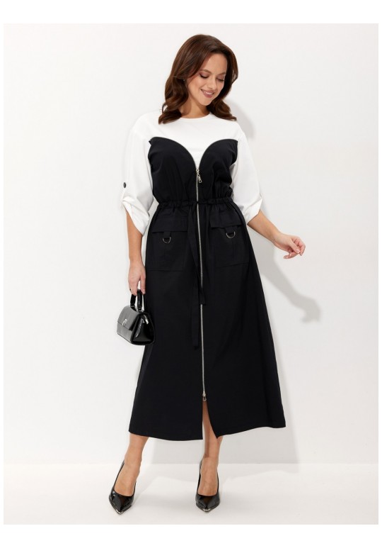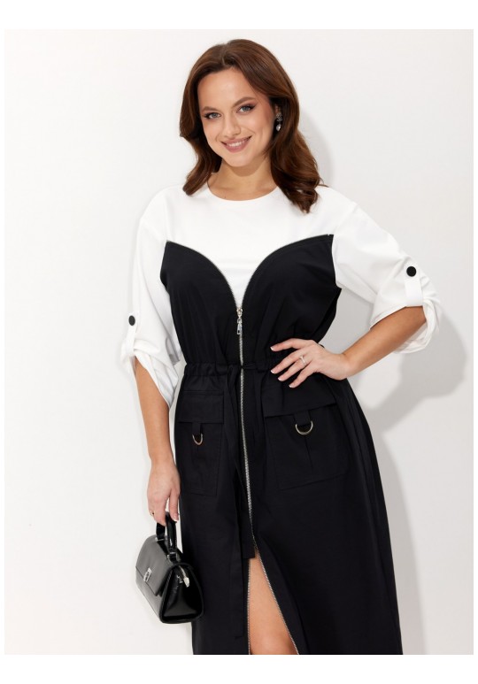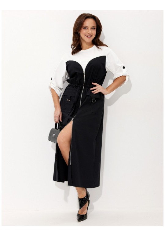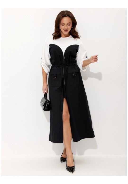 Платье. Комфорт - один из ключевых трендов современной действительности, который отлично реализуется в контексте стиля спорт-кэжуал. Его выбирает тот, кто не желает ограничивать себя жёсткими рамками, стремится выглядеть модно и динамично и не считает, что красота требует жертв. Платье выполнено из двух видов ткани: трикотажа (верхняя часть лифа платья и рукава) и хлопка (нижняя часть лифа платья и юбка). Платье отрезное по линии талии на кулисе, в которую вставлен пояс-завязка что позволяет регулировать приталивание. По переду платья от проймы вставлена декоративная молния с двумя бегунками, что позволяет регулировать высоту разреза. Спереди накладные карманы с клапаном и патой декорированной металлическим полукольцом. Спущенная линия плеча. Низ рукава поддерживается декоративной патой на петлю и пуговицу. Длина платья по середине спинки: 130 см. Длина рукава от горловины: 57 см.