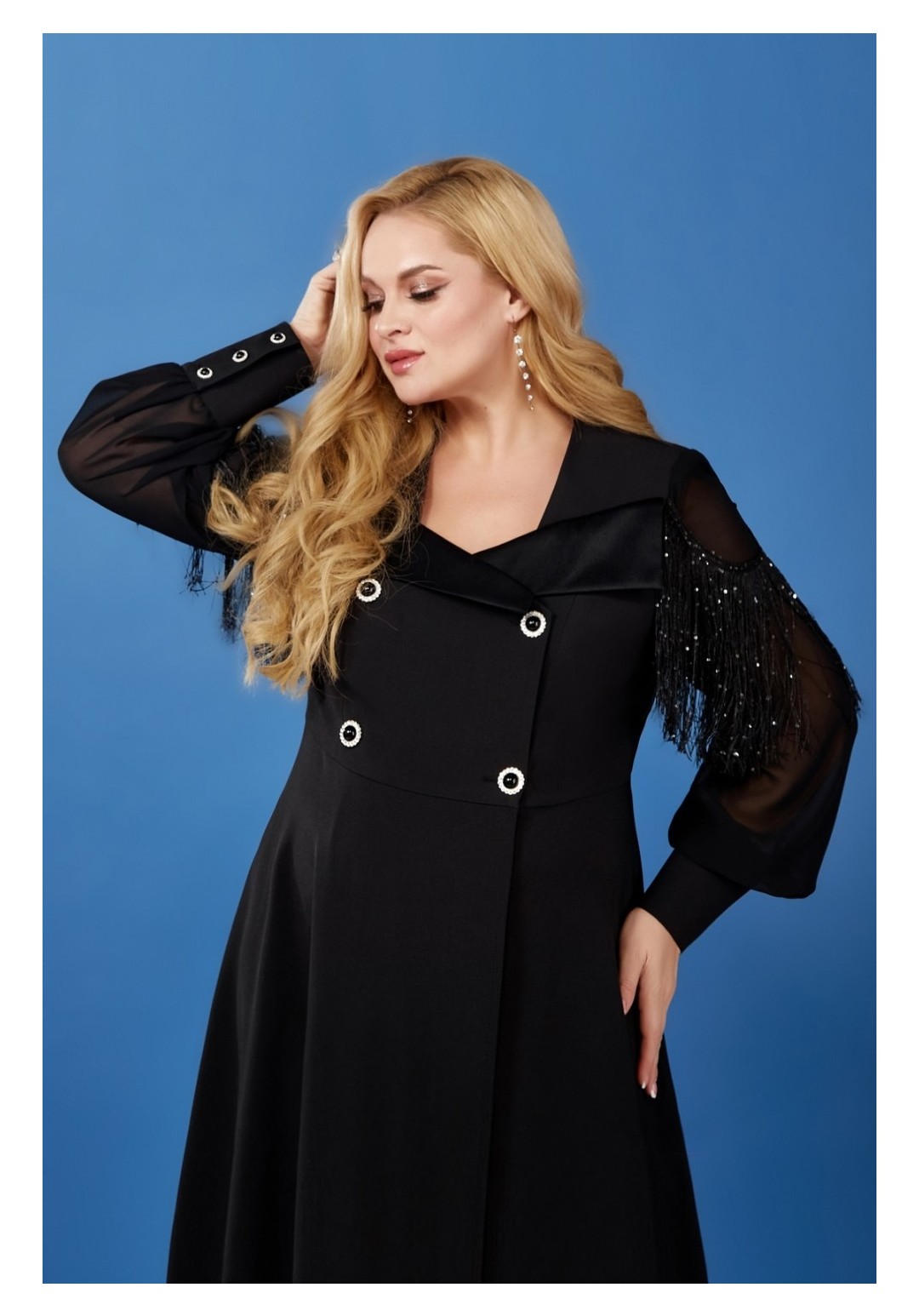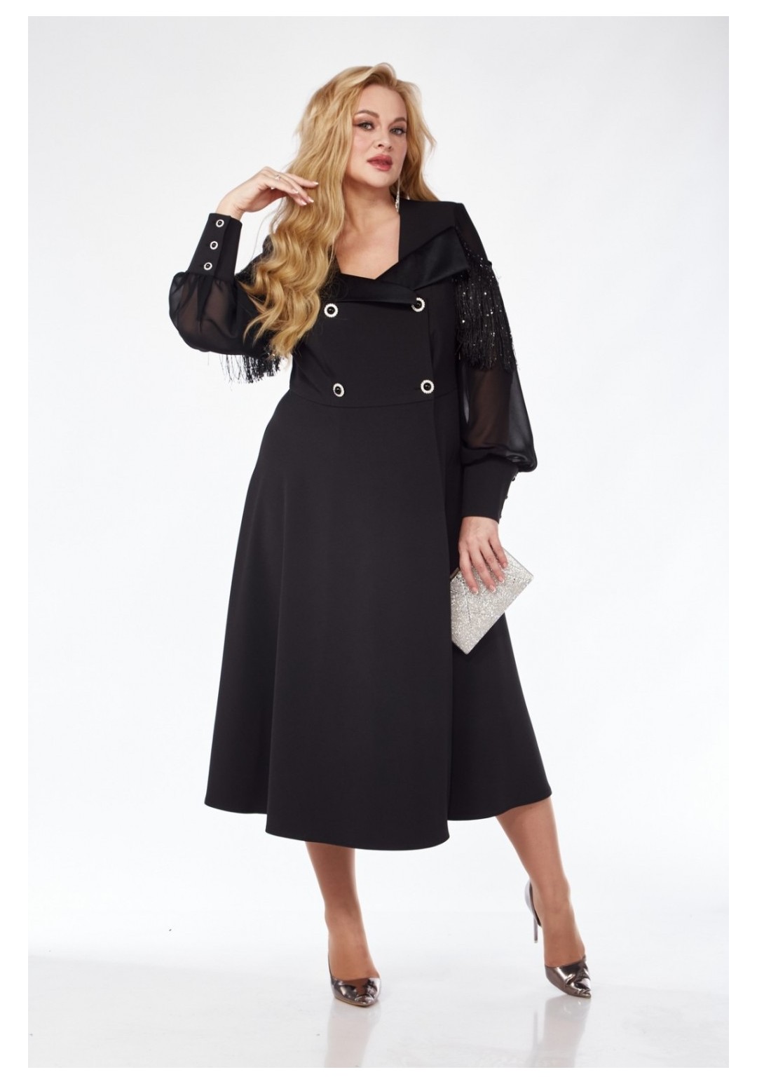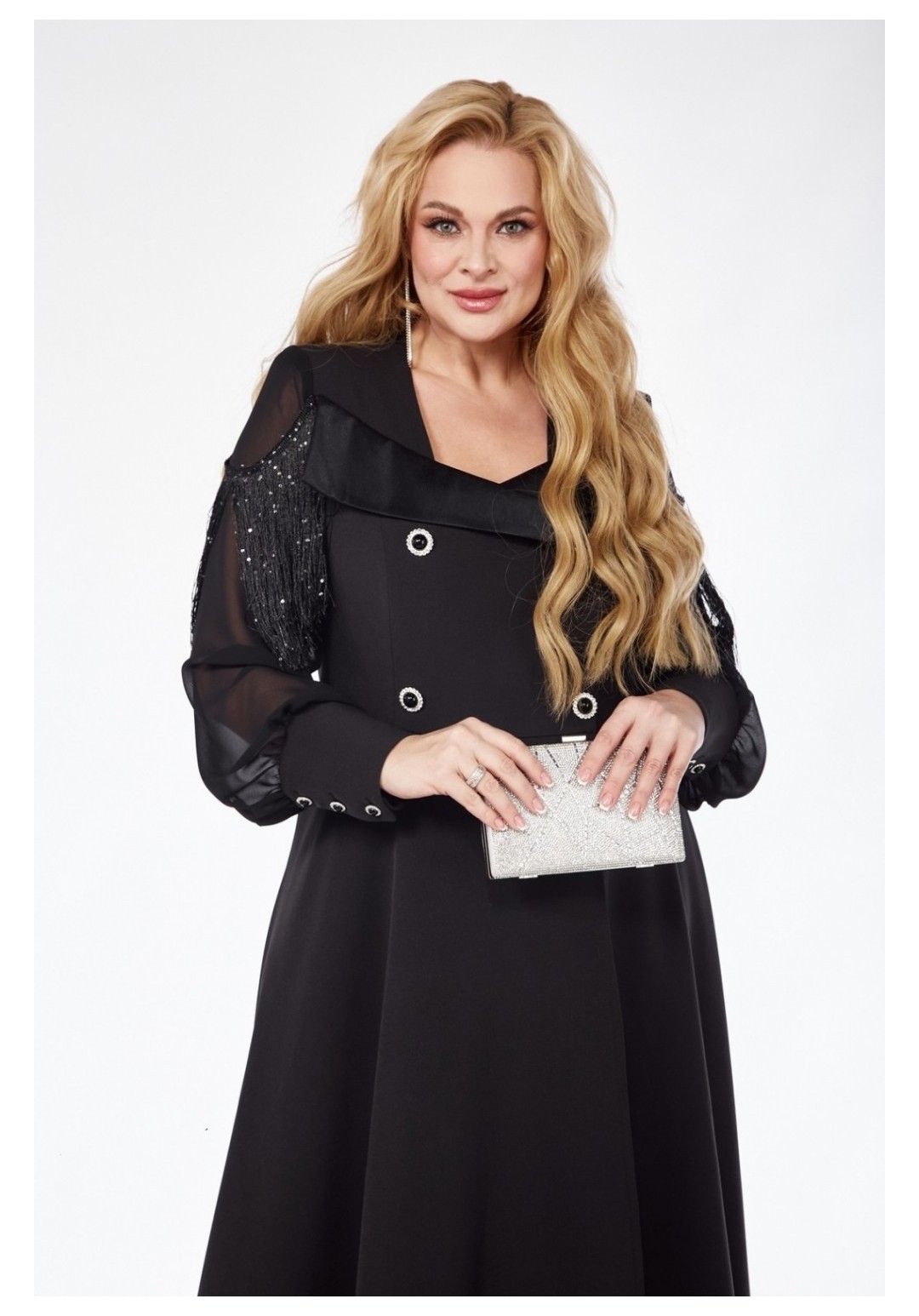 Платье с отрезным по талии лифом, фигурным декольте спереди и с двубортной застёжкой на петли-пуговицы. Рукава втачные из шифона, с высокими манжетами и со сборкой по низу. Вырез горловины декорирован лацканами из отделочной ткани, а поверх рукавов закреплена тесьма с бахромой. Низ платья с большим расширением. Лиф на подкладке. Изделие с плечевыми накладками.