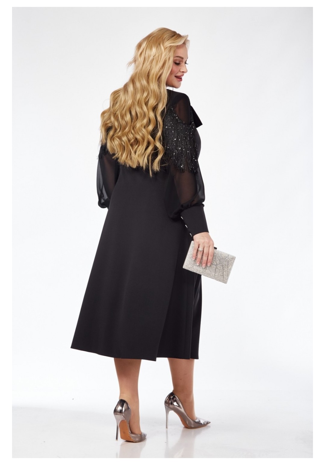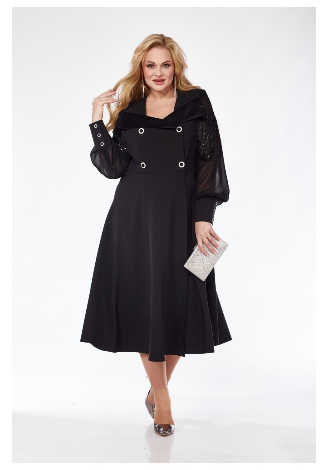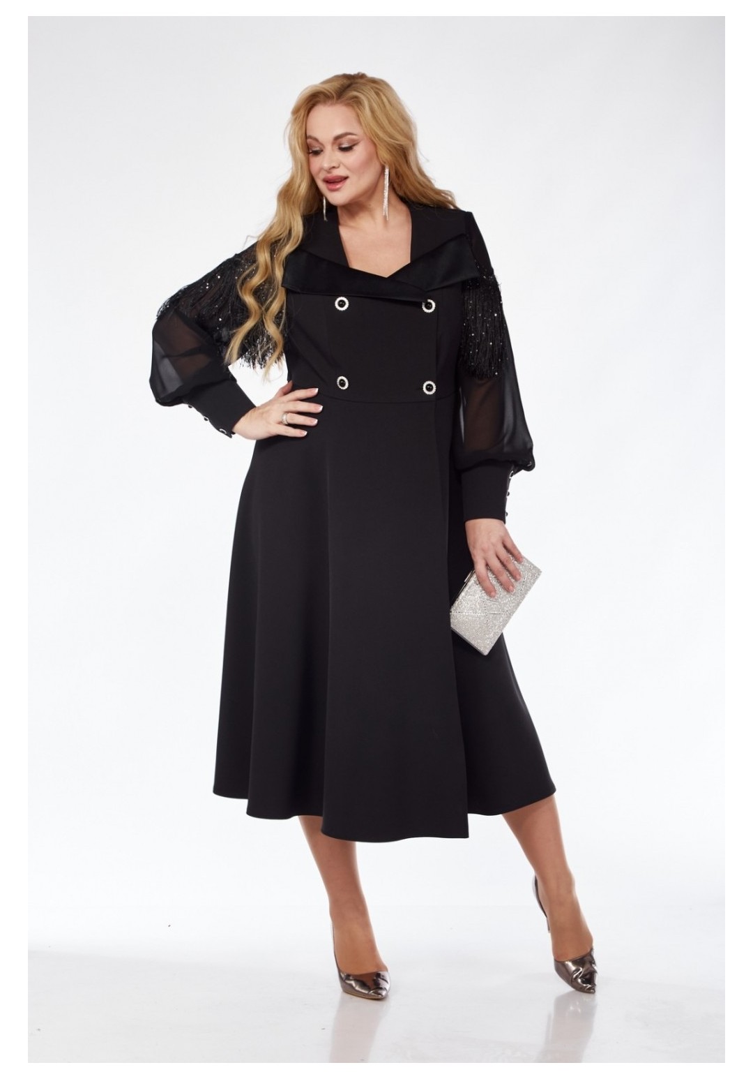 Платье с отрезным по талии лифом, фигурным декольте спереди и с двубортной застёжкой на петли-пуговицы. Рукава втачные из шифона, с высокими манжетами и со сборкой по низу. Вырез горловины декорирован лацканами из отделочной ткани, а поверх рукавов закреплена тесьма с бахромой. Низ платья с большим расширением. Лиф на подкладке. Изделие с плечевыми накладками.