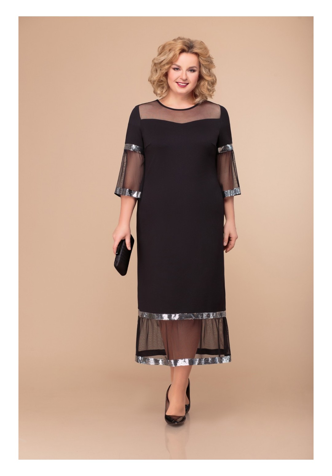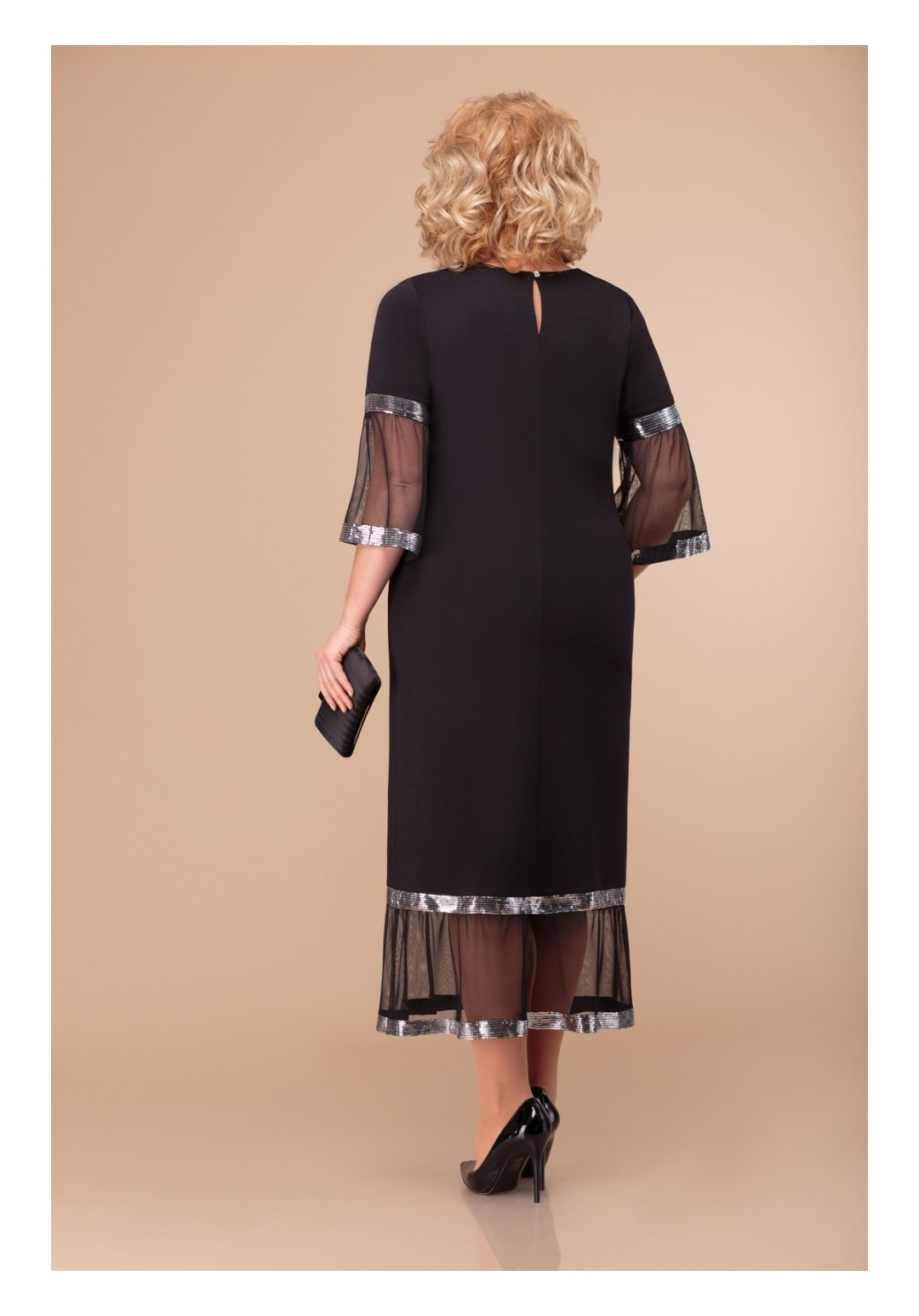 Платье женское полуприлегающего силуэта с втачным рукавом. Спинка со средним швом. По переду кокетка. По низу платья и рукава оборка из сетки. По шву притачивания оборок и низу рукавов и платья настрочена тесьма из пайеток. Длина платья 113 см Длина рукава 37 см