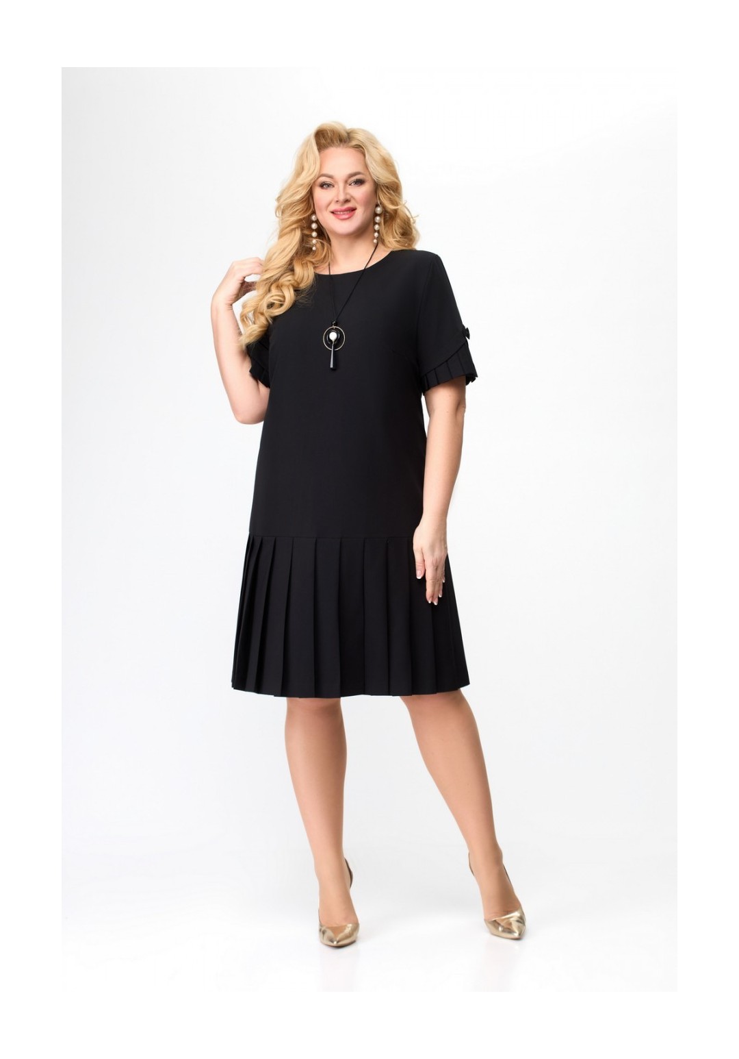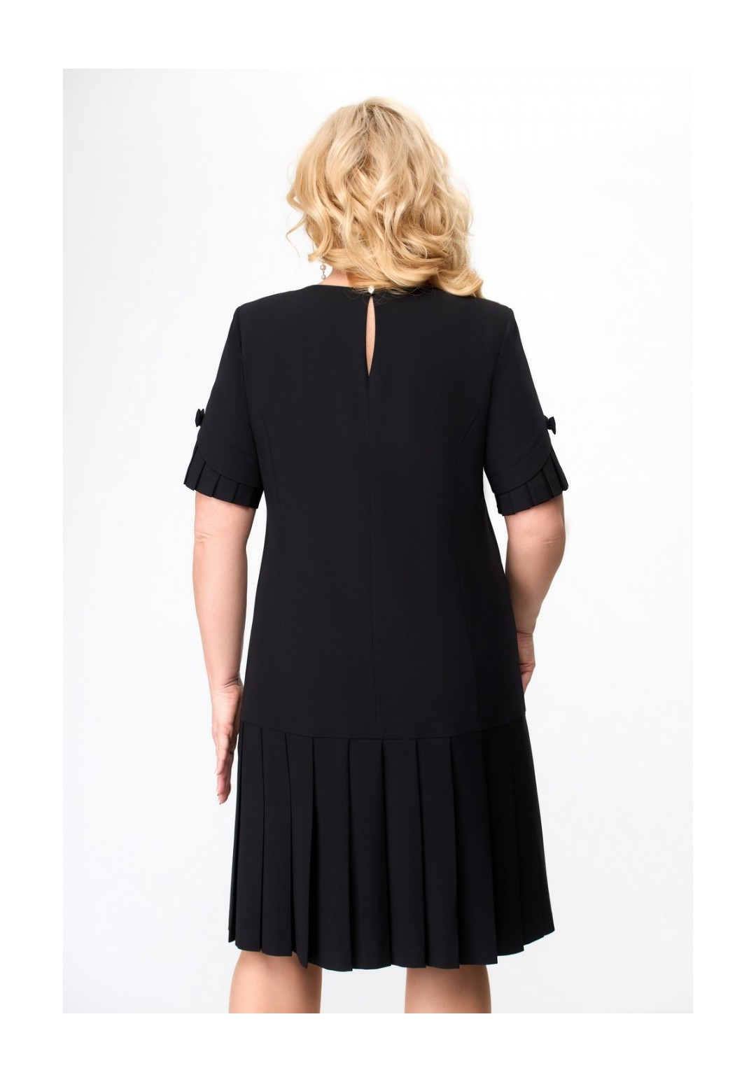 Платье полуприлегающего силуэта с коротким втачным рукавом. Спинка платья со средним швом. По низу платья и рукавов односторонние складки.Украшение в комплект не входит.