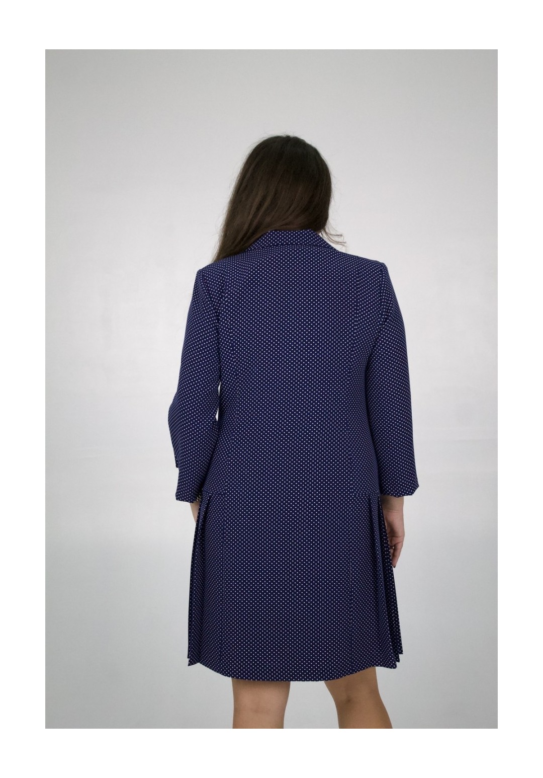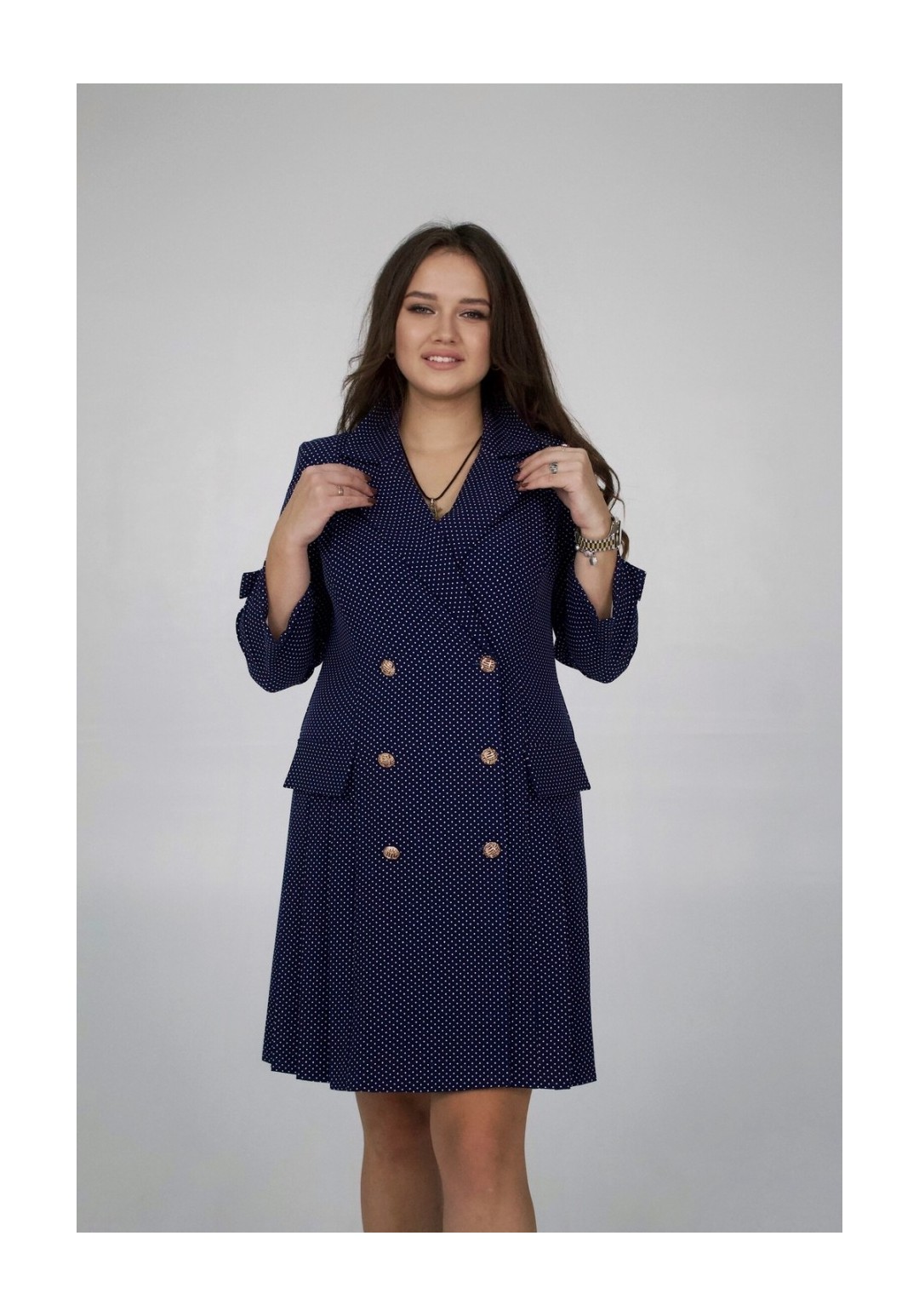 Платье женское полуприлегающего силуэта, двубортное, с втачным рукавом. По горловине классический воротник с лацканами. Перед и спинка с вертикальными рельефами от плечевого шва. По бокам односторонние складки. По переду декоративные клапаны. Рукав длиной 7/8, по низу декоративная пата с пуговицей. Фурнитура (пуговицы) может меняться от наличия. Длина платья по спинке: 101 см Длина рукава: 51 см