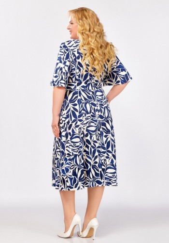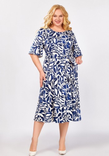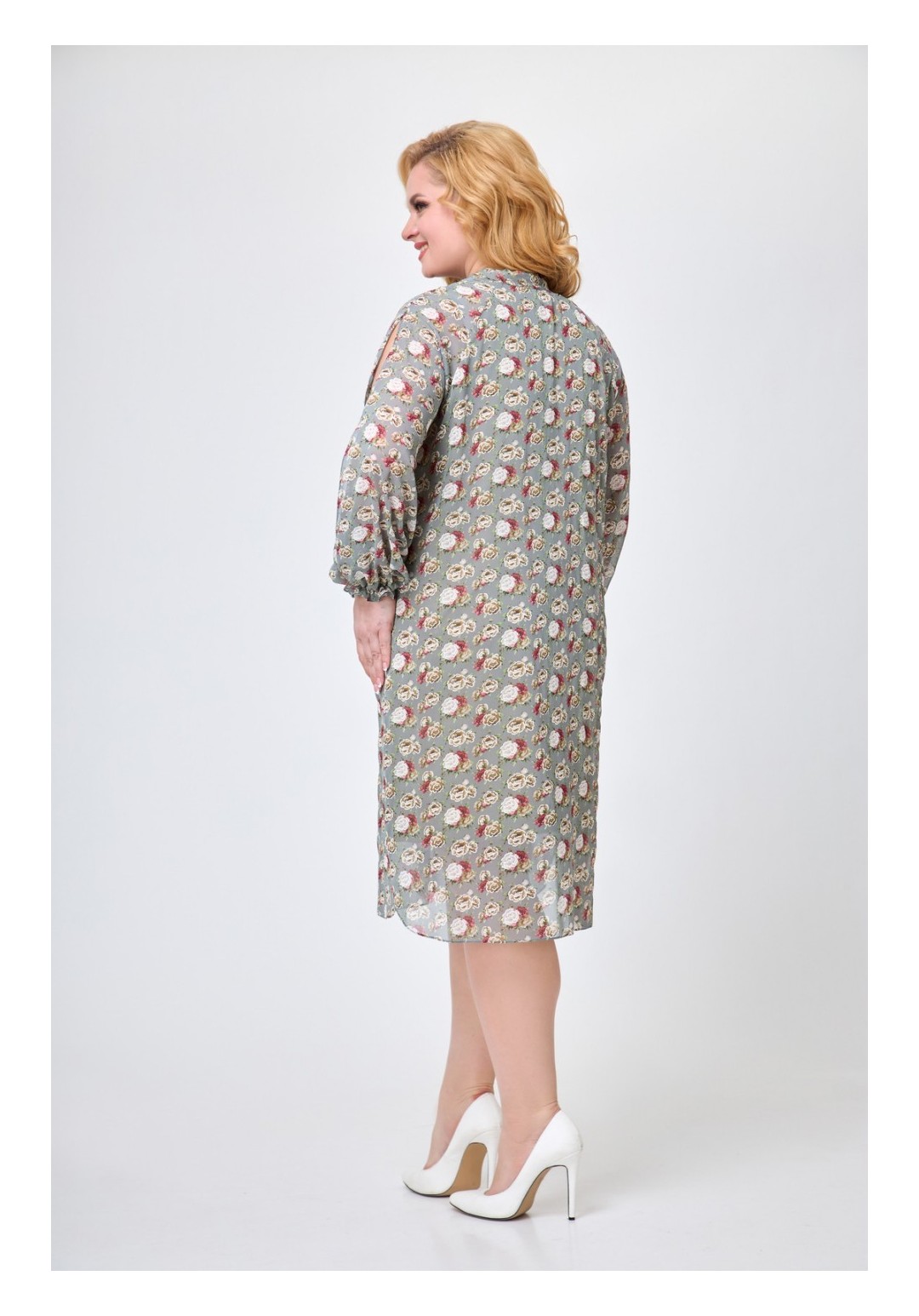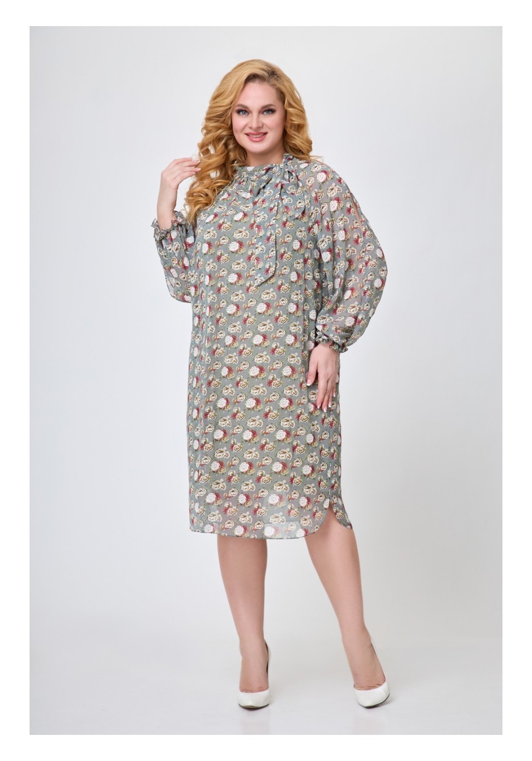 Платье женское, свободного силуэта, слегка расширенное книзу. Горловина переда с декоративной сборкой, с втачным воротником-стойкой, переходящим в бант. Рукав длинный, типа реглан, с вертикальными разрезами по центру. Низ рукава присборен на эластичную тесьму. Платье длиной ниже уровня колена, с закруглением по боковым швам. Платье на притачной подкладке. Длина по спинке 103 см Длина рукава от высшей точки горловины 75 см