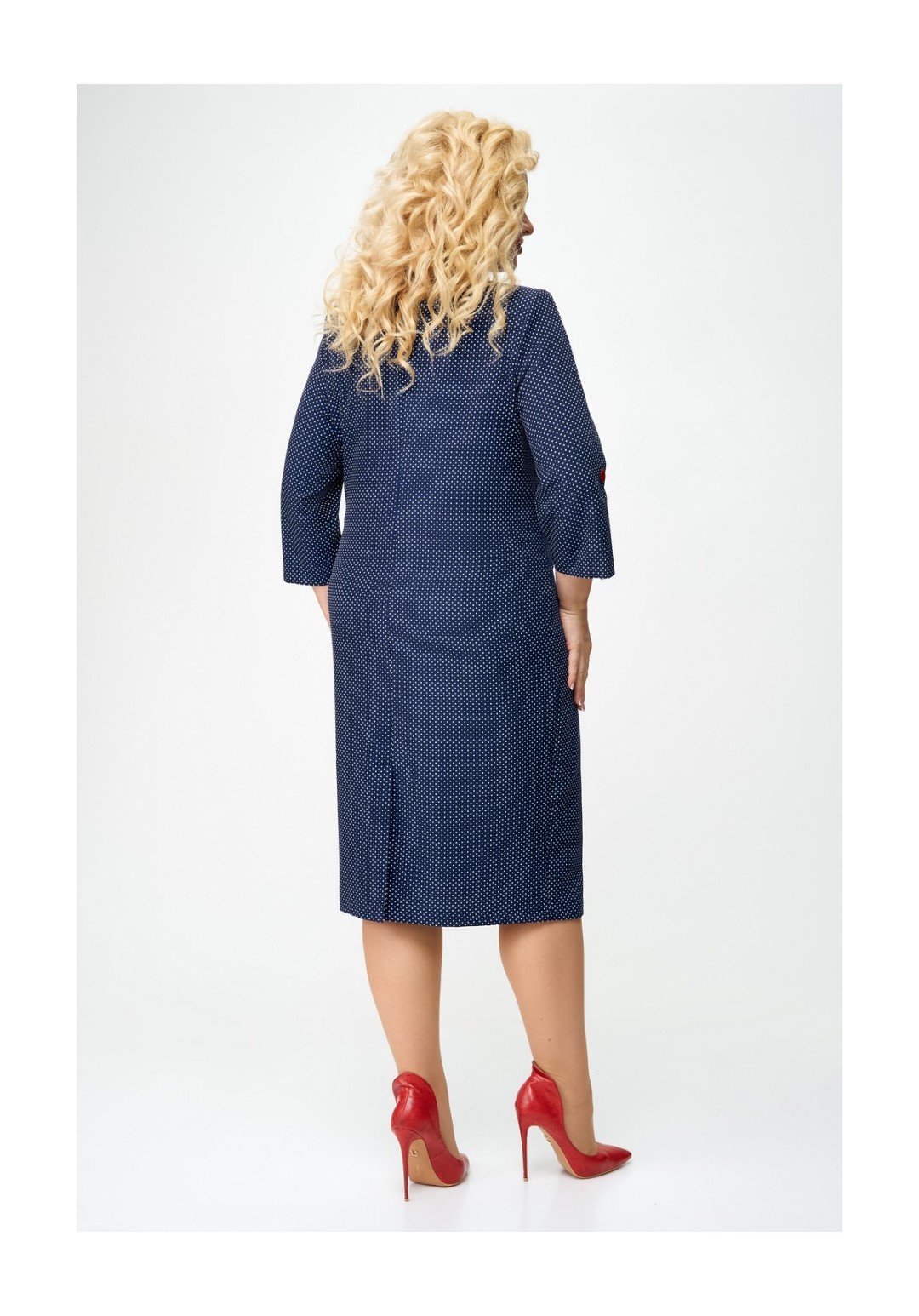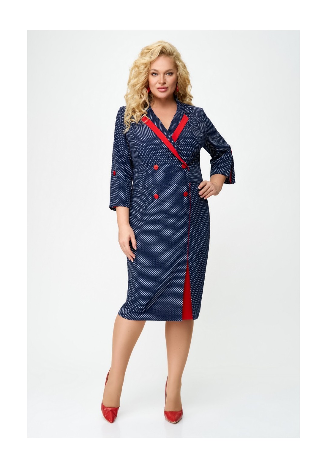 Платье женское полуприлегающего силуэта, с имитацией двубортной застежки, с пиджачным воротником. Перед отрезной по линии талии. Верхняя часть с рельефами от плечевого шва, нижняя часть с талиевыми вытачками, встречной складкой. Спинка со средним швом, по низу шлица. Рукав втачной, длиной ¾, из двух частей по низу встречная складка. Фурнитура (пуговицы) может меняться от наличия. Длина середины спинки: 105 см Длина рукава: 47 см
